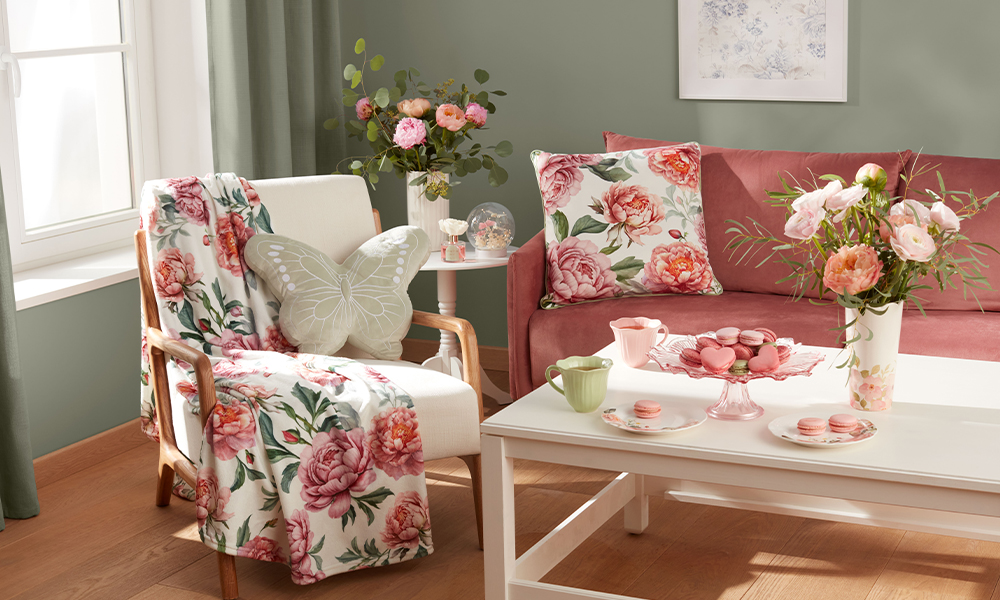 Para decorar um apartamento estiloso com um padrão floral de peónias, só precisas de alguns elementos decorativos para corroar o seu arranjo. Estes padrões são mais bem utilizados em pormenores e realces. Um elemento acentuado numa base simples terá um aspeto leve, fresco e elegante. Na sala de estar e no quarto, o ambiente acolhedor será criado por almofadas, mantas com padrões florais. Procure uma variedade de texturas que convidem para o toque e os mimos com materiais macios.