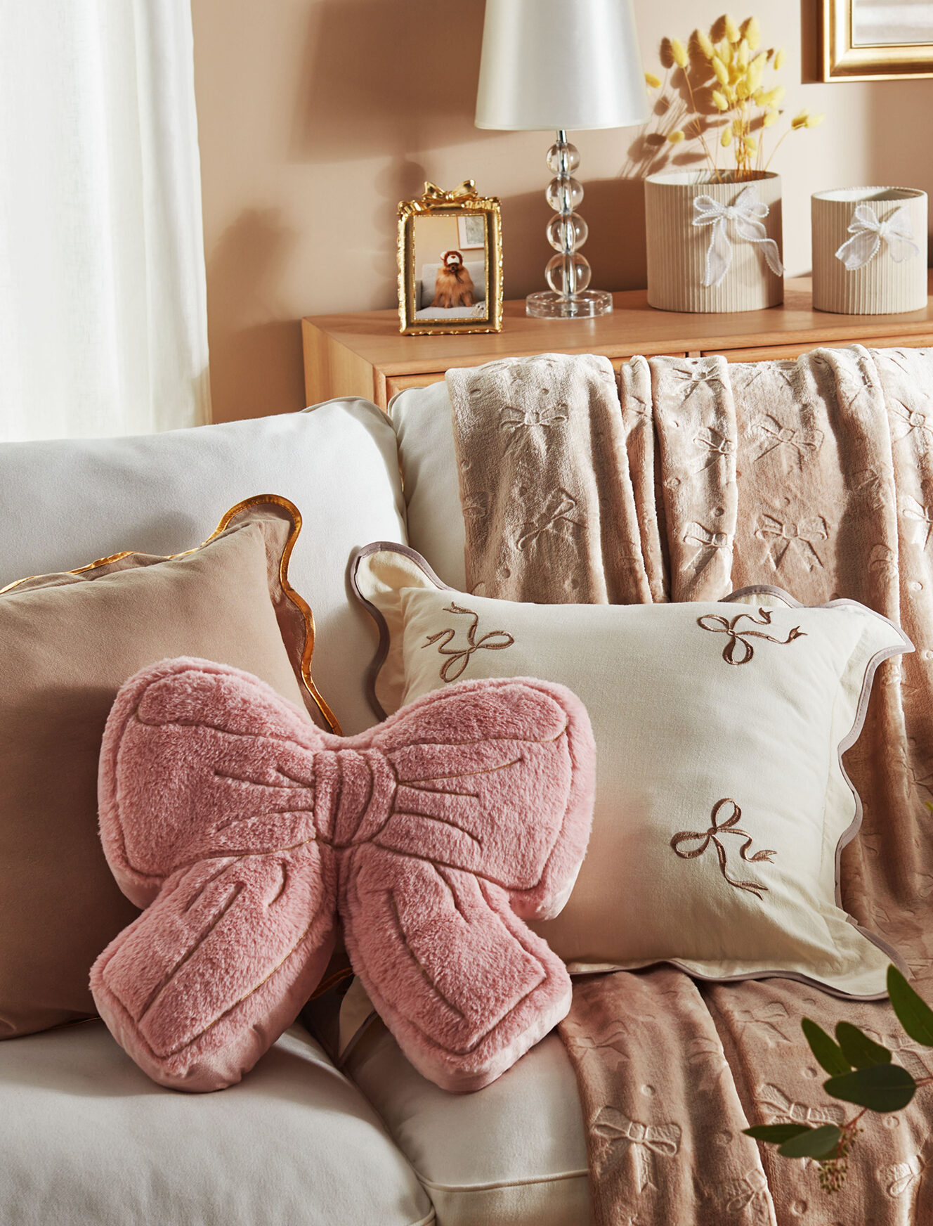 A almofada decorativa em forma de laço é macia e agradável ao toque. O design e cor encantadores destacam-se em qualquer espaço. Ótima para decorar a tua cama, sofá ou cadeirão da sala. O formato é perfeito para combinar com os acessórios da mesma coleção.
