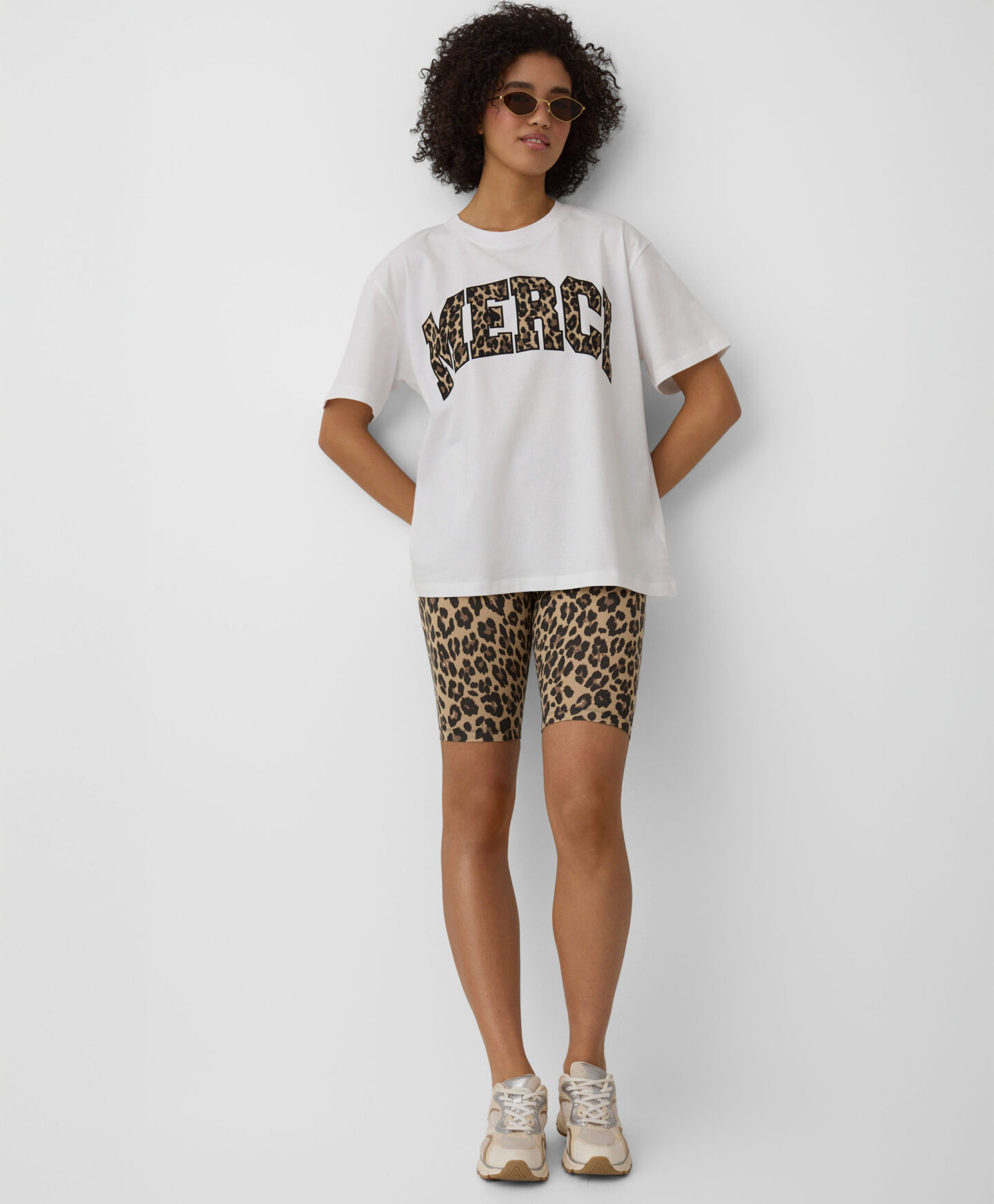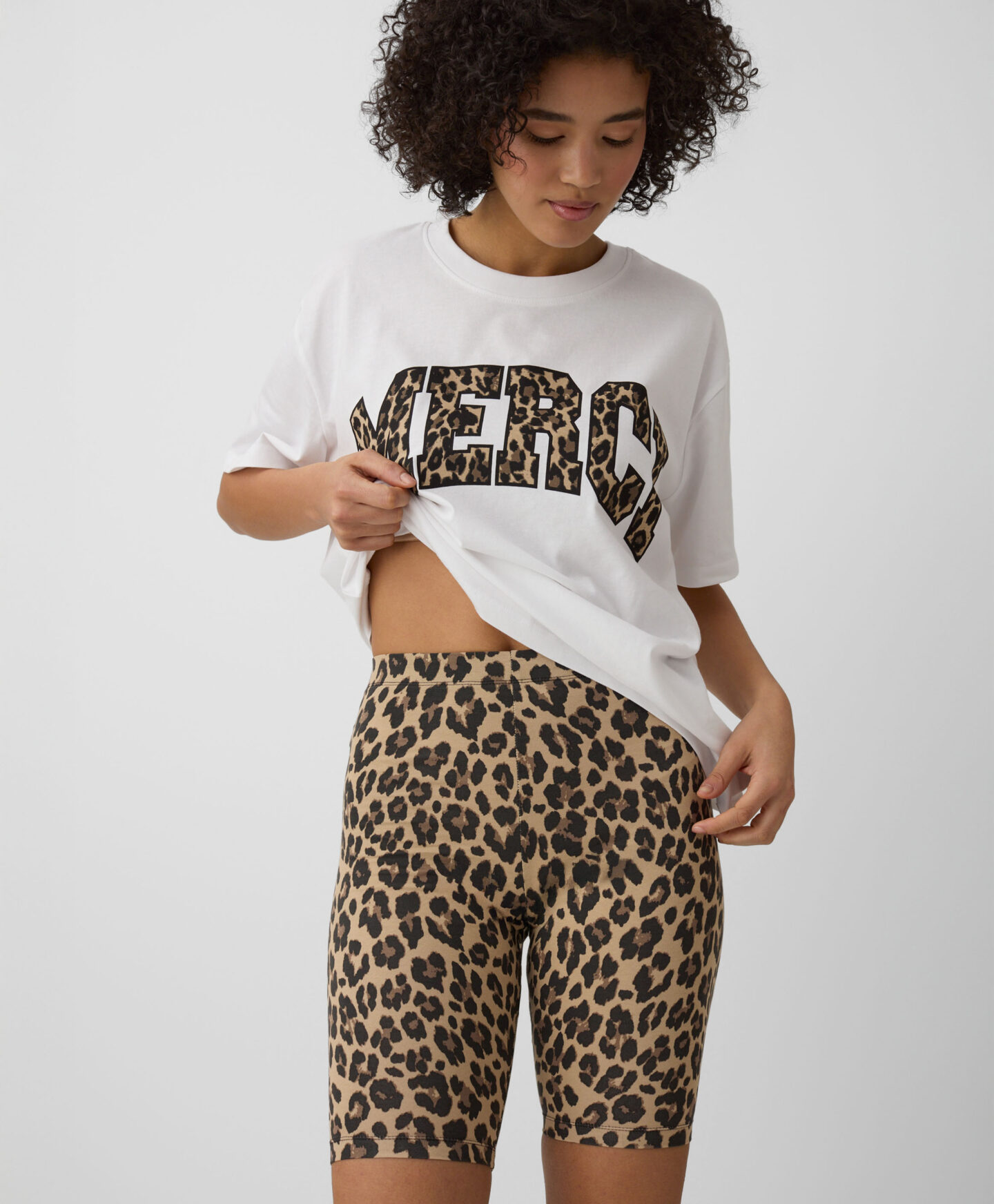 Os calções de ciclista com padrão leopardo, com elevado teor de algodão, são ideais para quem gosta de experimentar estilos diferentes e expressar personalidade através da moda. O toque de elastano garante conforto. O corte justo modela a silhueta, e a cintura alta alonga o look, garantindo conforto e liberdade de movimentos. Combina com t-shirts ou camisolas oversized para um look casual e moderno.