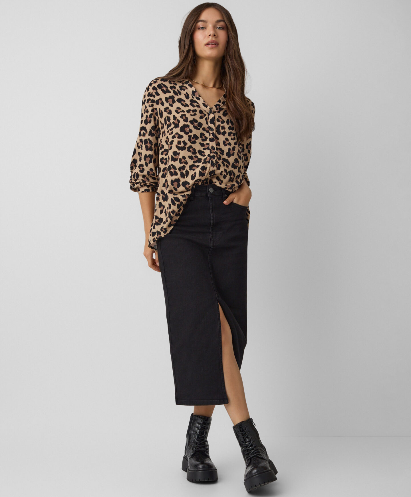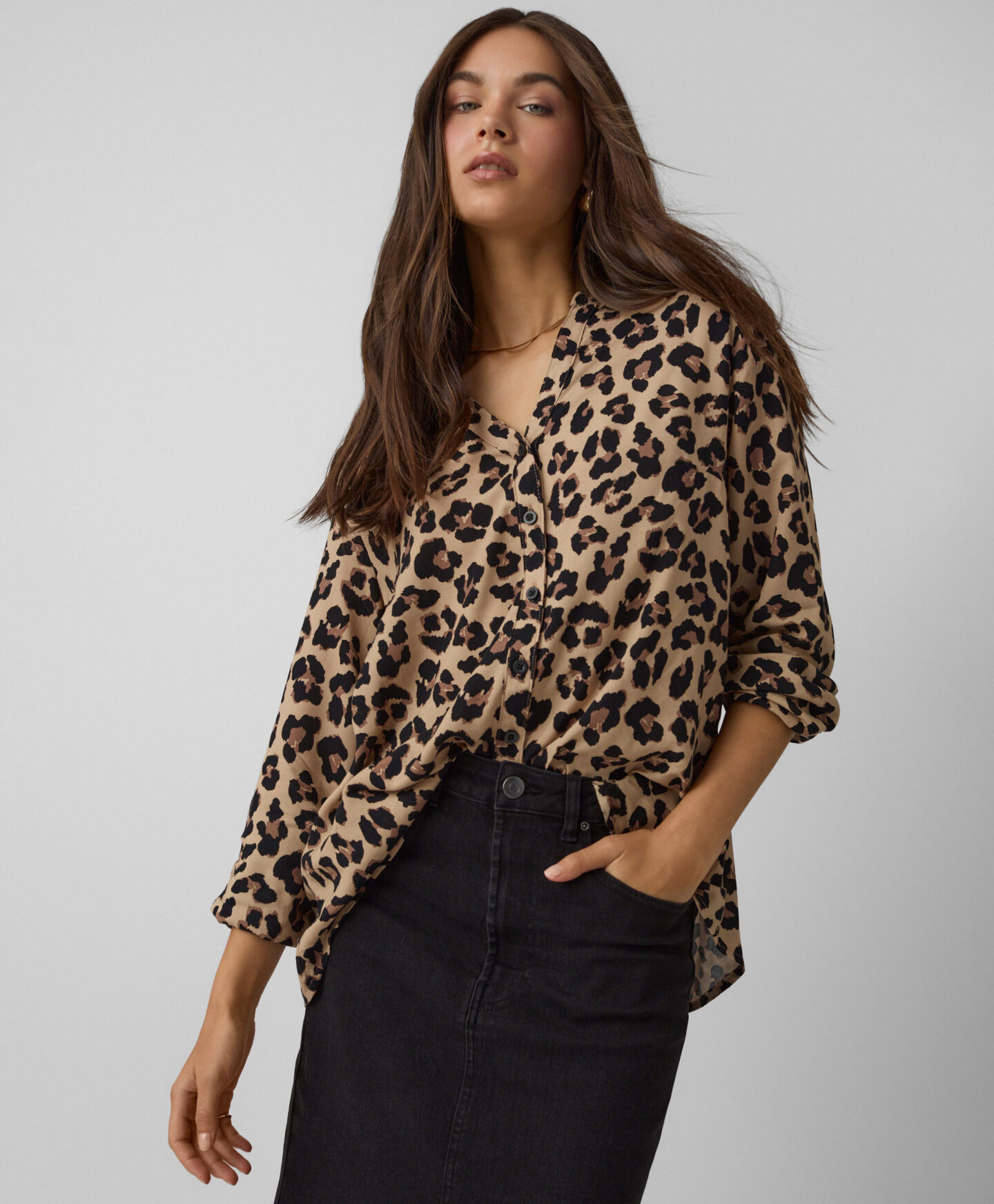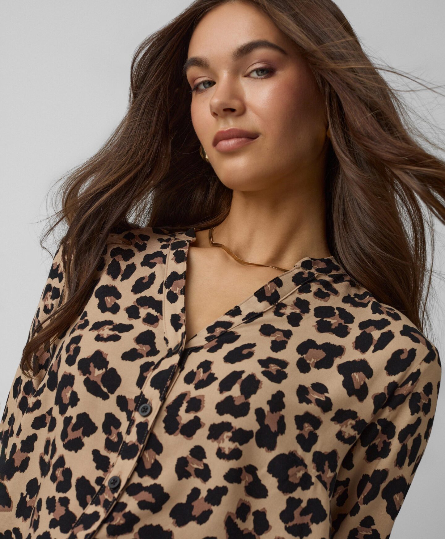 A camisa em 100% viscose é um toque elegante no teu guarda-roupa. É leve e respirável. Ideal para usar com um blazer ou uma camisola mais quente. O padrão irreverente distingue-se em qualquer look.
