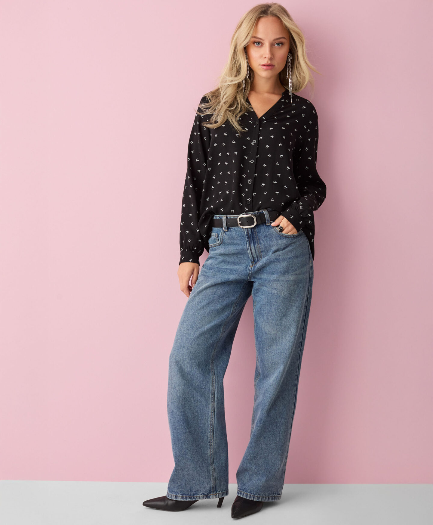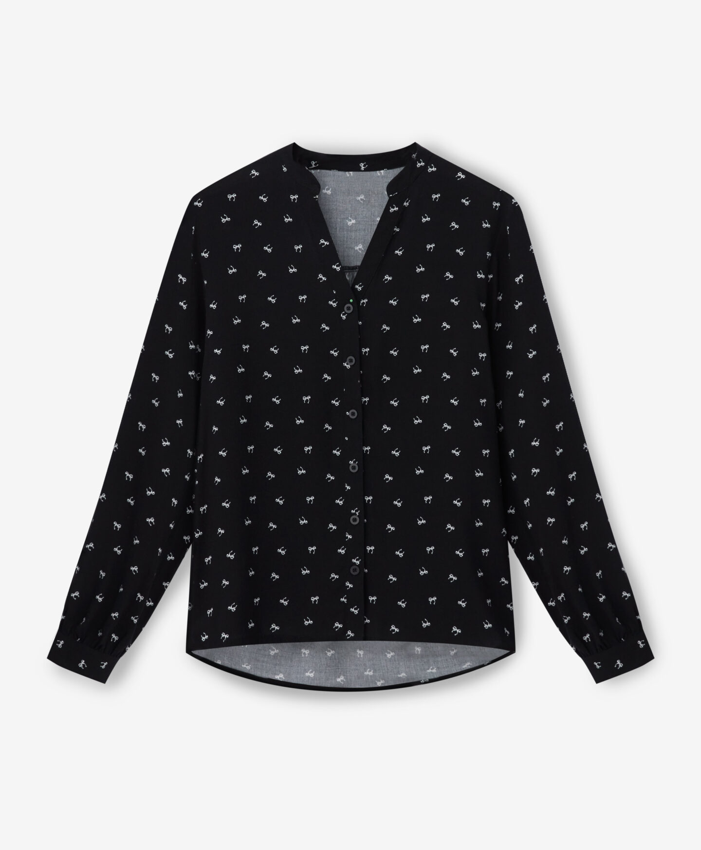 A camisa em 100% viscose cria um look encantador com um padrão de laços subtil. É leve, delicada e romântica. Perfeita não só para o dia a dia, mas também para ocasiões especiais. O material respirável torna-a numa escolha ideal para combinar com um blazer, camisola ou cardigan.