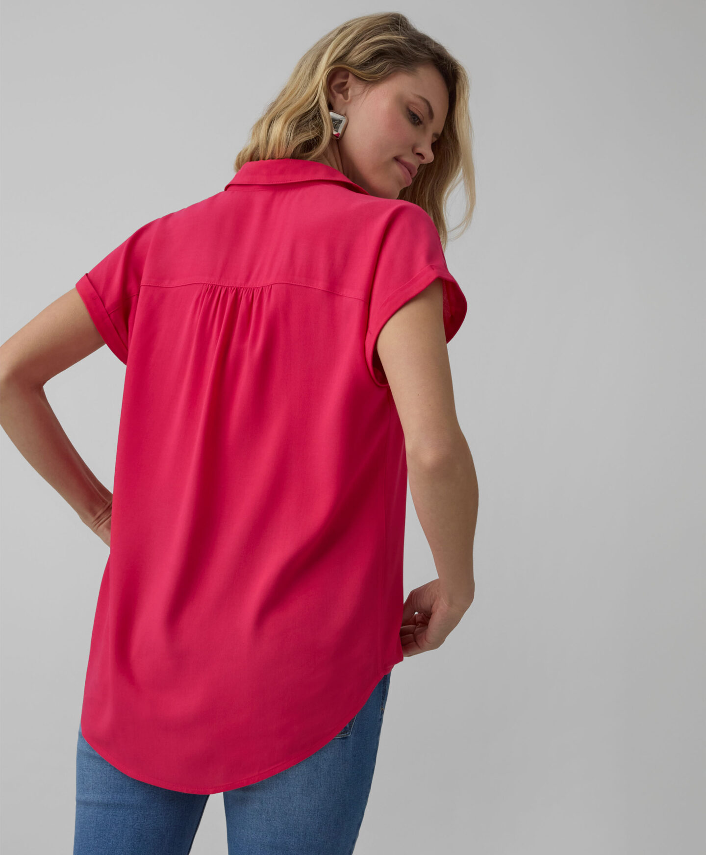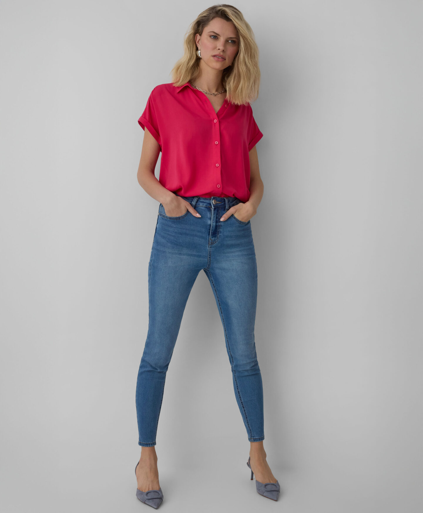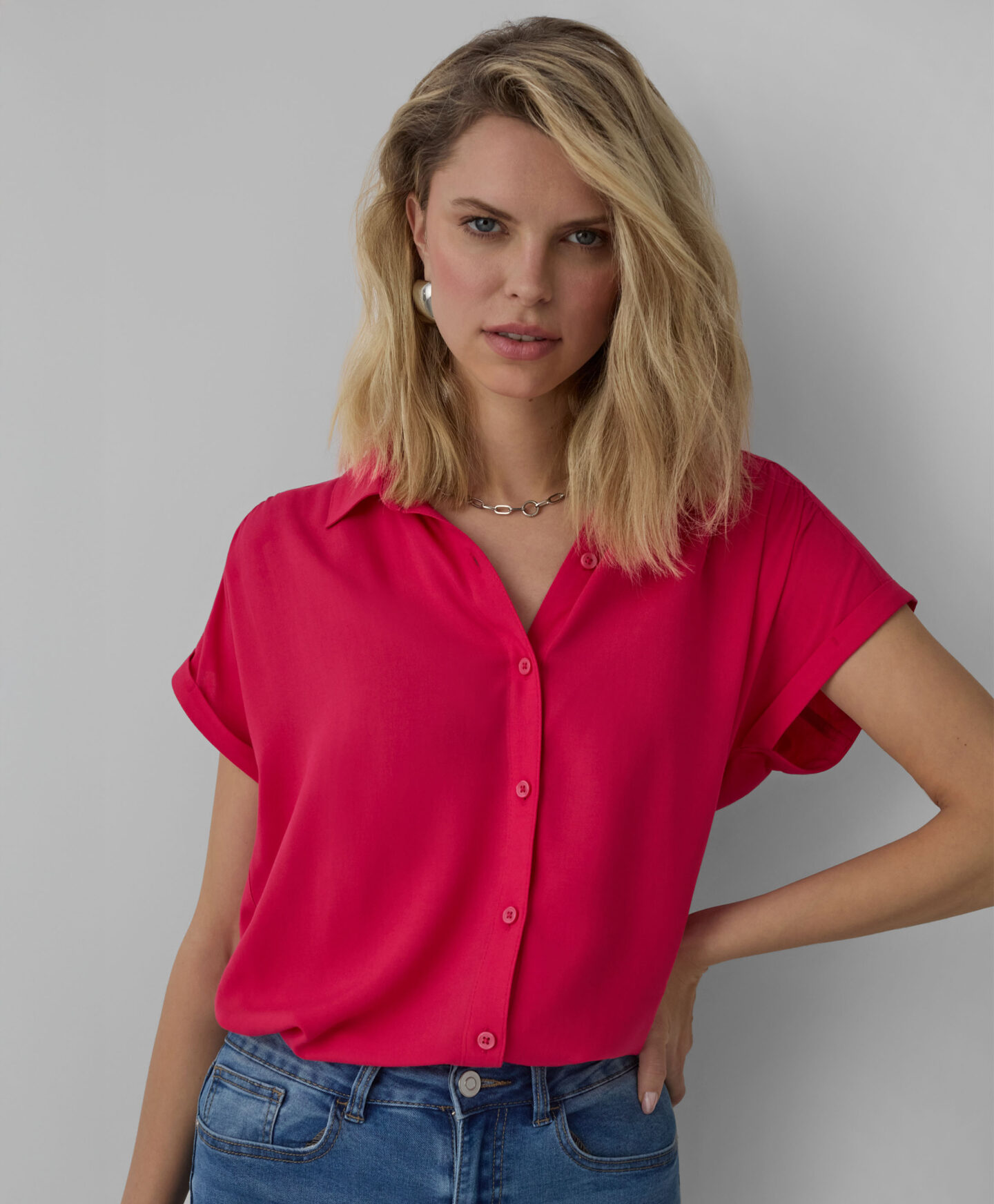 A camisa 100% viscose destaca-se pela sua cor alegre. Tem um corte confortável e fecho de pressão à frente e nas mangas. É leve, fluída e perfeita para looks em camadas. Não a deixes faltar no teu armário!