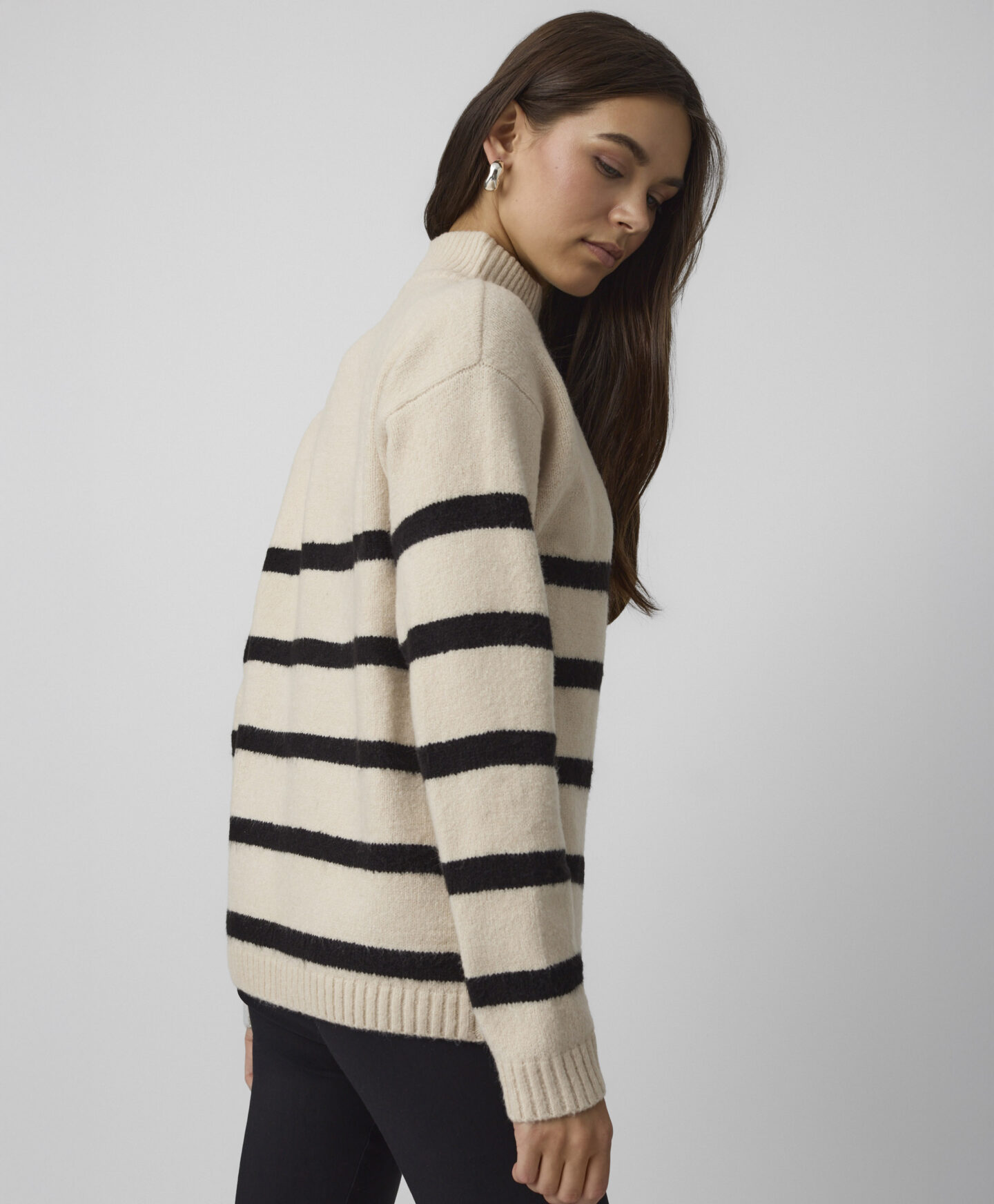 A camisola às riscas, com fecho, é a escolha perfeita para quem aprecia o estilo clássico com um toque moderno. É quente e macia, ideal para os primeiros dias de outono. O padrão intemporal é elegante – e é sempre tendência!