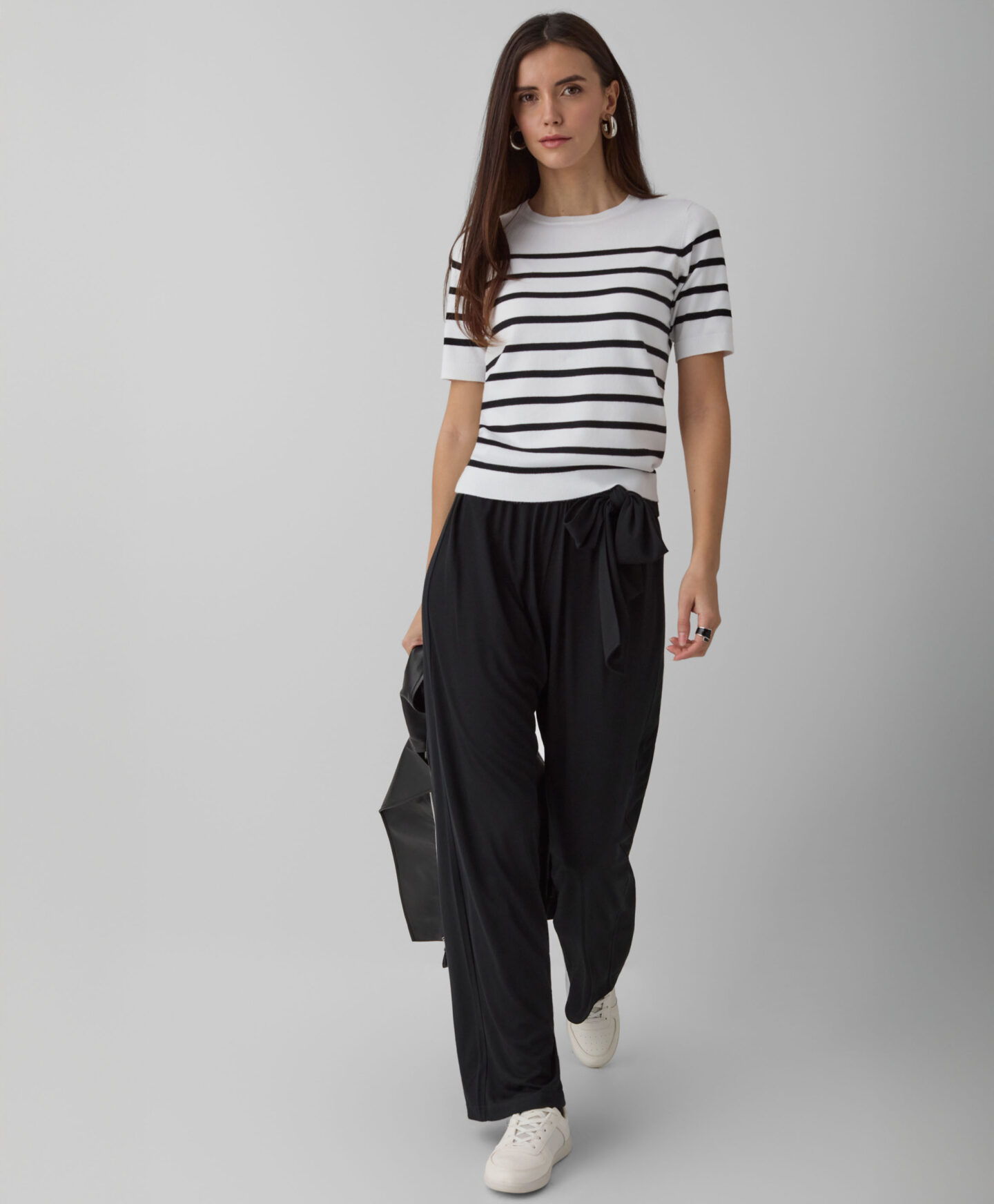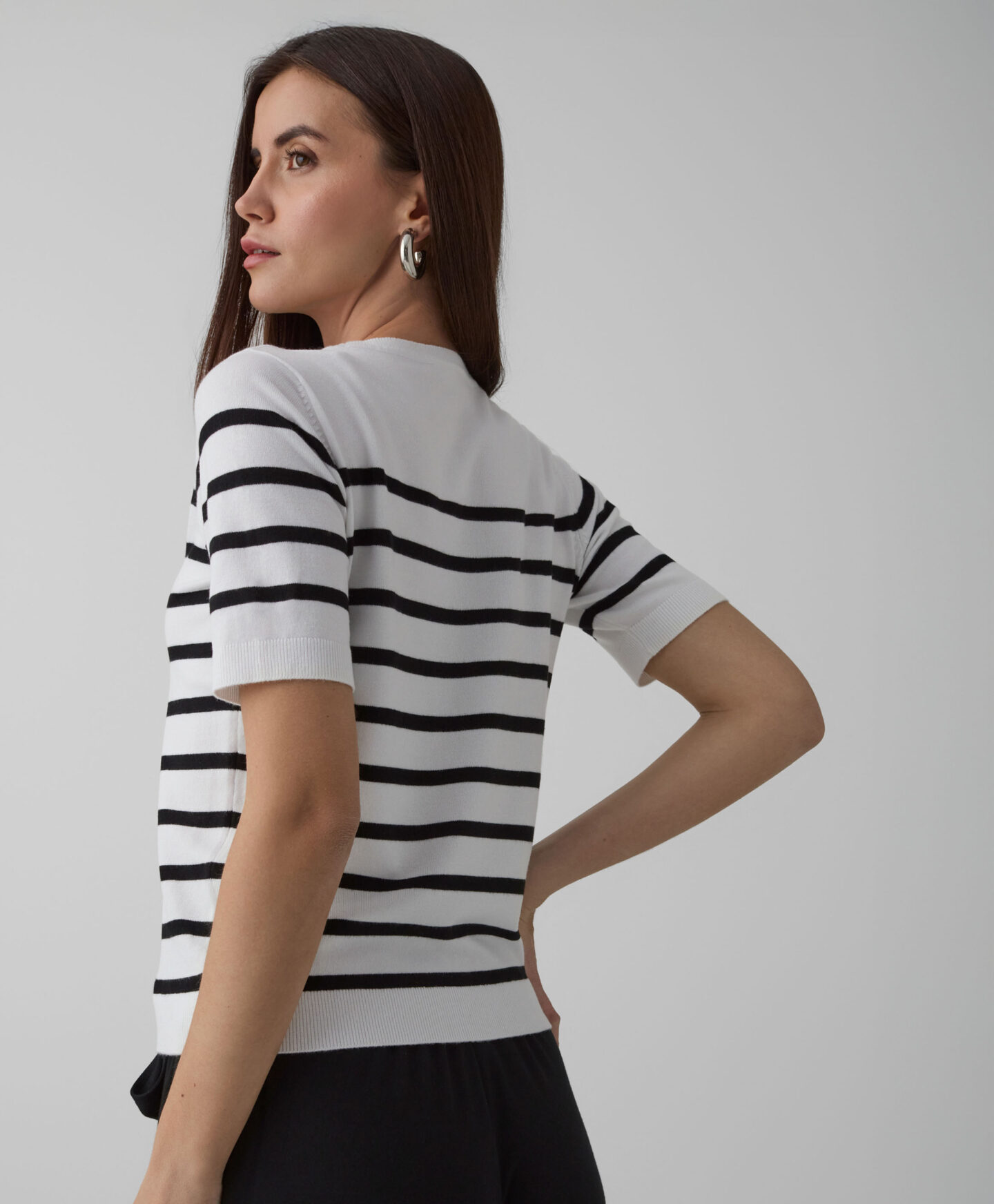 A camisola às riscas de manga curta é um essencial no guarda-roupa. Perfeita para meia estação. O padrão clássico de riscas vai combinar na perfeição com a maior parte das roupas no teu armário.