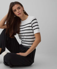 A camisola às riscas de manga curta é um essencial no guarda-roupa. Perfeita para meia estação. O padrão clássico de riscas vai combinar na perfeição com a maior parte das roupas no teu armário.