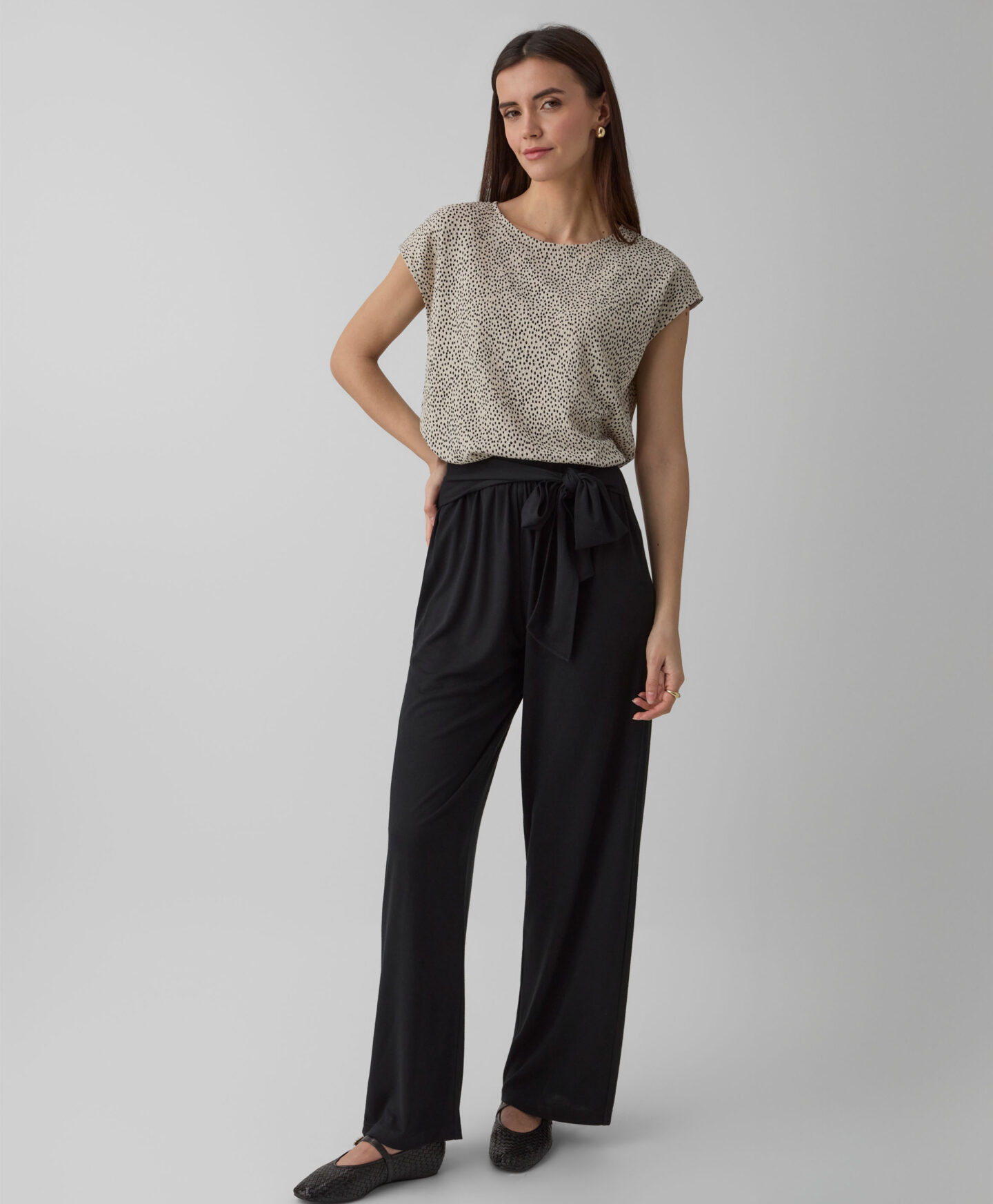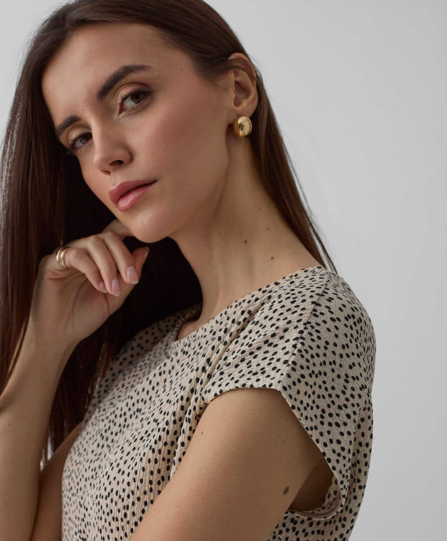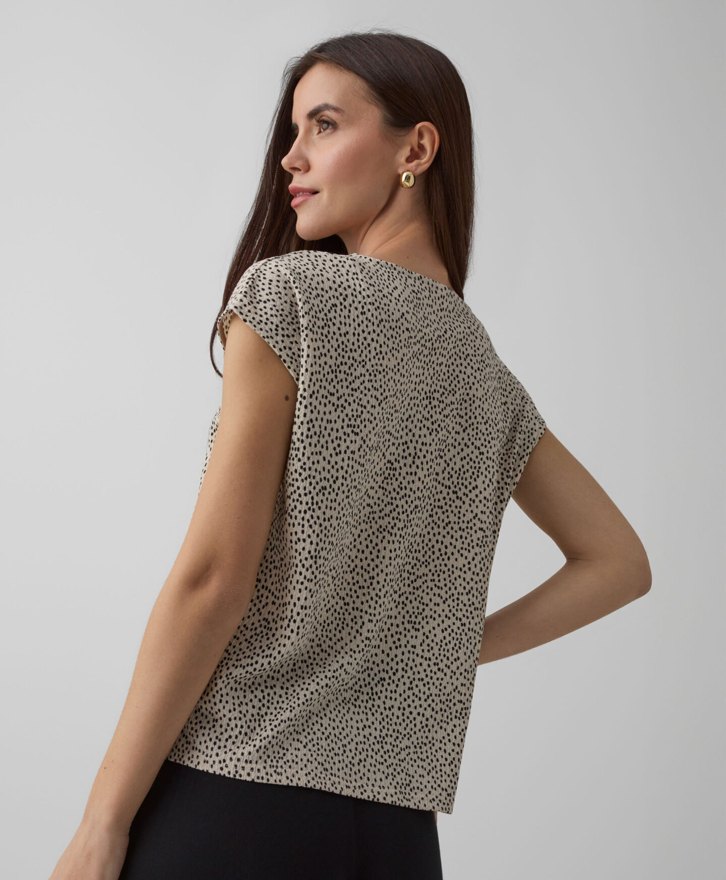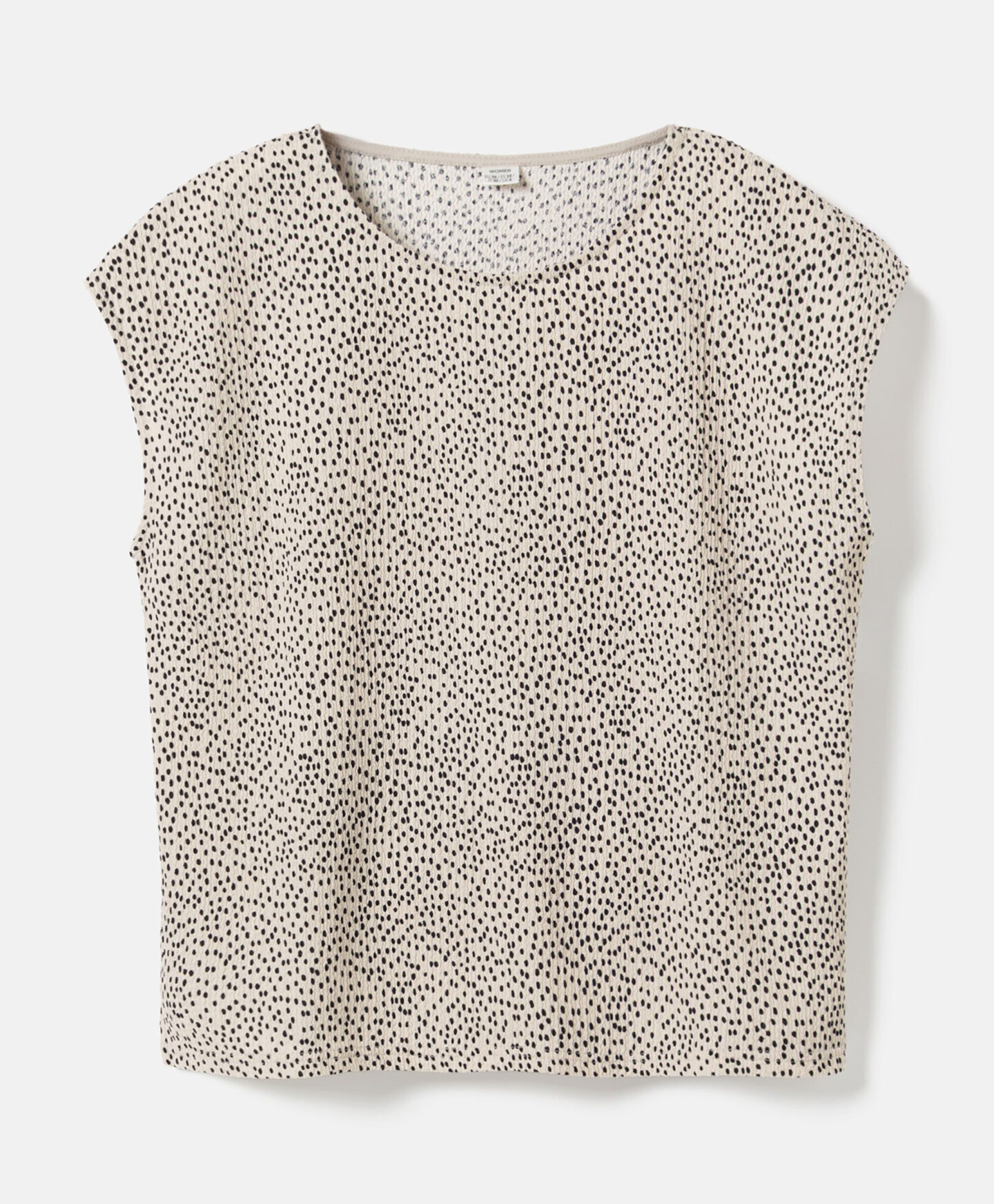 A camisola com padrão amassado faz conjunto com a saia da coleção. Contudo ainda a podes conjugar com as tuas calças de eleição. A manga curta torna-a perfeita para looks em camada nas meias estações. Fica linda com um casaco clássico ou de malha.