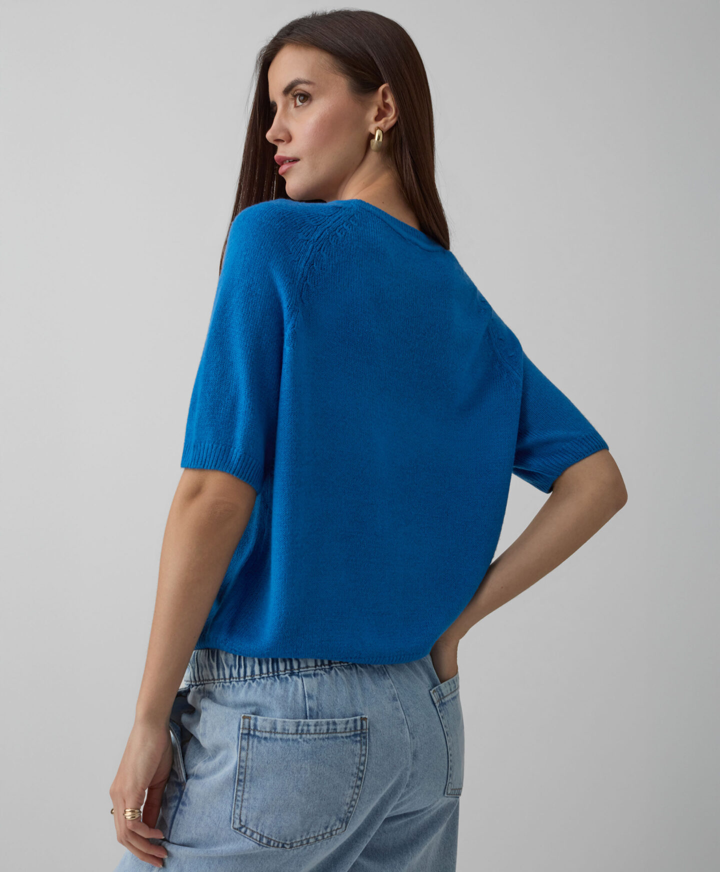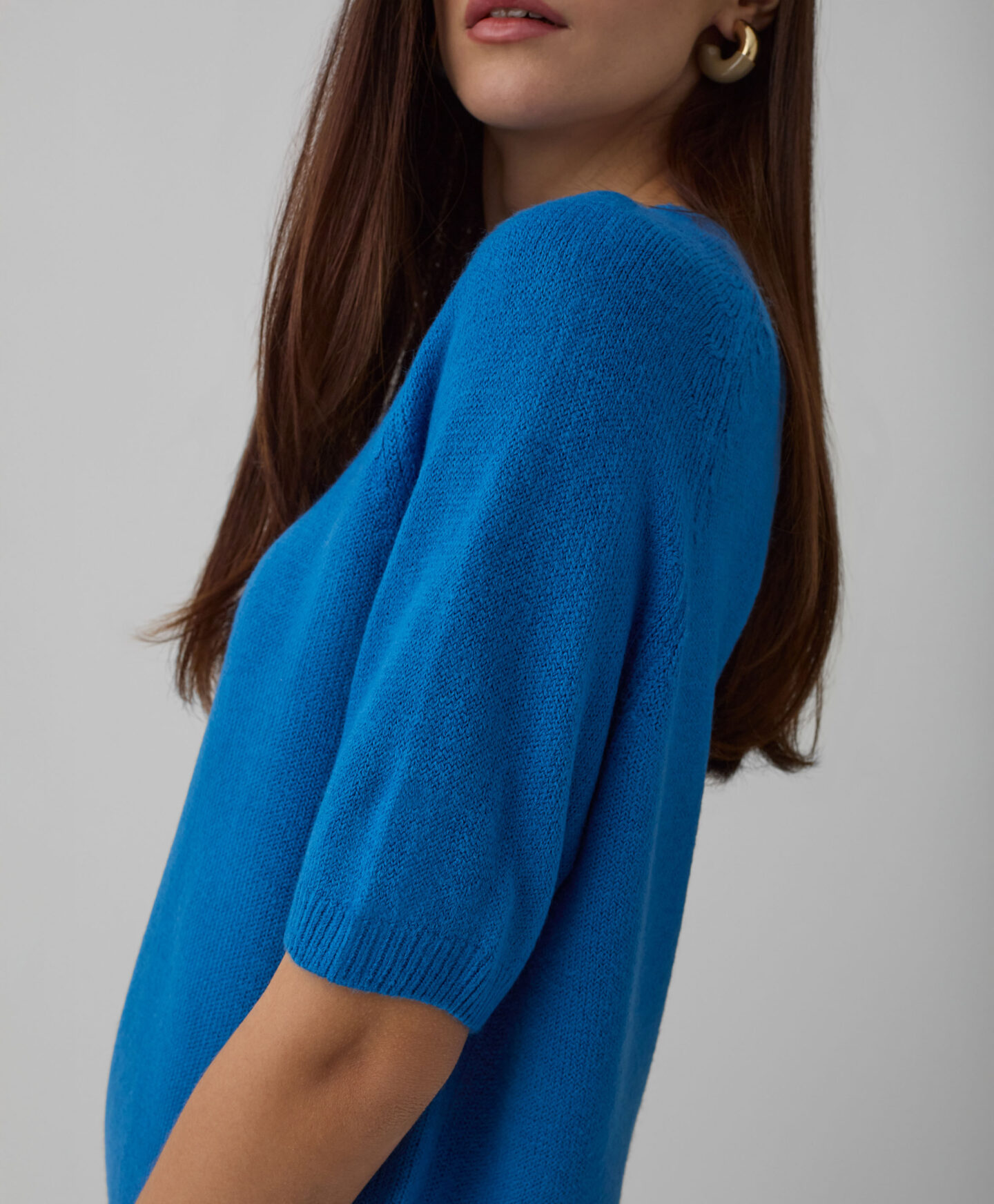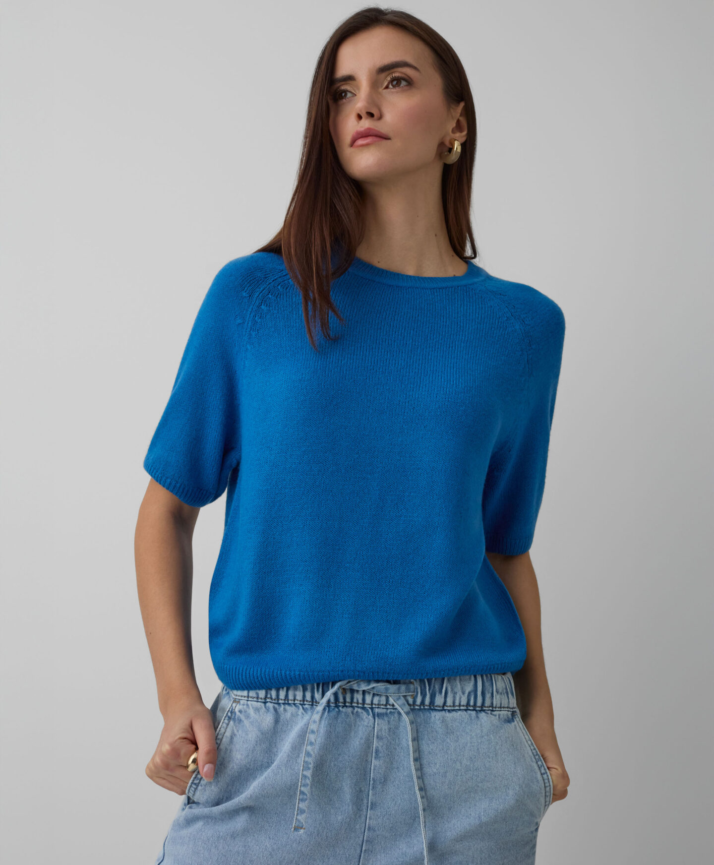 A camisola com manga curta num lindo azul cobalto vai trazer luz a qualquer conjunto. A manga curta é perfeita para meia estação. Podes usar a camisola sozinha ou combiná-la com um casaco. É confortável, suave para a pele e super versátil.