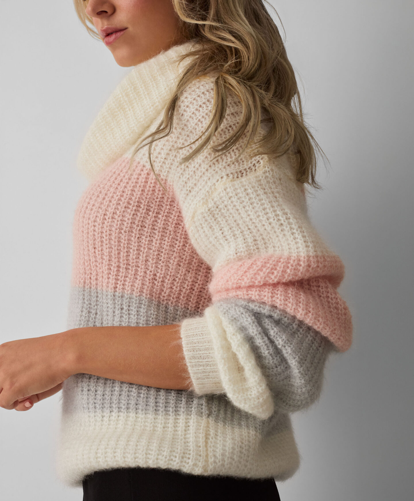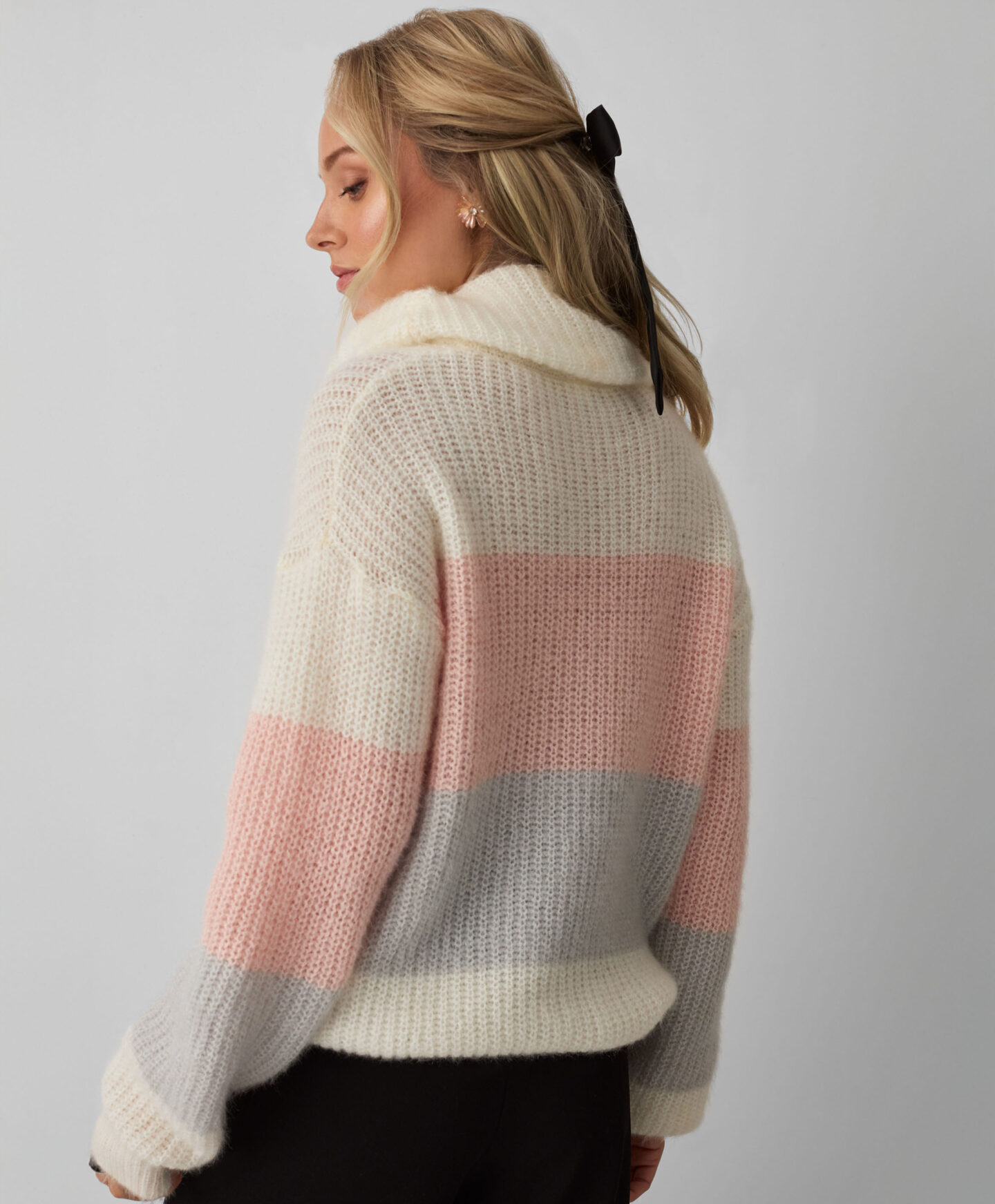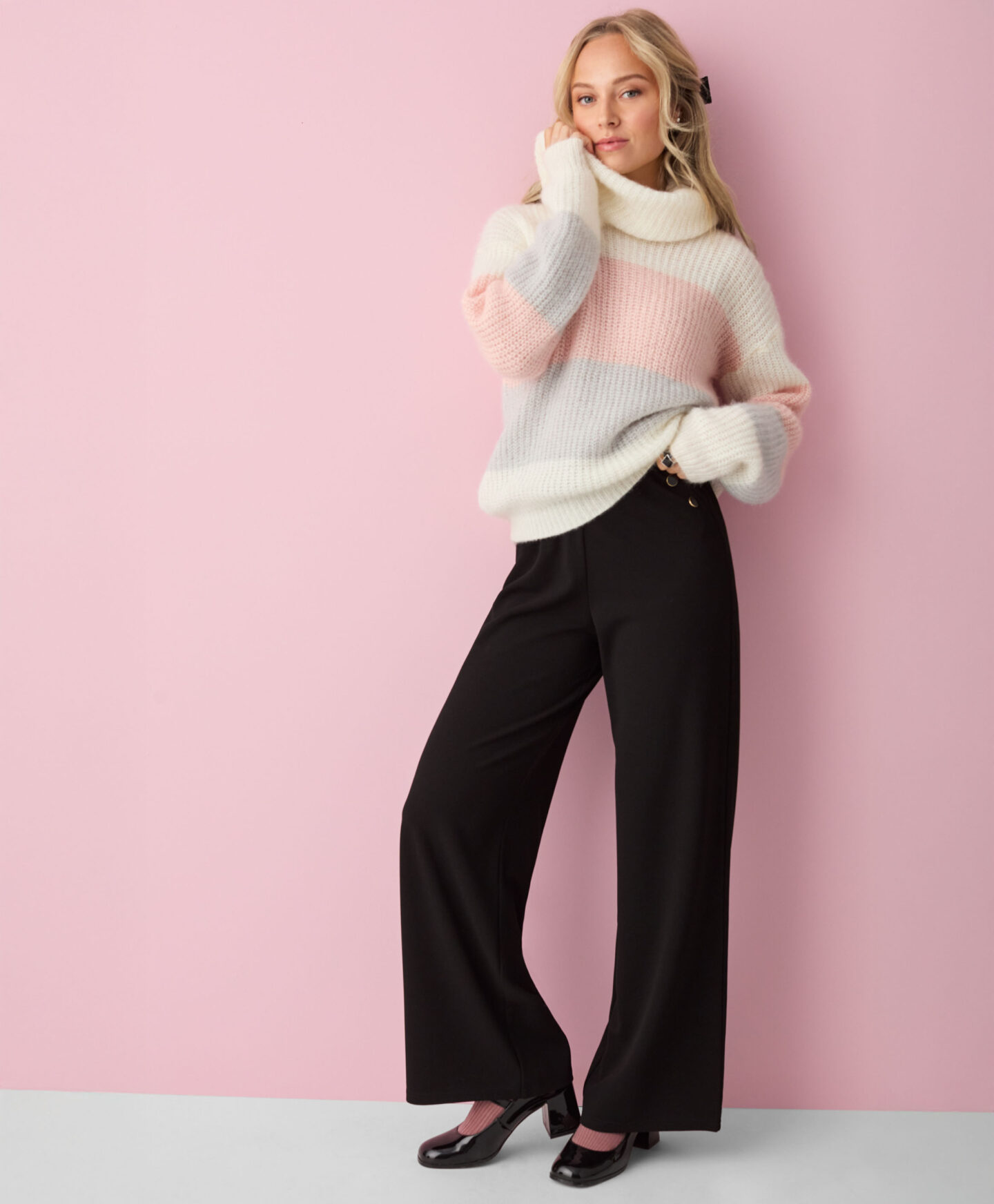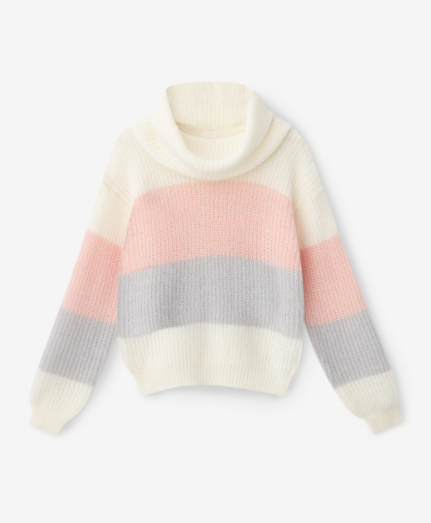 A camisola às riscas, de gola alta, irá ser a melhor aliada para os dias frios. É quente, macia ao toque e confortável de usar. O padrão em tons pastel marca a diferença no look. Combina com calças elegantes, de ganga ou fato de treino.