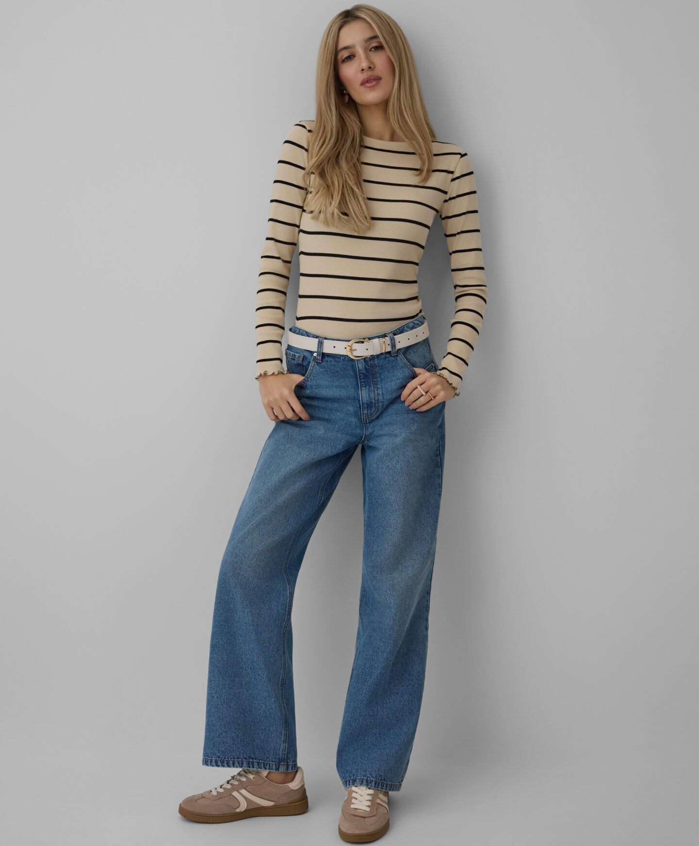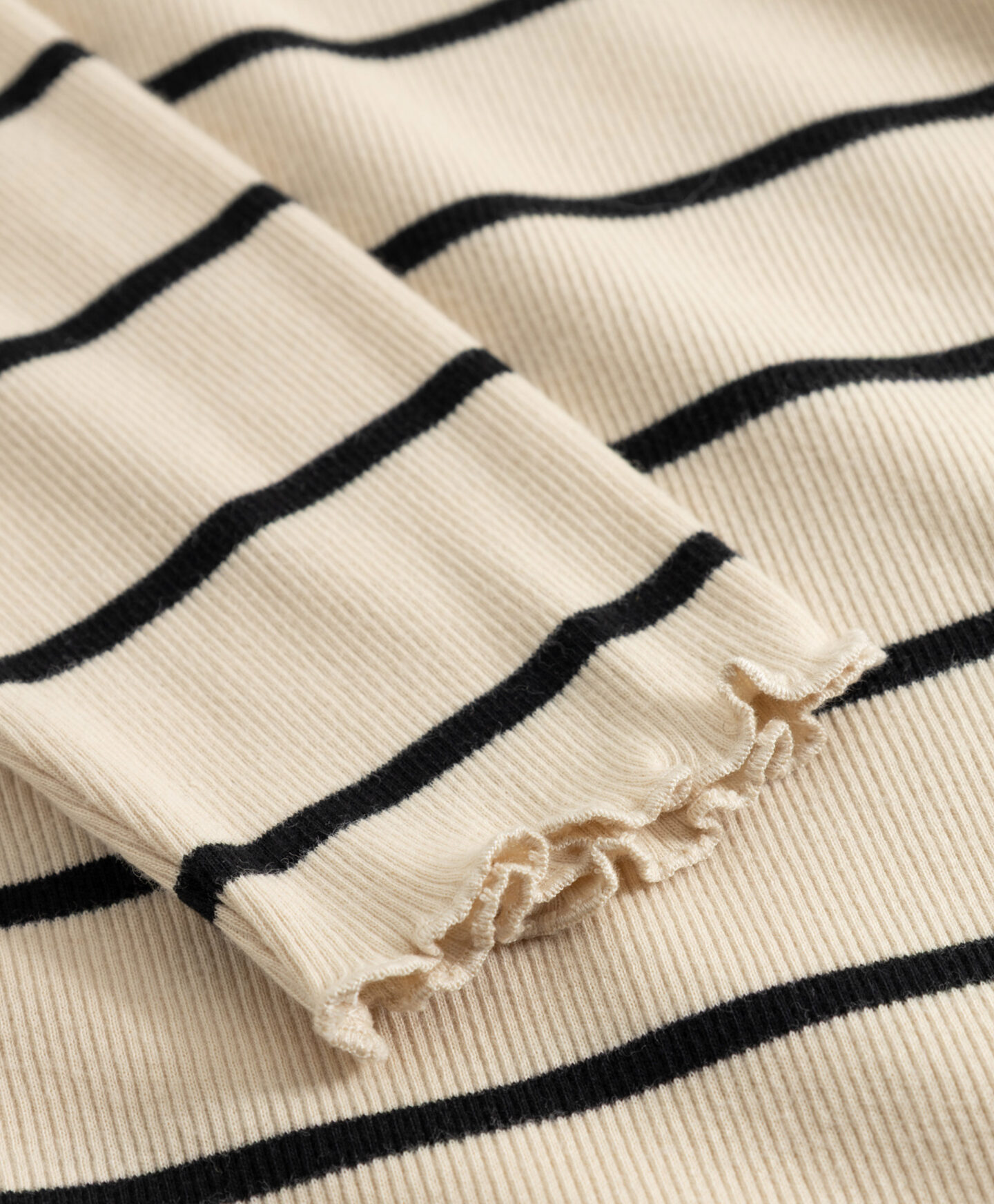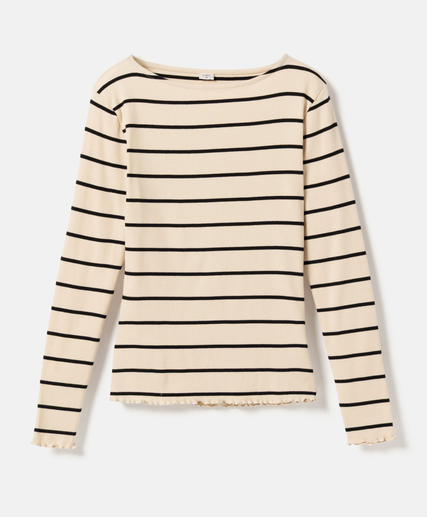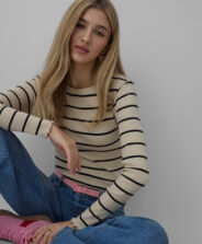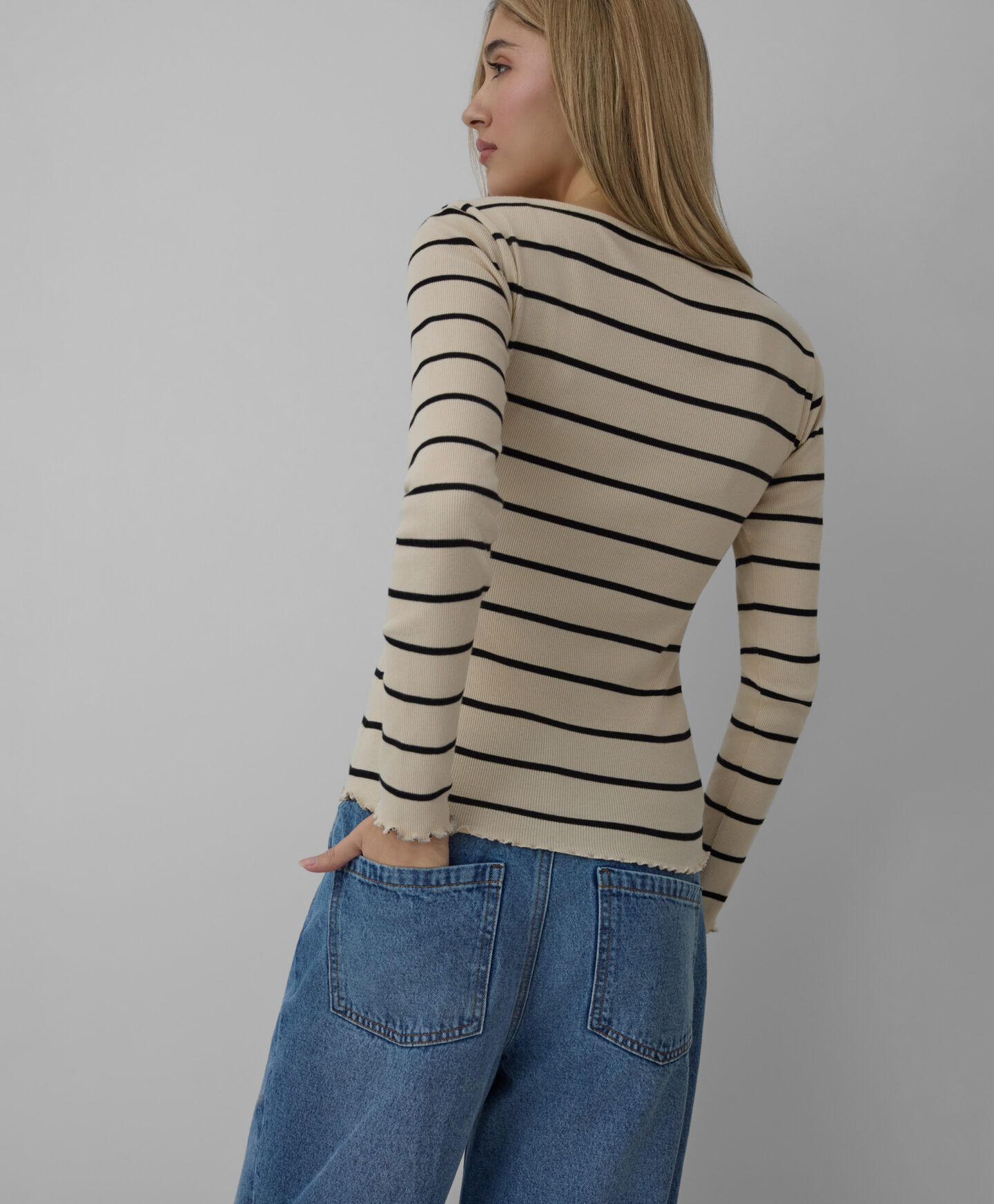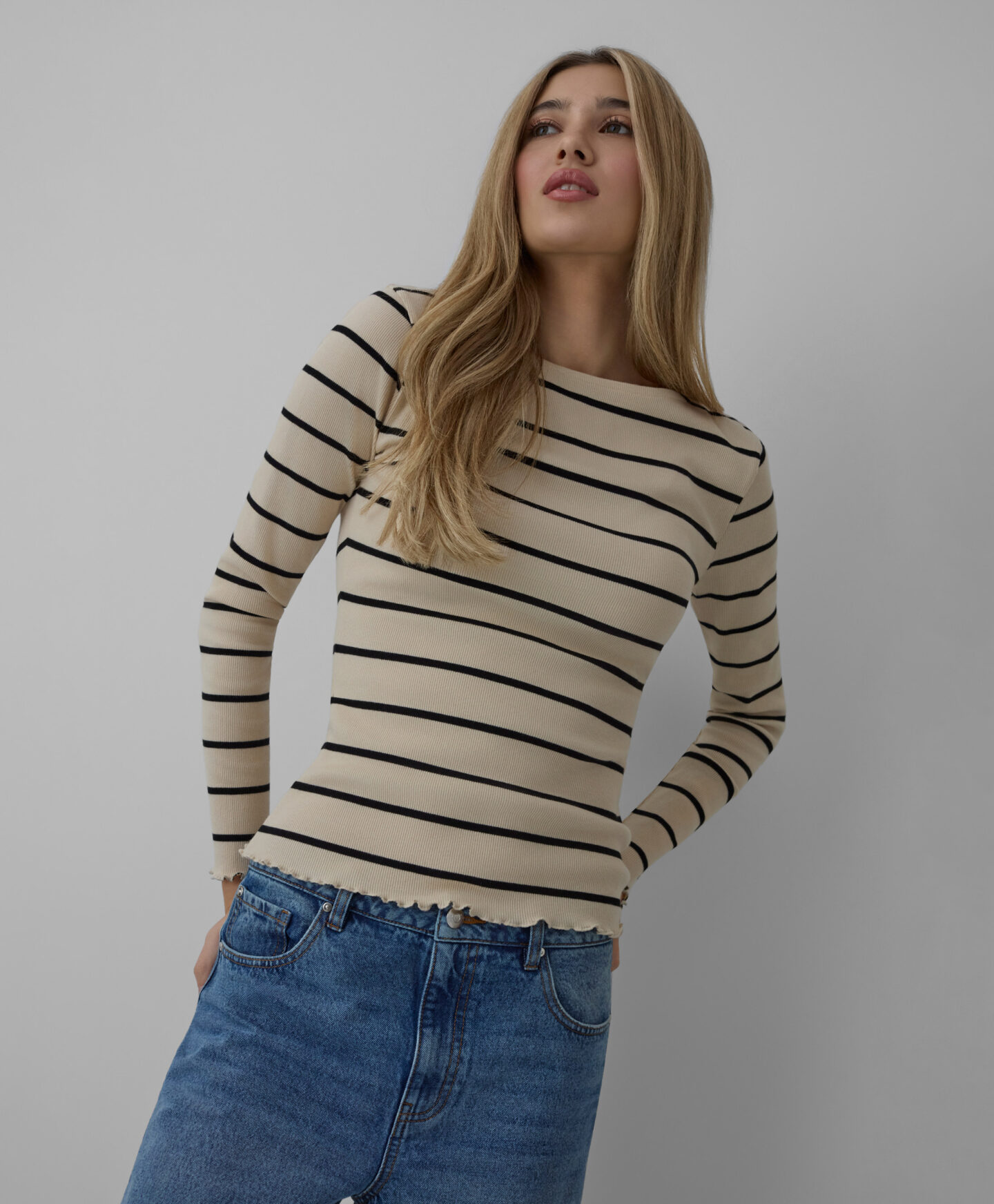 A camisola às riscas, com elevado teor de algodão, ajusta-se na perfeição ao corpo. O acabamento decorativo acrescenta um toque elegante. Combina com calças de ganga ou mais formais. Disponível em duas cores.