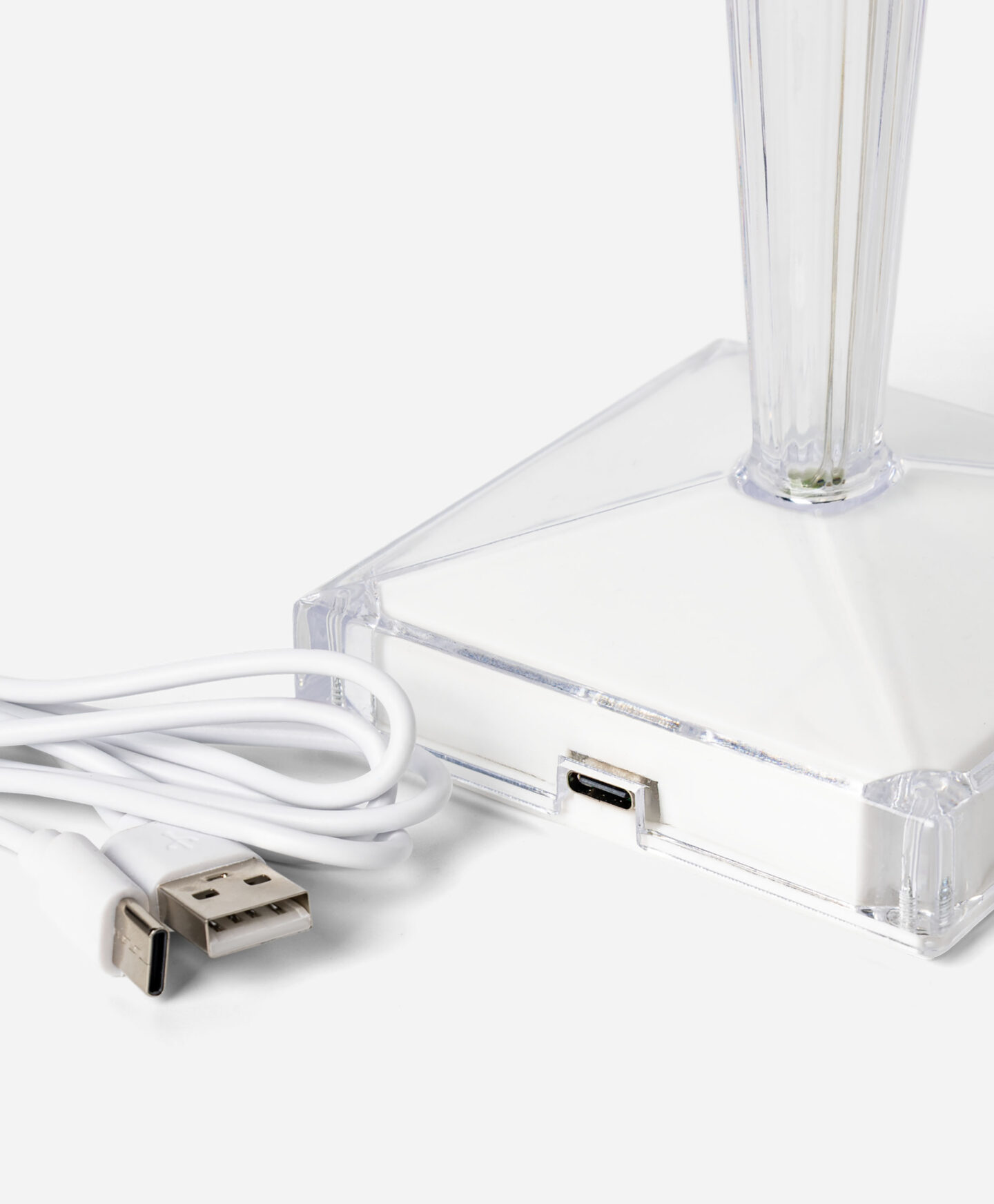 O candeeiro de mesa LED, em cristal, dá um carácter único a qualquer espaço. O design original dispersa a luz de forma bonita, criando um ambiente mágico. Ideal para as noites de outono e inverno, funciona como luz ambiente no quarto, sala ou escritório.