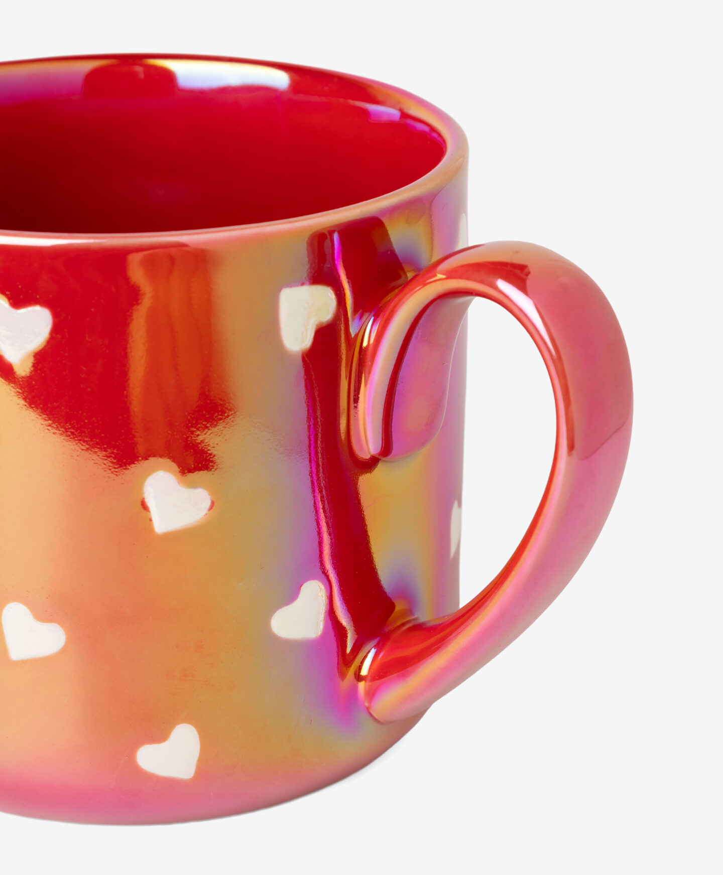 A caneca com padrão de corações e efeito holo será um destaque na tua cozinha. O design romântico torna-a perfeita para o Dia dos Namorados, para desfrutar de café ou chá, ou como presente original. Produzida em porcelana durável, é resistente ao dia a dia e fácil de cuidar. Disponível em duas cores.