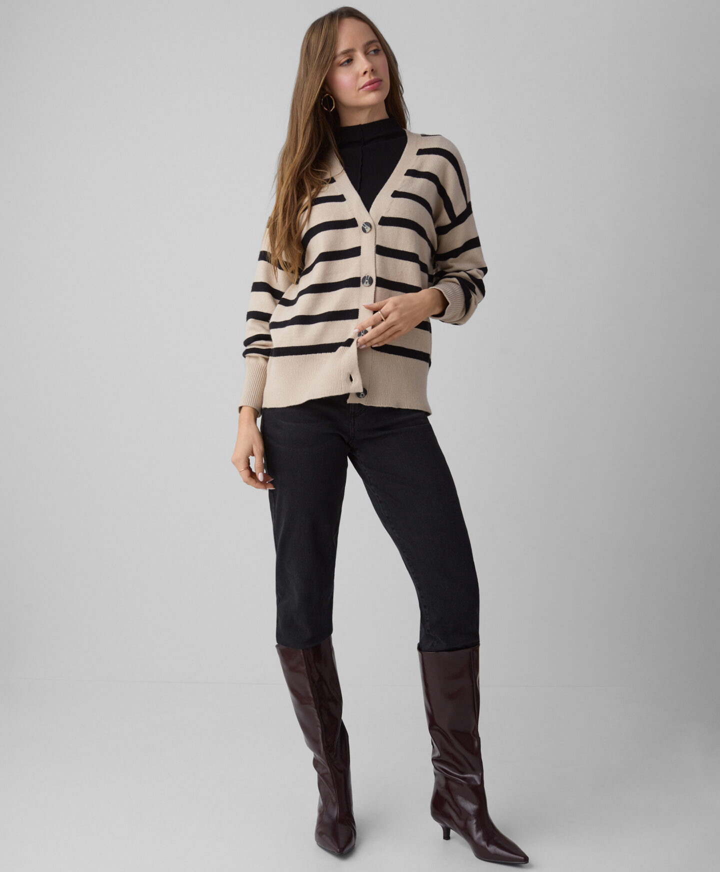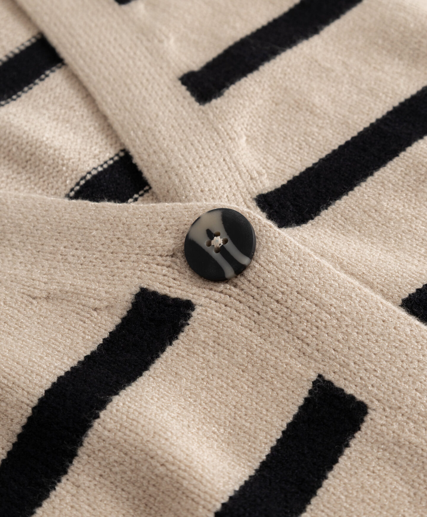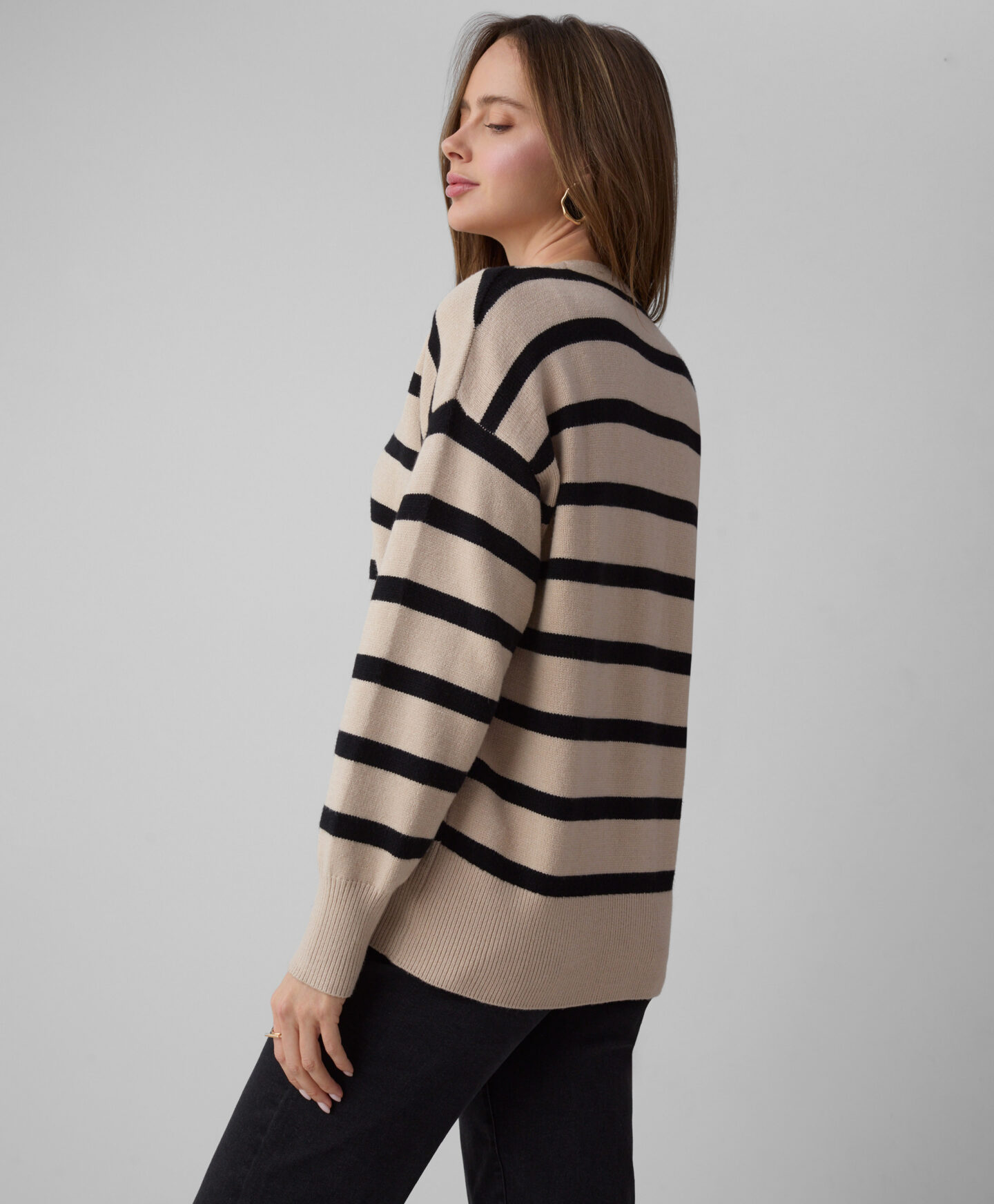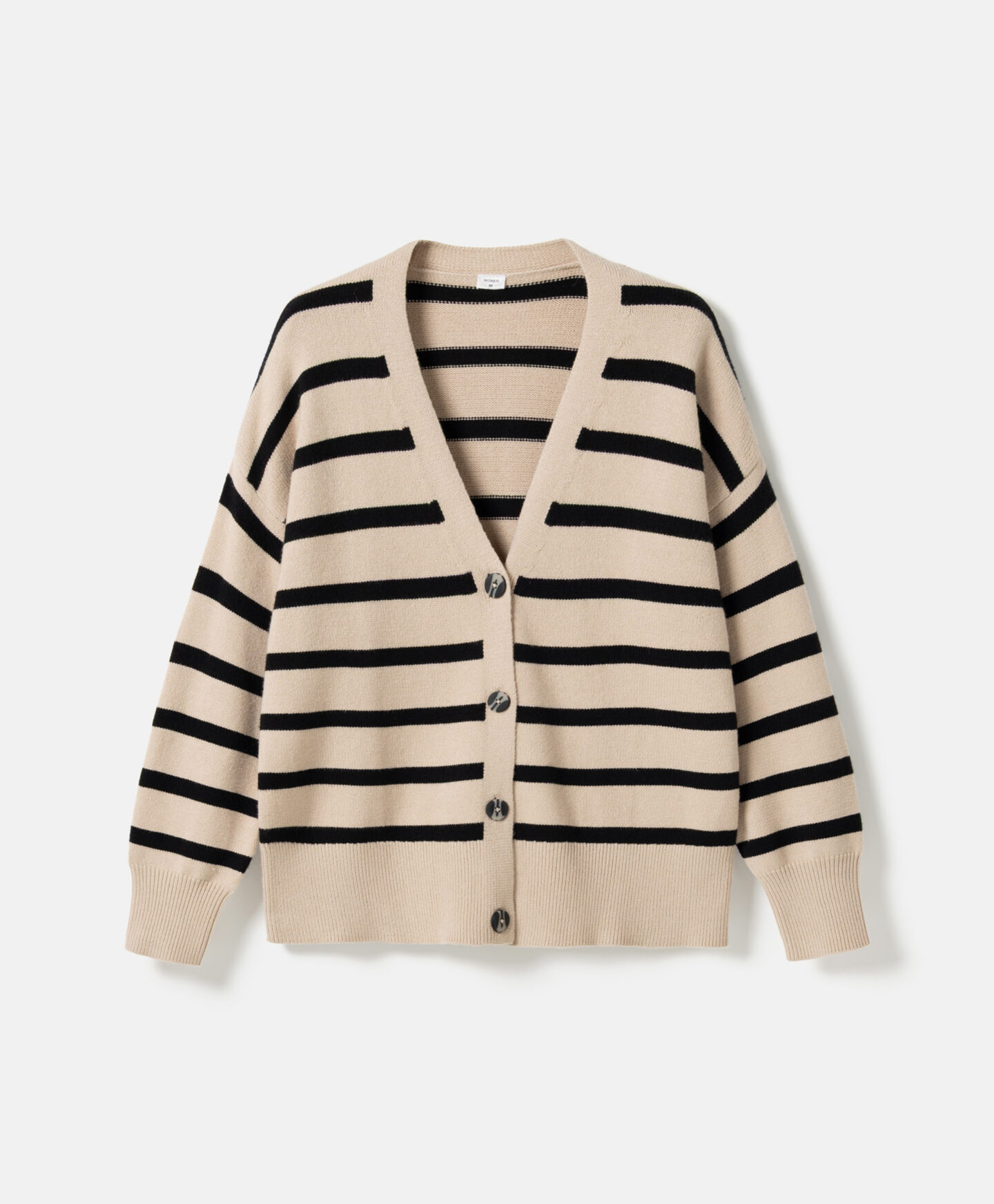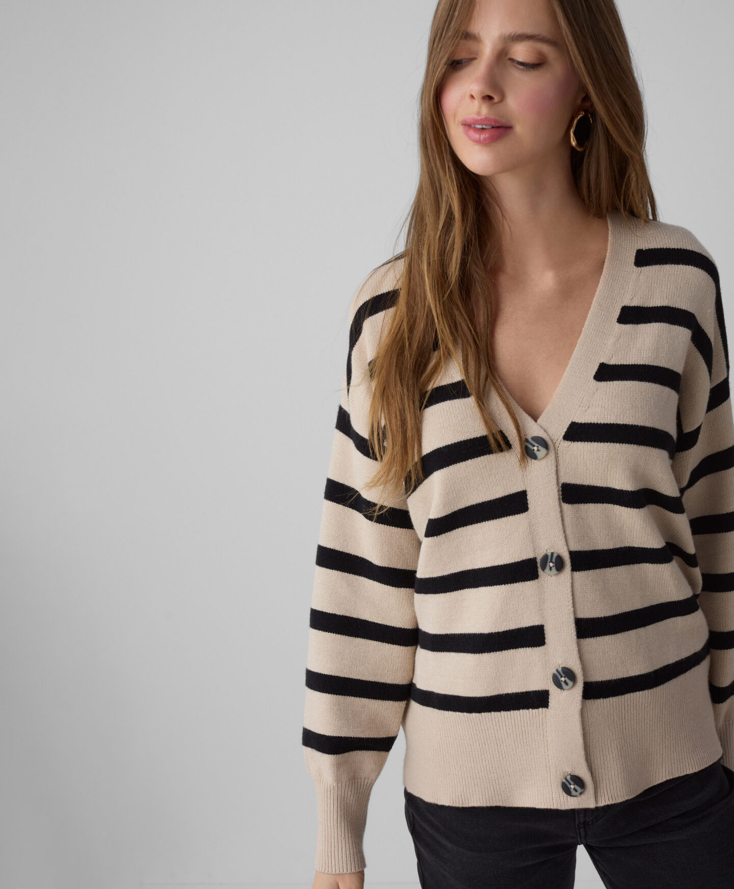 O cardigan às riscas, de corte largo, é perfeito para quem gosta de um estilo clássico numa versão confortável. O padrão nunca sai de moda e combina tanto com calças elegantes como calças de ganga clássicas. O material macio com viscose envolve a pele de forma suave e oferece conforto nos dias frios de inverno. Disponível em duas cores.