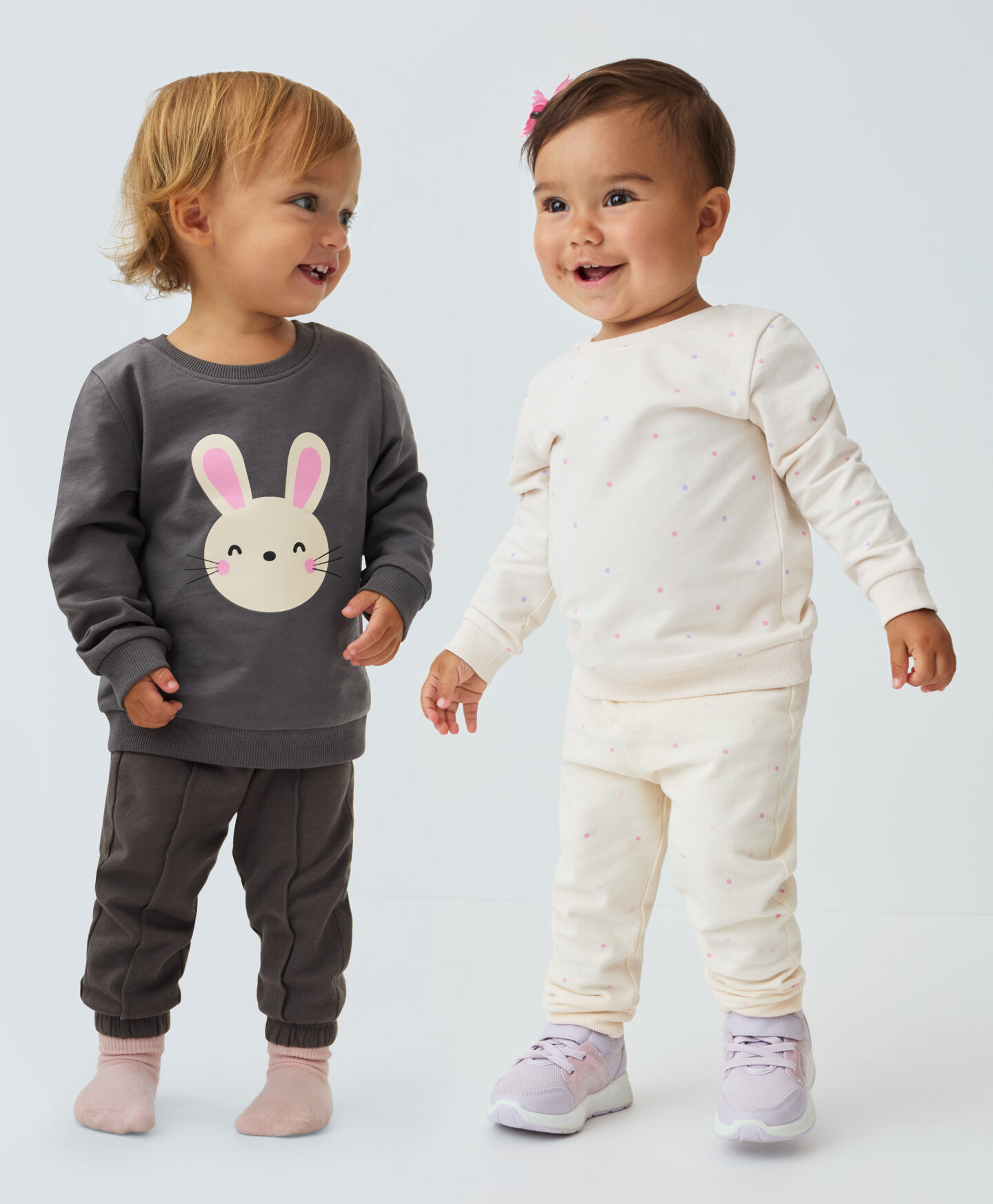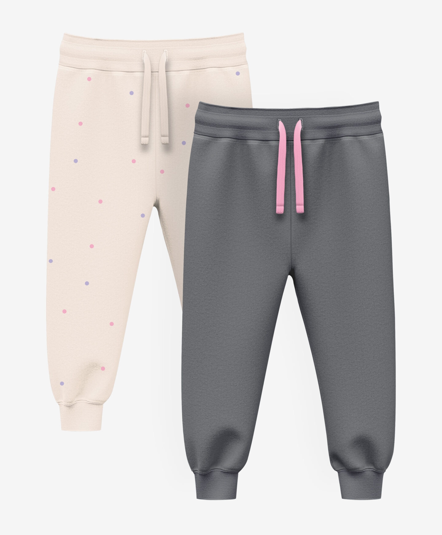 O conjunto de 2 calças, em 100% algodão, é essencial para o enxoval do bebé. São macias e agradáveis ao toque. Têm punhos elásticos e cordão na cintura, permitindo que se adaptem ao corpo da criança. Inclui modelos diferentes com um padrão às bolinhas. Combina com um conjunto de 2 camisolas da coleção.