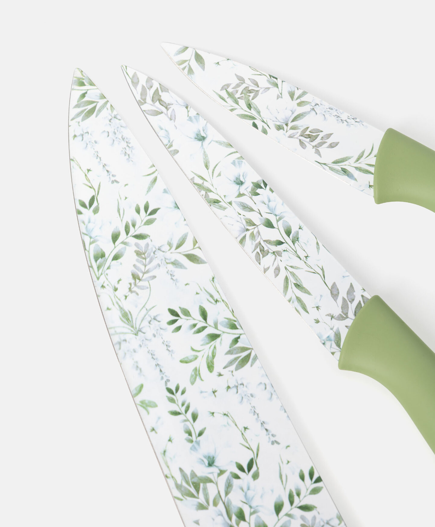 O conjunto de 3 facas, em vários tamanhos, melhora o dia a dia na cozinha. São ideais para cortar carne, peixe, legumes e fruta, ou picar ervas aromáticas. O aço inoxidável é resistente e fácil de limpar. O cabo ergonómico em verde pastel e a lâmina decorada com tema de primavera dão cor à tua cozinha. Descobre o conjunto de tábuas de cortar com o mesmo tema nesta coleção!