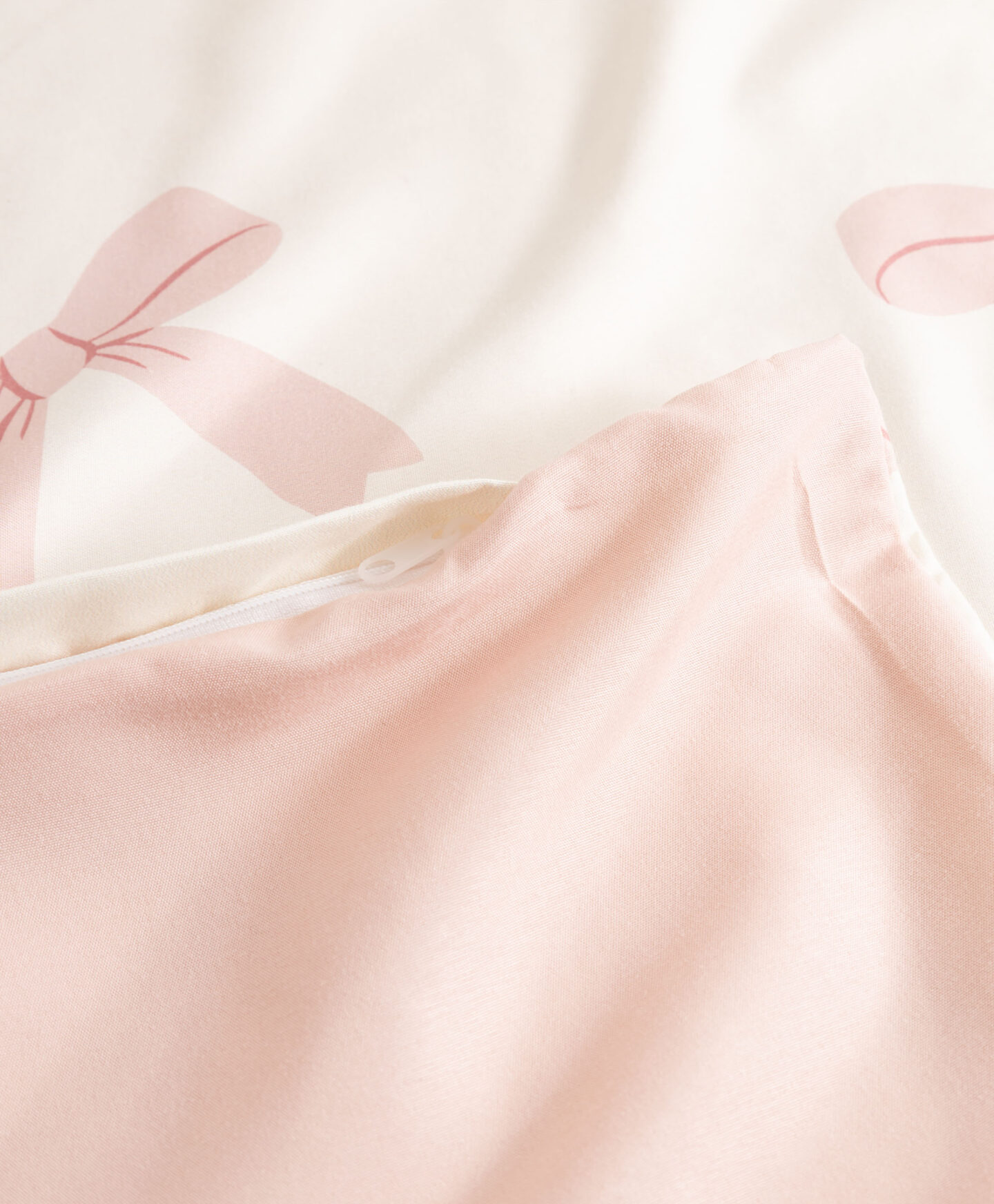 O conjunto de roupa de cama em microfibra inclui duas fronhas (50 x 60 cm) e um edredão (160 x 200 cm). Com fecho de correr, permite trocar a roupa de cama de forma fácil e rápida. O padrão com laços é perfeito para qualquer idade.