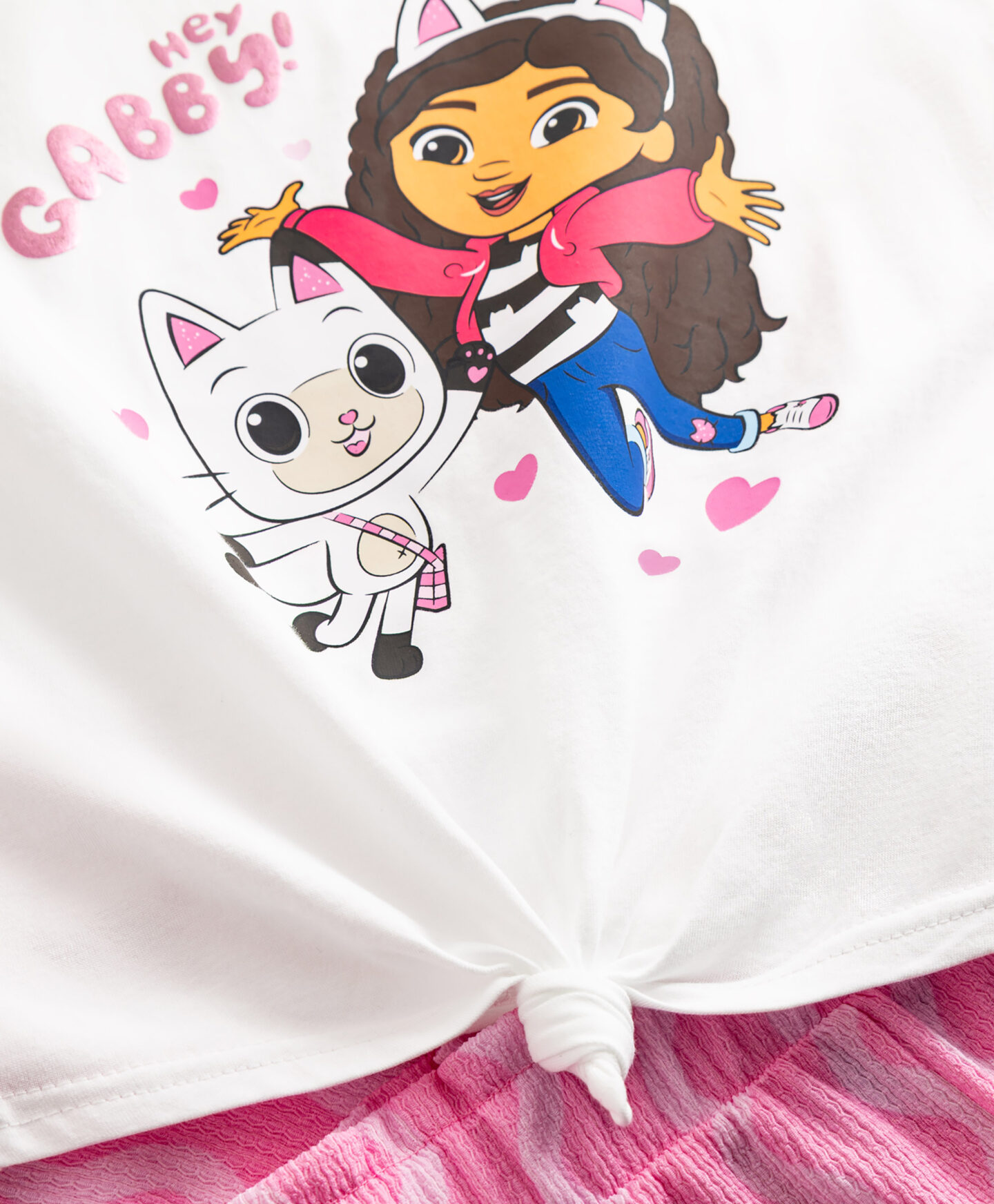O conjunto Gabby’s Dollhouse é uma escolha trendy que vai conquistar todos os dias. A t-shirt com nó e imagem das personagens divertidas marca toda a diferença. É uma sugestão de look pronta para a escola, parque infantil ou passeios em família.