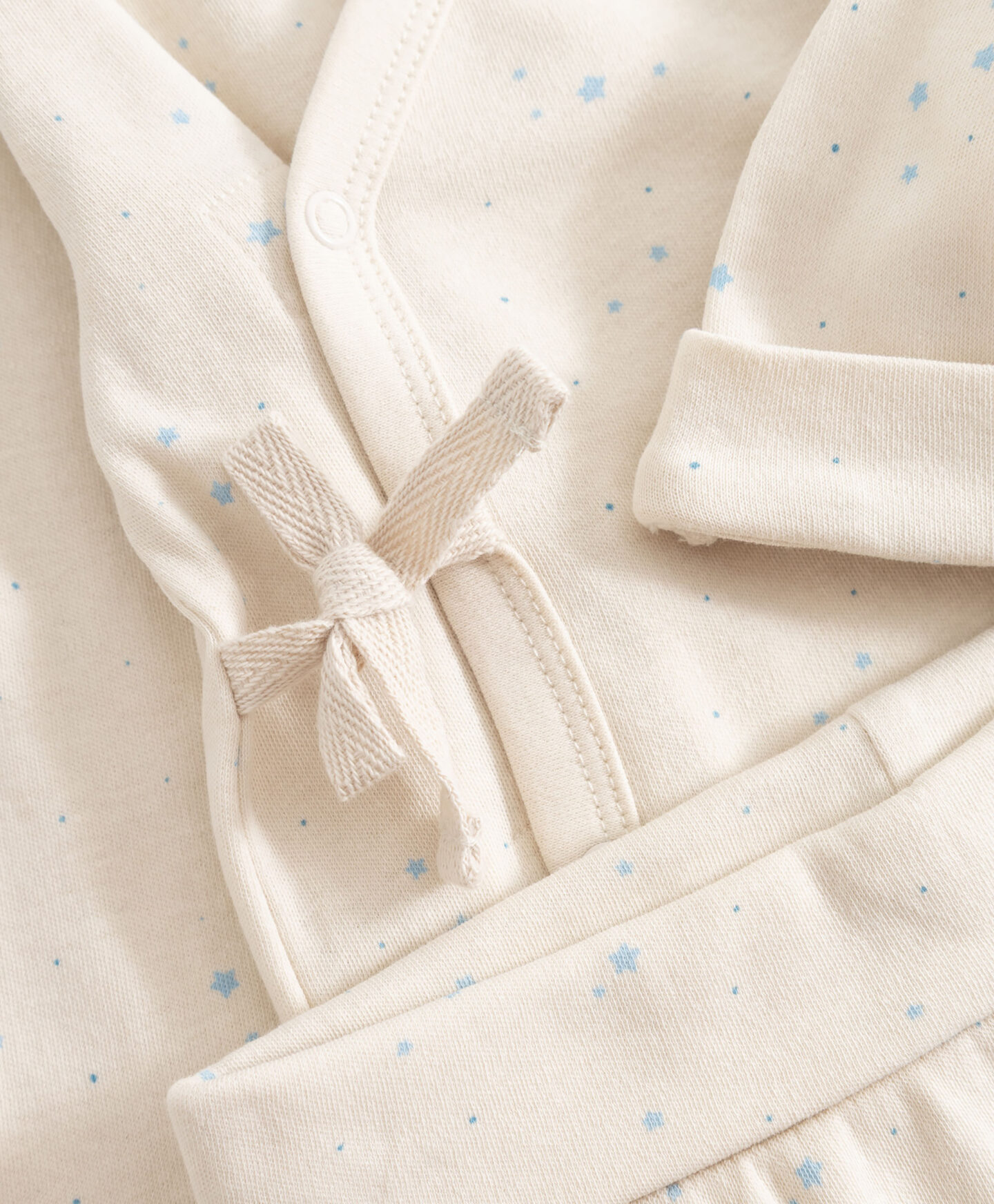 O conjunto para bebé, em 100% algodão orgânico, inclui camisola cruzada, leggings e gorro. Cria um look completo para o dia a dia. O material natural, incrivelmente macio e respirável, garante conforto desde os primeiros dias. Ideal para oferecer como presente.