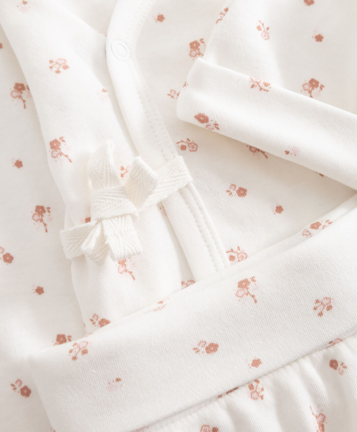 O conjunto para bebé, em 100% algodão orgânico, inclui camisola cruzada, leggings e gorro. Cria um look completo para o dia a dia. O material natural, incrivelmente macio e respirável, garante conforto desde os primeiros dias. Ideal para oferecer como presente.