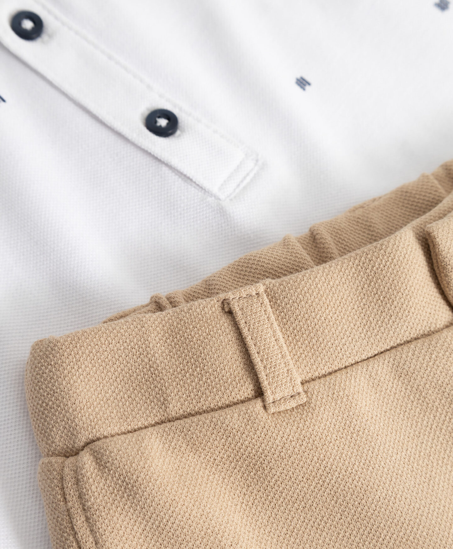 O conjunto para bebé inclui umas calças e um polo confortáveis. É um look pronto para o teu bebé, que podes combinar com o casaco, também da coleção, nos dias mais frios. Em materiais suaves e amigos da pele, que tornam este conjunto ideal desde os primeiros dias. É uma novidade adorável e versátil para todas as ocasiões e, também, um presente ideal para os mais novos.