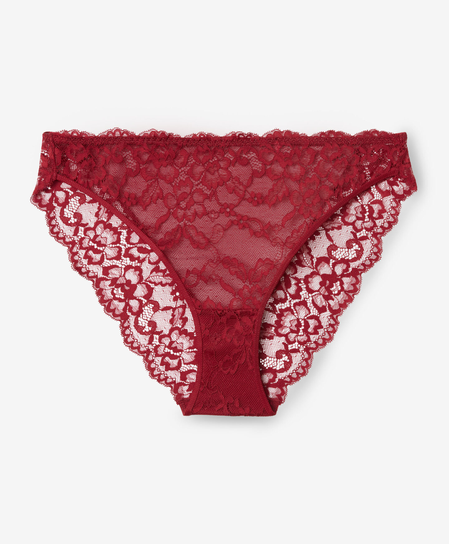 As cuecas em renda, com rosas bordô, são uma escolha sexy. A adição de elastano garante que se ajustem na perfeição, acentuando as curvas da silhueta. O material transparente é uma ótima escolha para aumentar a confiança. Cria a lingerie perfeita com um soutien da coleção!