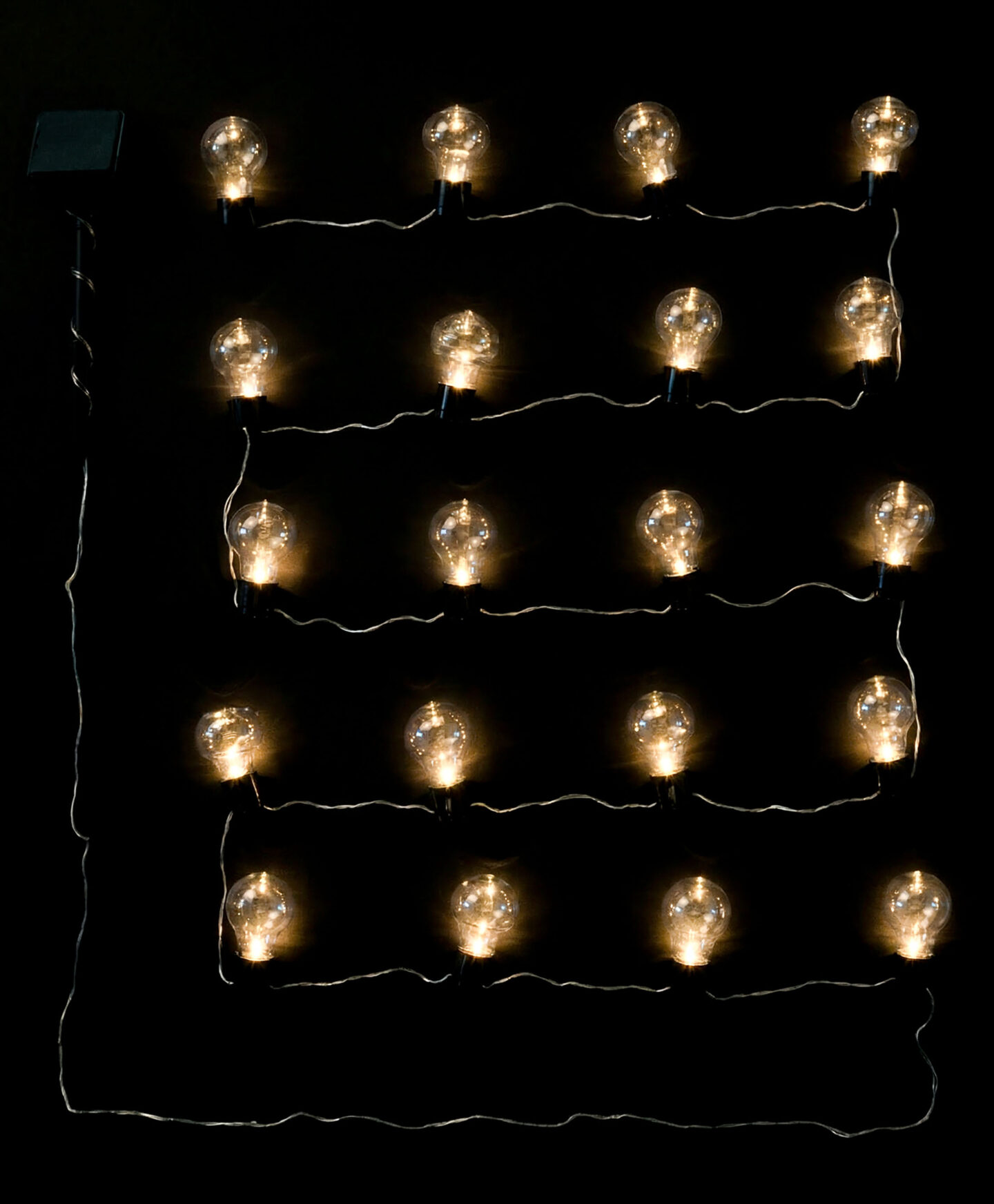 A grinalda solar com 20 LEDs funciona sem cabos nem pilhas graças ao painel integrado. Inclui 20 lâmpadas decorativas LED com aspeto clássico, criando um ambiente acolhedor ideal para convívios ao final do dia. Liga-se automaticamente ao anoitecer e desliga-se ao amanhecer.