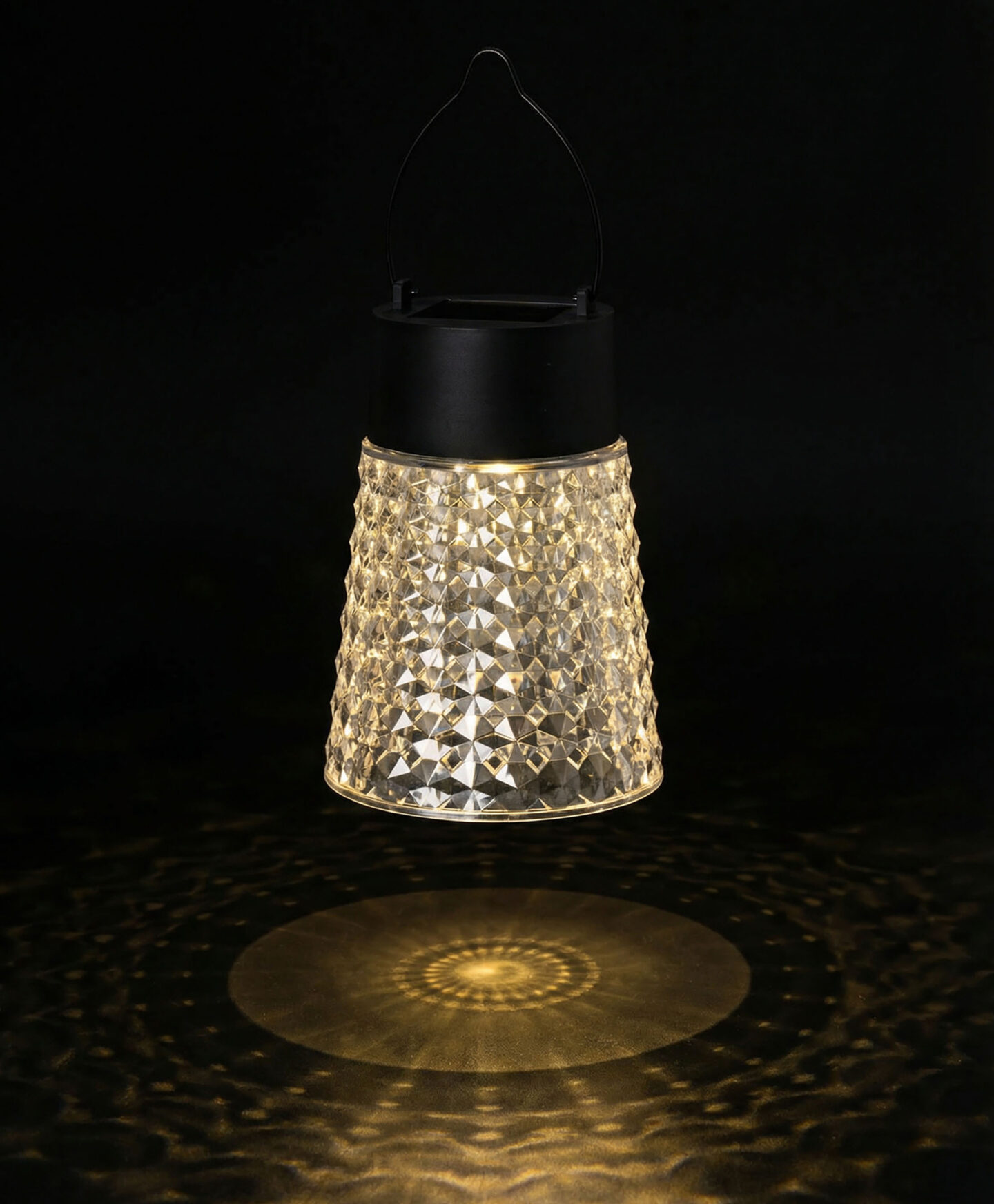 A luz solar suspensa com abajur em cristal chama a atenção de qualquer amante de acessórios elegantes. Alimentada por energia solar graças a um painel integrado, funciona sem cabos nem pilhas. Difunde a luz de forma bonita e criativa. Está equipada com uma pega prática que permite pendurá-la num ramo, barra, sob o teto ou num suporte especial. Liga-se automaticamente ao anoitecer e desliga-se ao amanhecer, garantindo iluminação durante toda a noite.