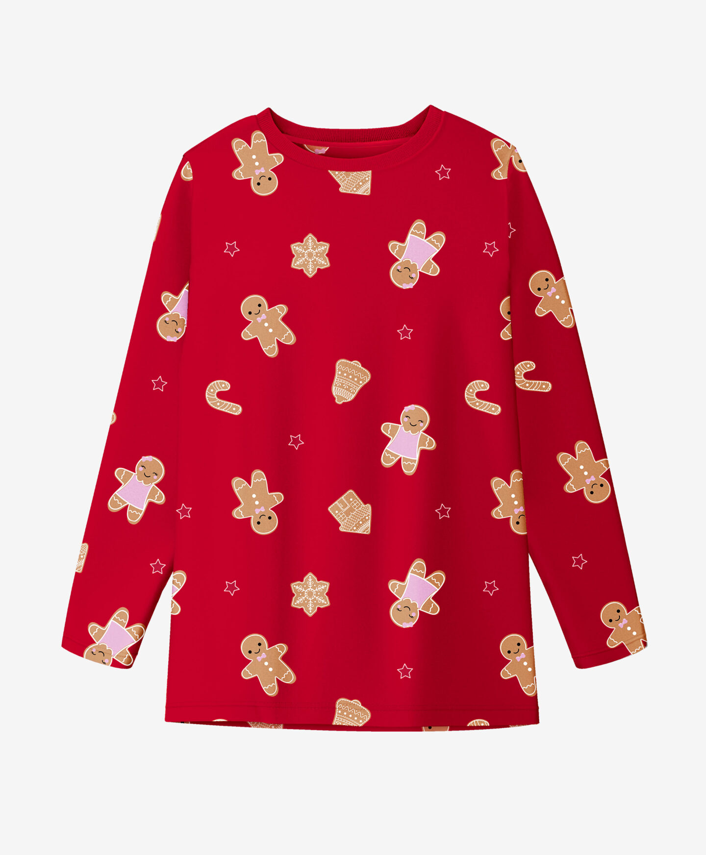 O pijama com padrão gingerbread, em 100% algodão, é muito macio. O conjunto inclui uma camisola e umas calças, perfeito para as noites mais frias. O tecido respirável garante conforto. Uma ótima ideia para oferecer como presente a quem adora o Natal.