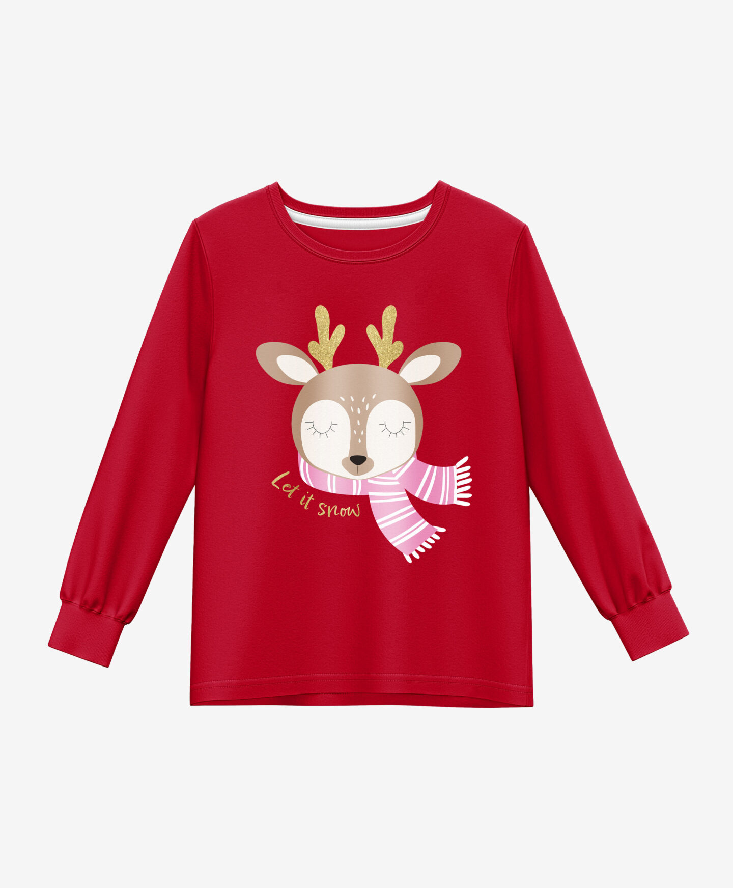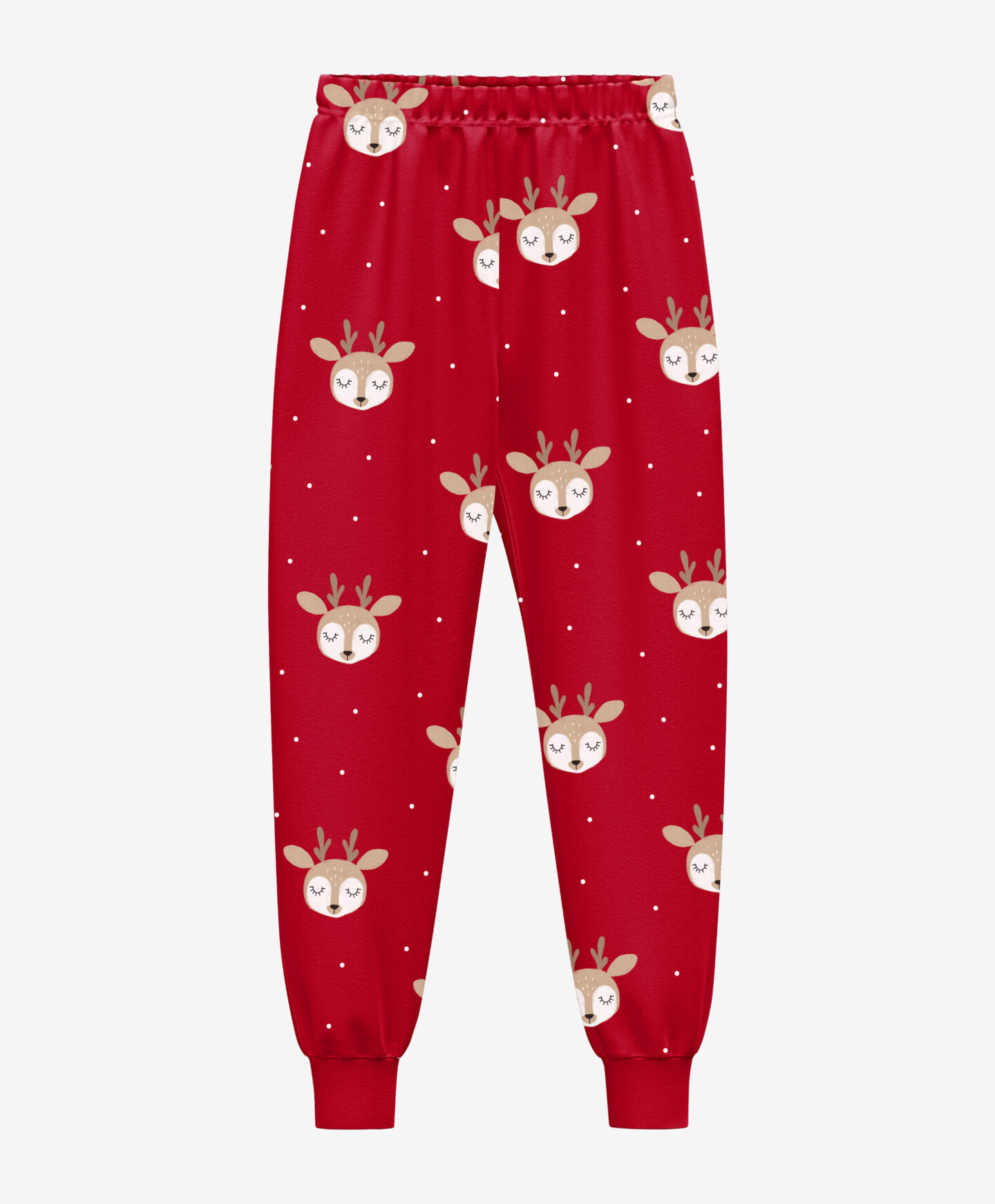 O pijama com tema de rena, em 100% algodão, é macio envolve a pele com conforto. O conjunto inclui uma camisola e umas calças que proporcionam conforto e calor. O estampado de Natal é um toque encantador.