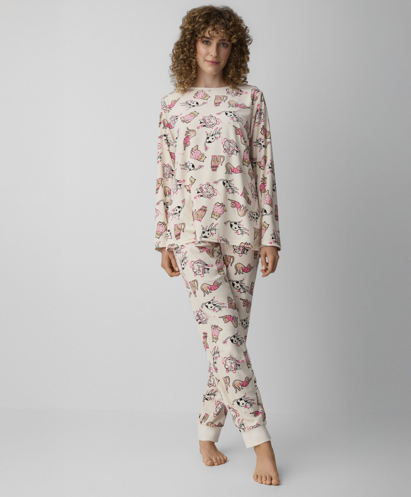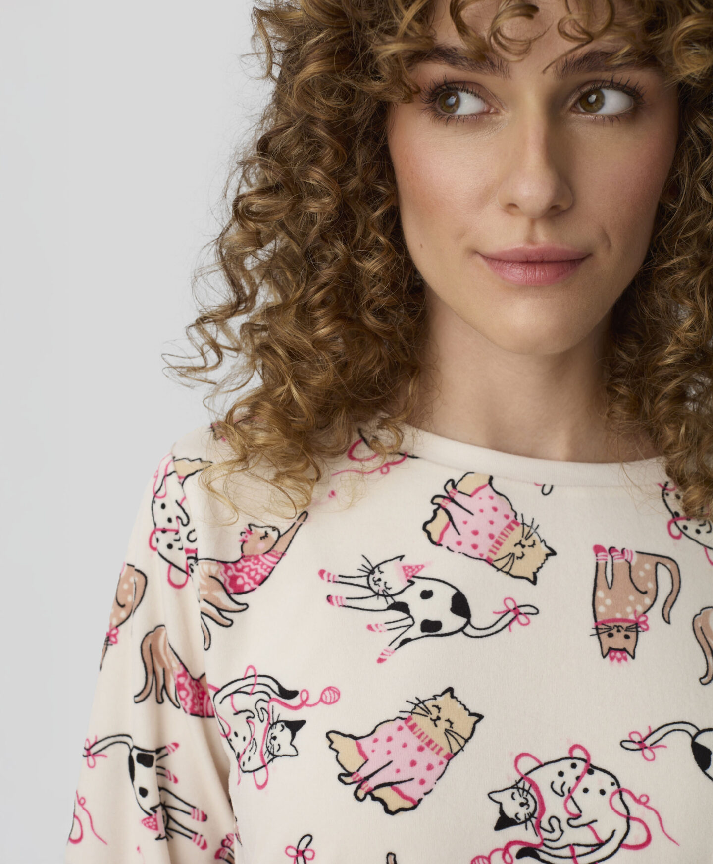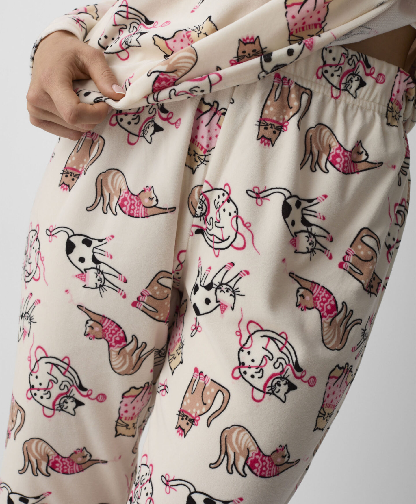 O pijama em veludo, com padrão de gatos, é ideal para o frio que se aproxima. Em tecido macio e agradável ao toque, proporciona calor, conforto e liberdade de movimentos. O design divertido faz dele o look preferido para estar em casa a relaxar.