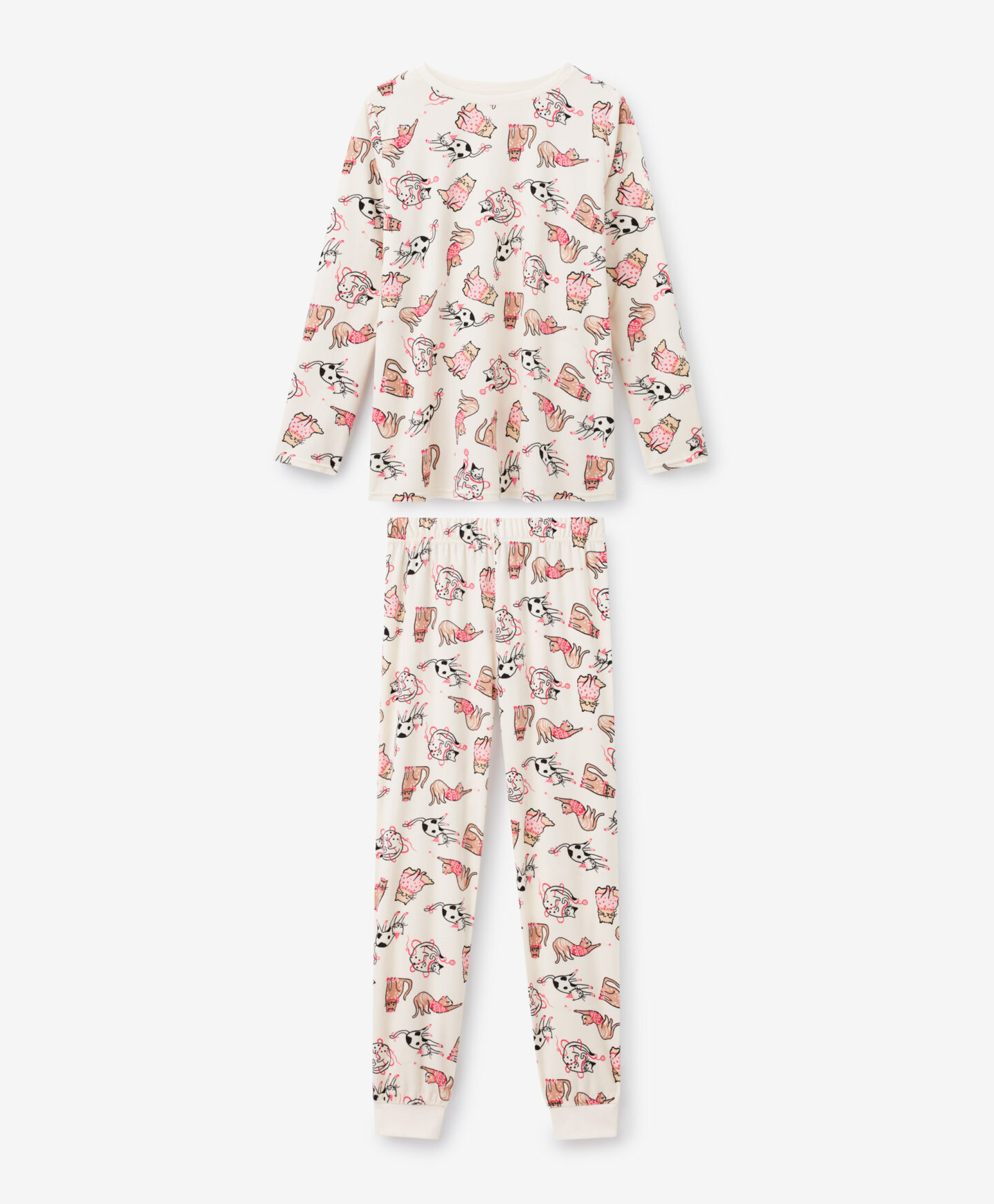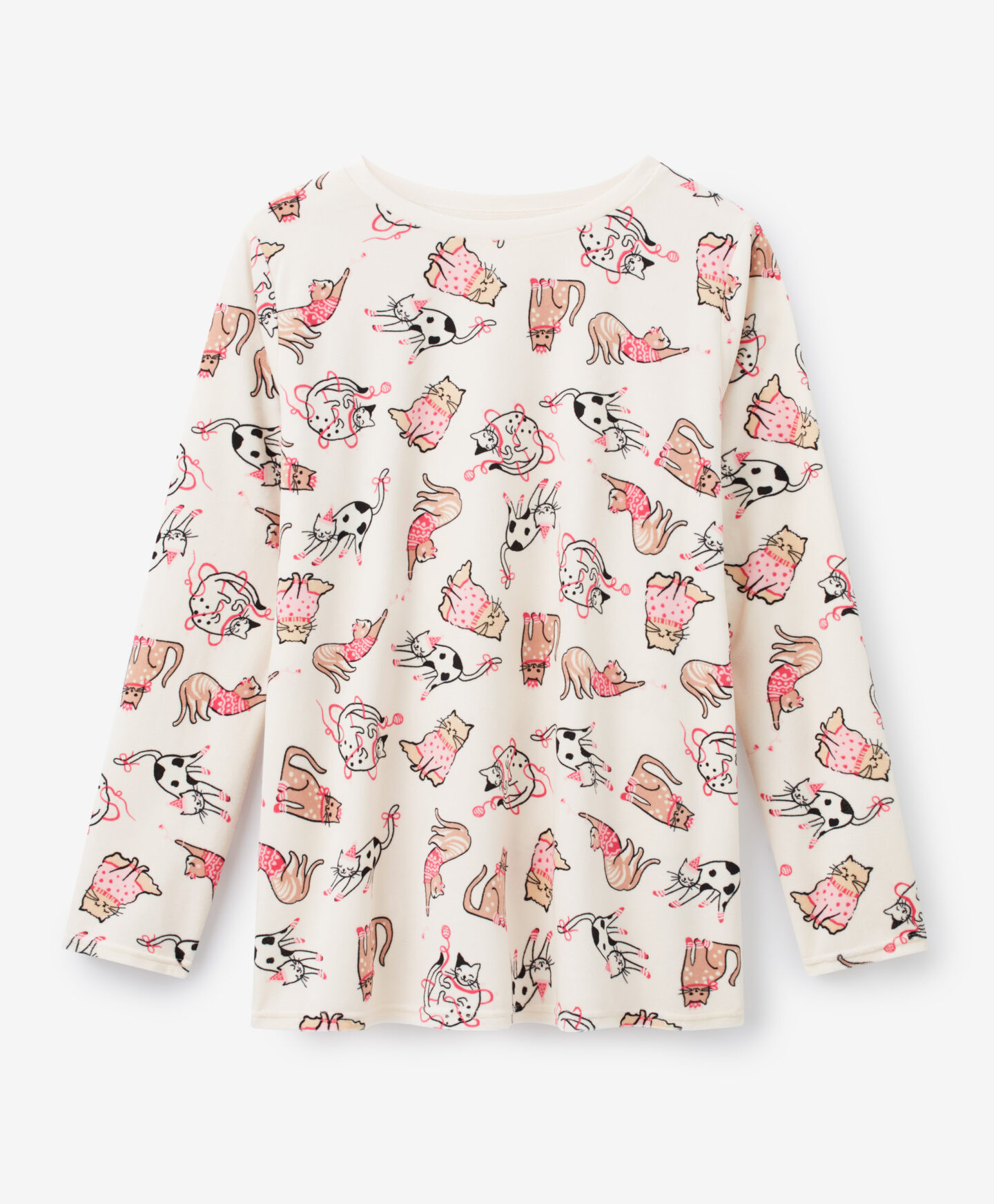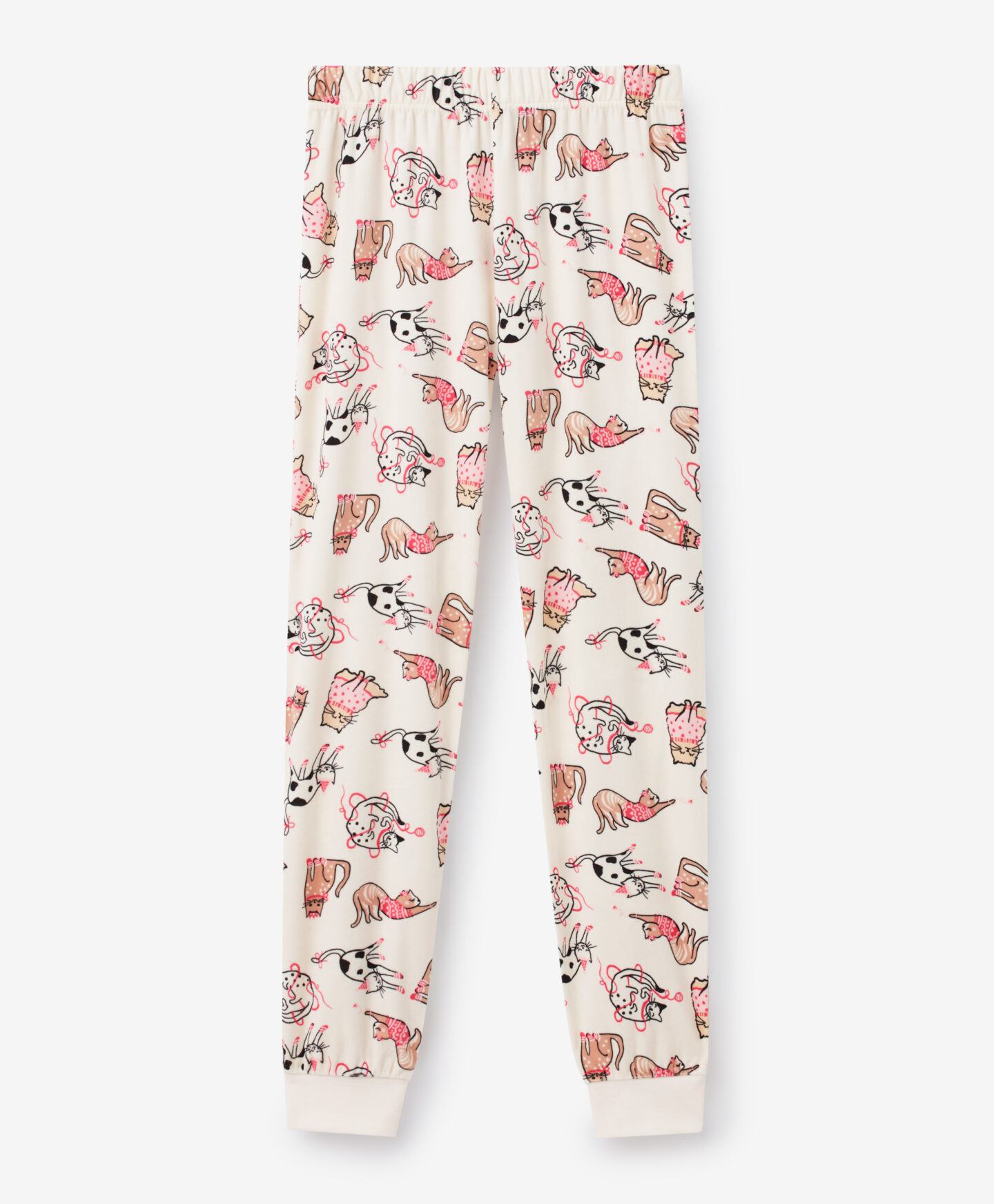 O pijama em veludo, com padrão de gatos, é ideal para o frio que se aproxima. Em tecido macio e agradável ao toque, proporciona calor, conforto e liberdade de movimentos. O design divertido faz dele o look preferido para estar em casa a relaxar.