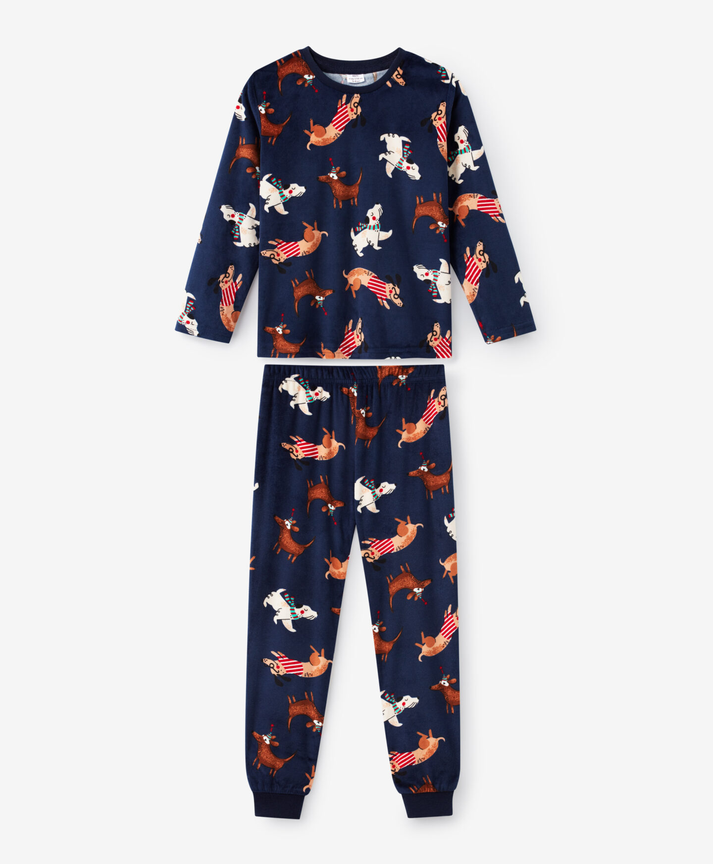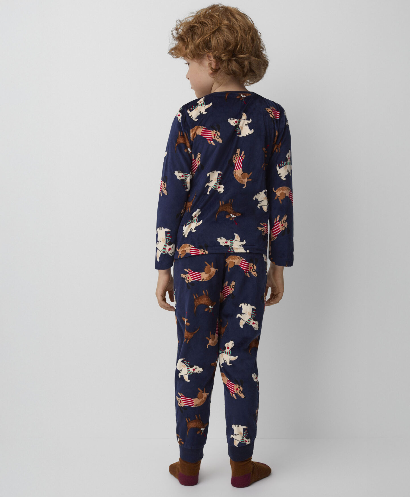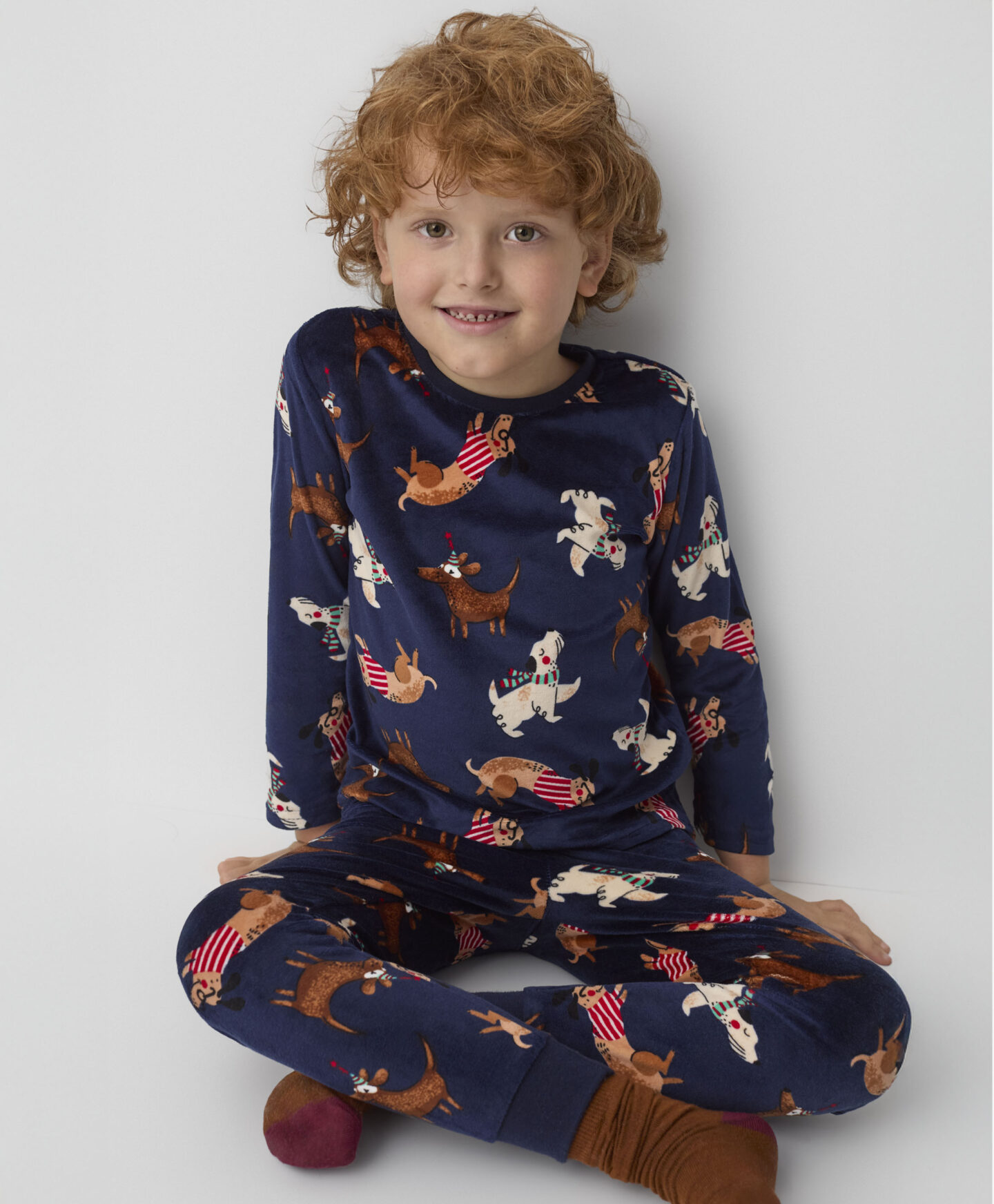 O pijama em veludo, com padrão de cães, é a escolha ideal para o aconchego perfeito. Em tecido macio e agradável ao toque, garante conforto para dormir com liberdade. O design divertido vai conquistar as crianças e será o preferido para este outono! Ideal para tornar as noites mais acolhedoras.