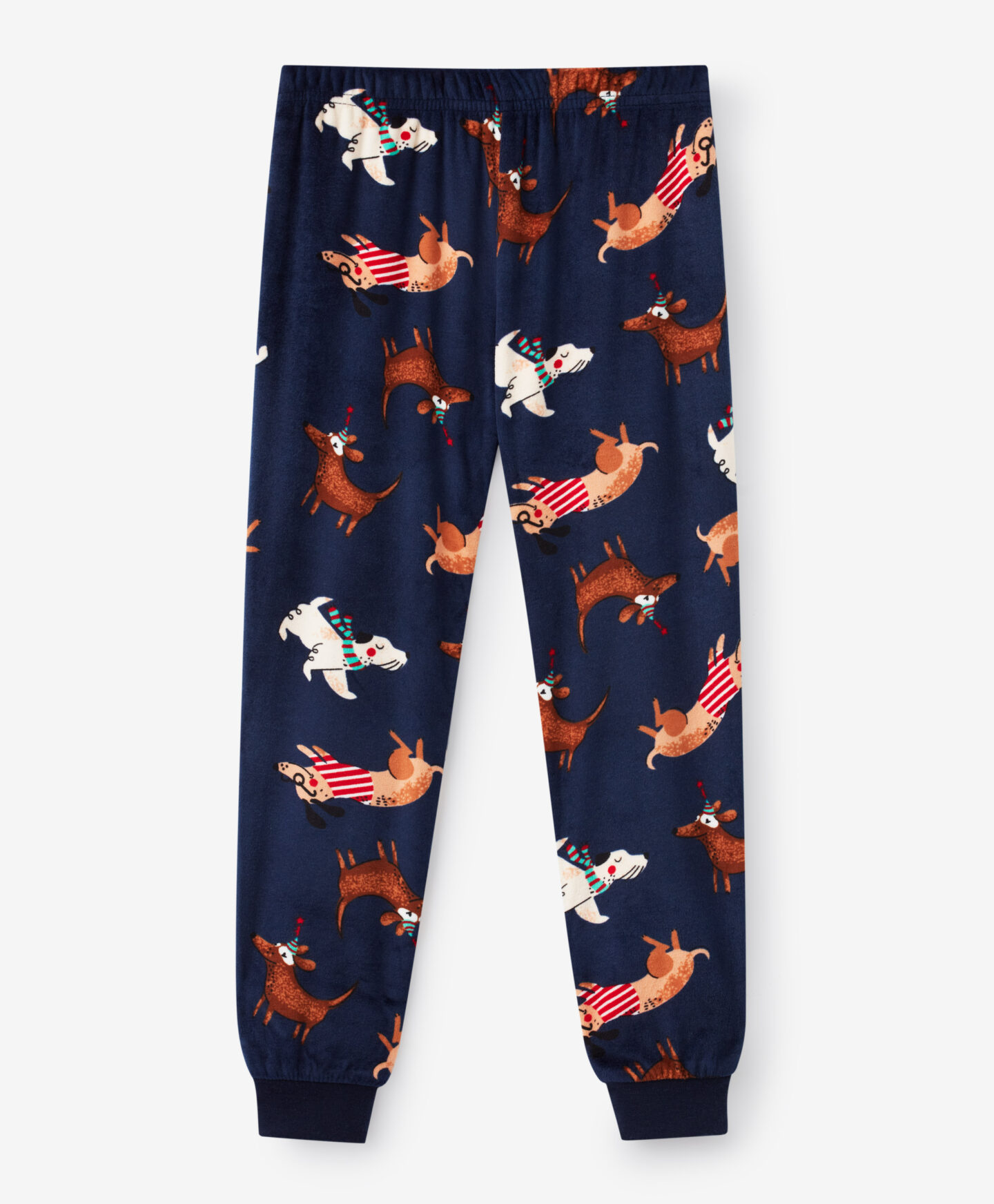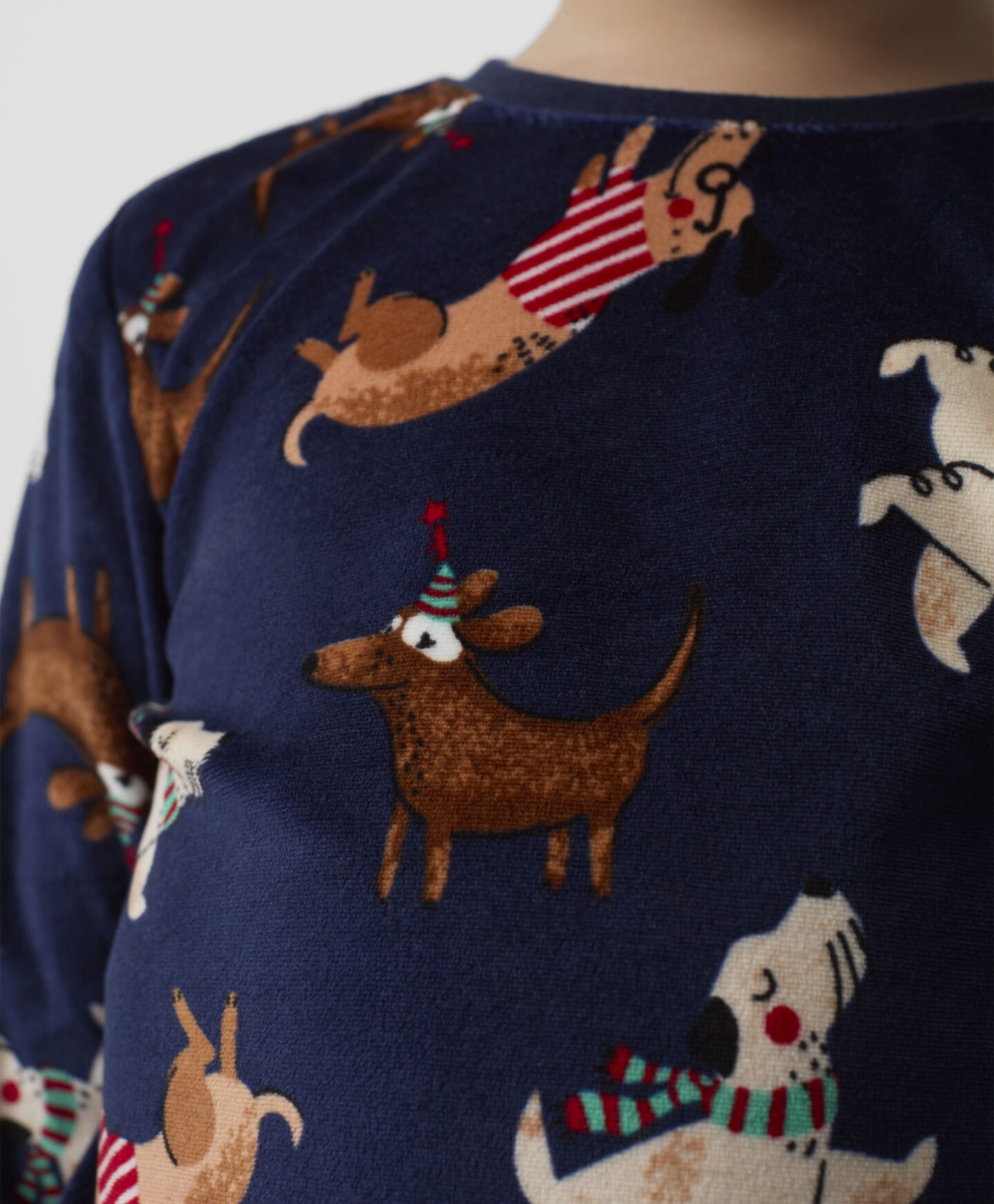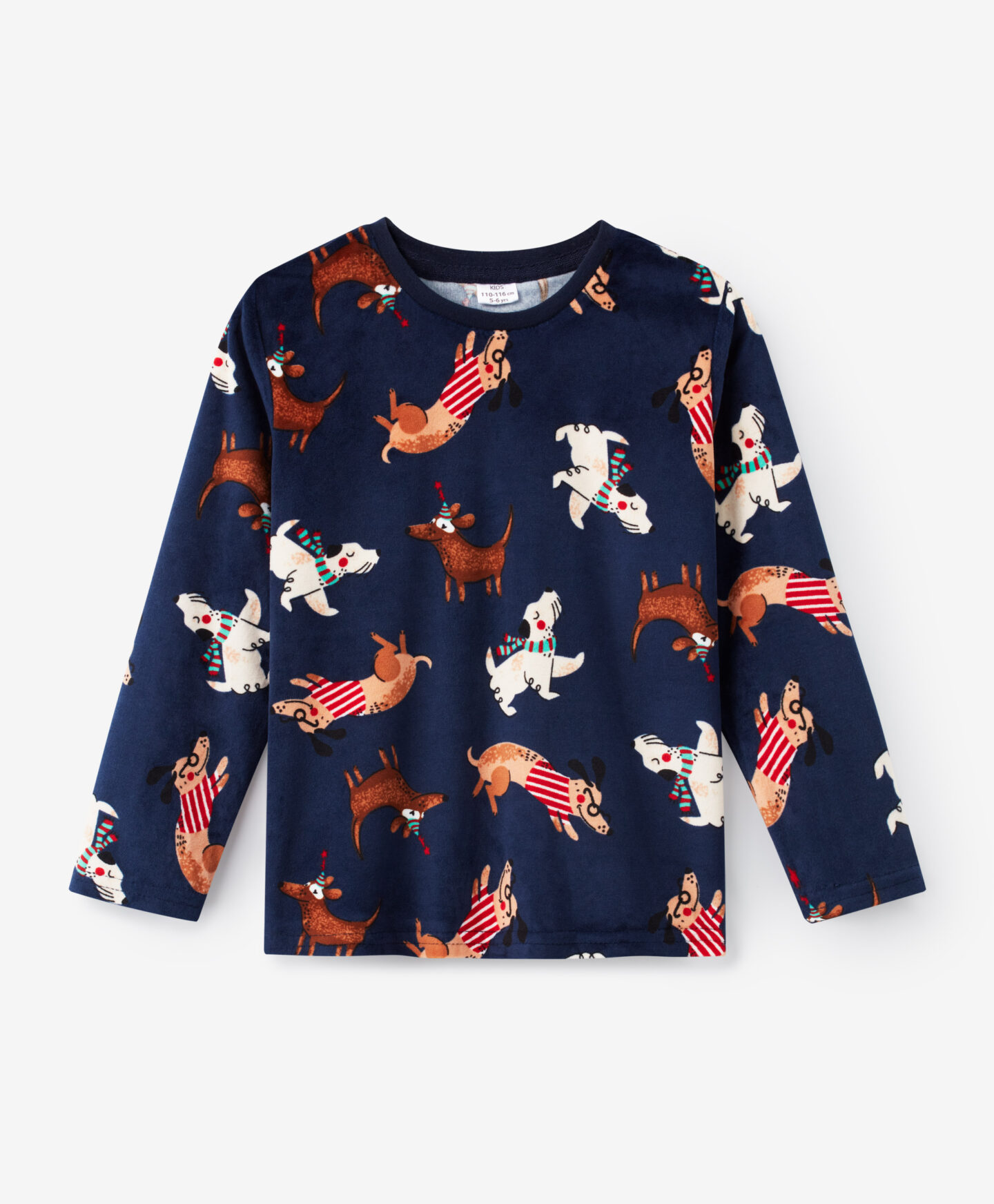 O pijama em veludo, com padrão de cães, é a escolha ideal para o aconchego perfeito. Em tecido macio e agradável ao toque, garante conforto para dormir com liberdade. O design divertido vai conquistar as crianças e será o preferido para este outono! Ideal para tornar as noites mais acolhedoras.