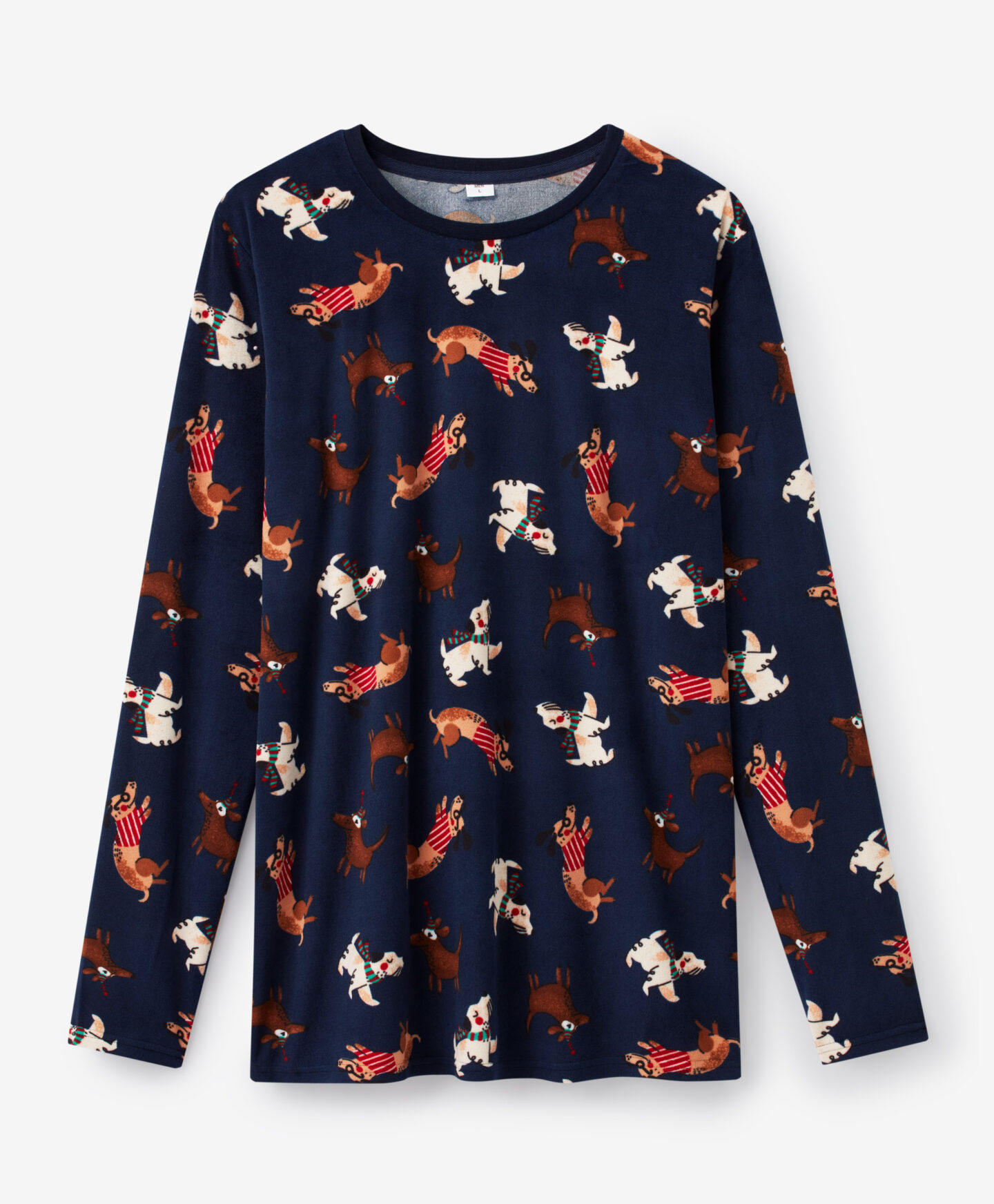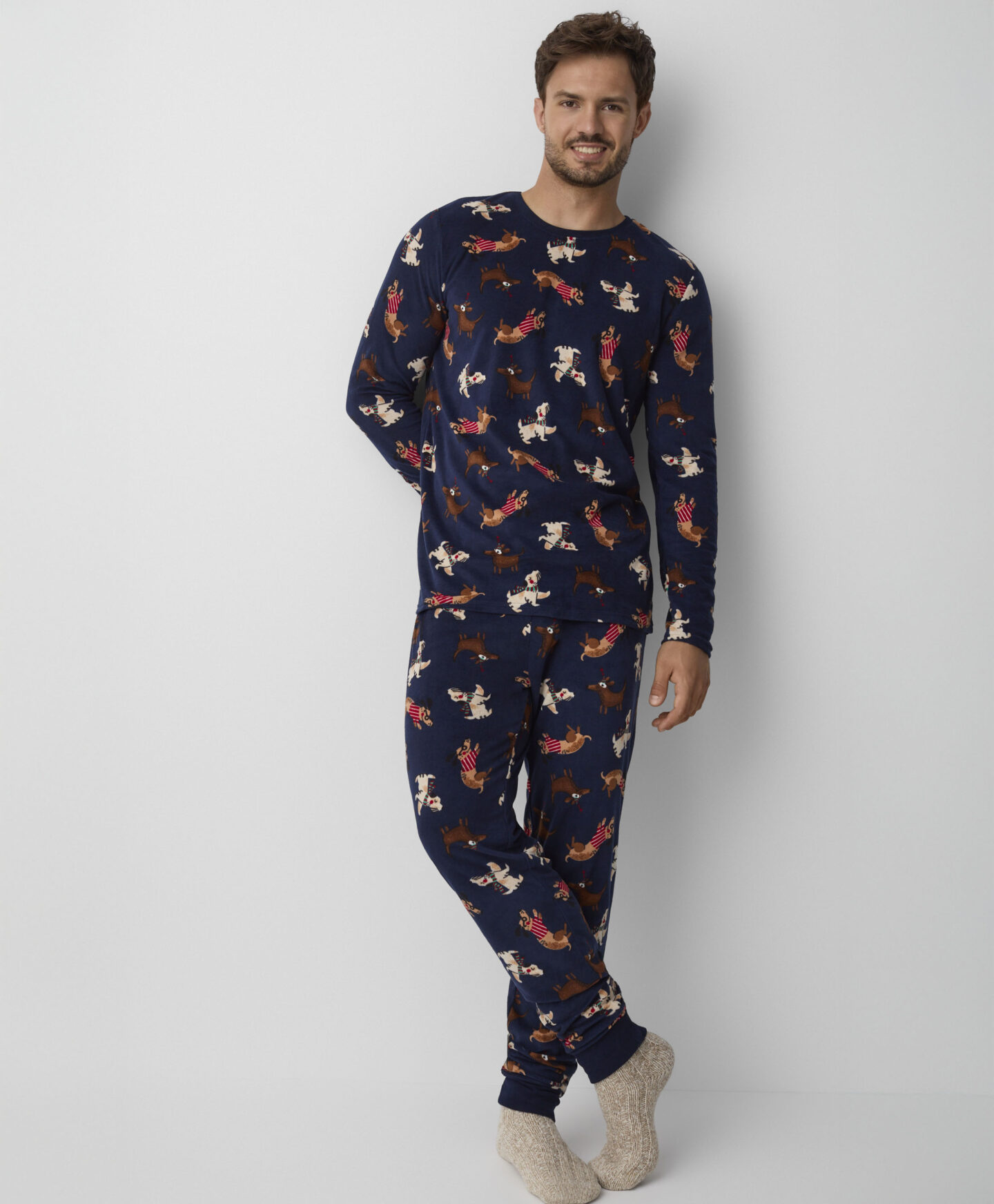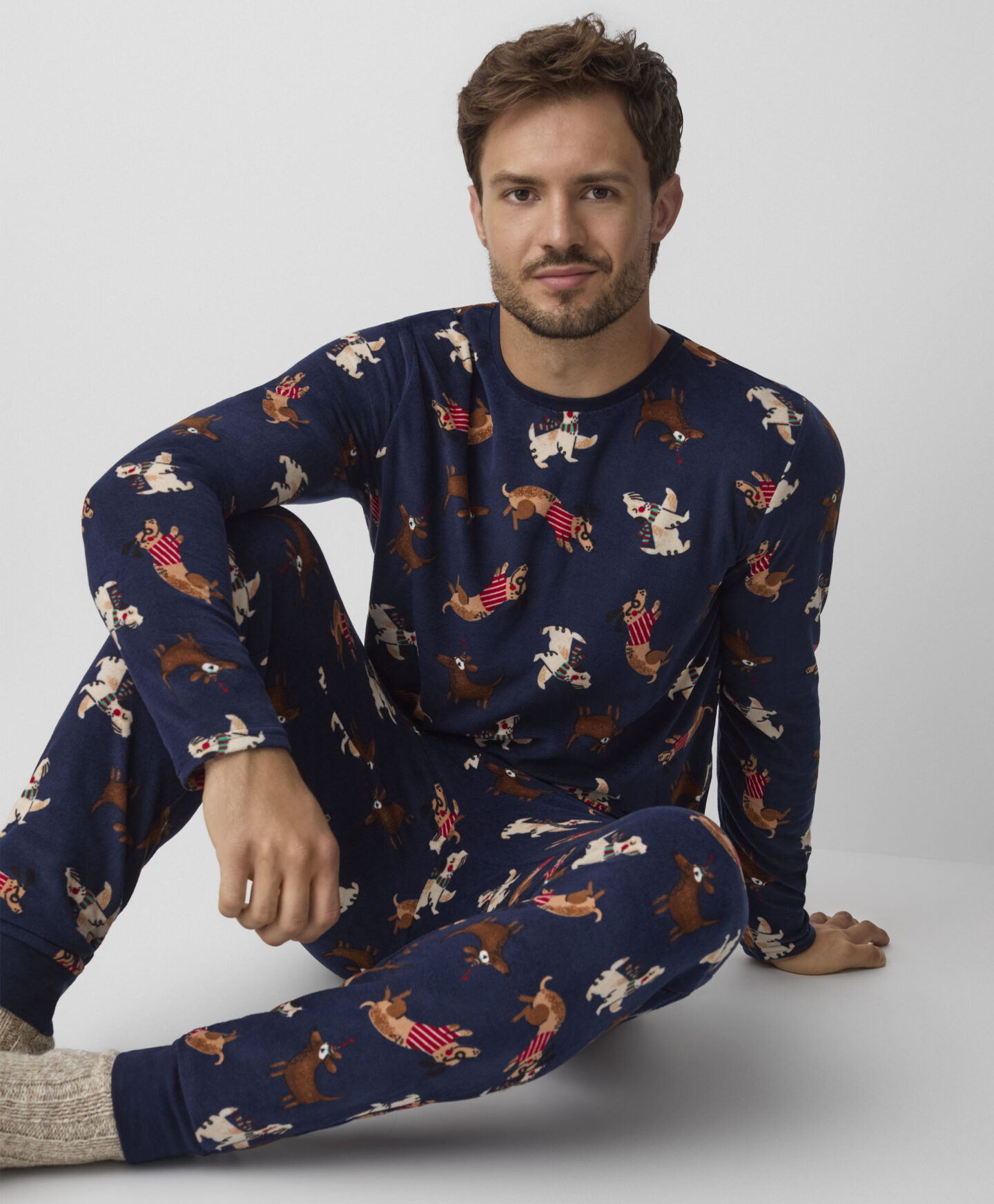 O pijama em veludo, com padrão de cães, é ideal para o frio que se aproxima. Em tecido macio e agradável ao toque, proporciona calor, conforto e liberdade de movimentos. O design divertido faz dele o look preferido para estar em casa a relaxar.
