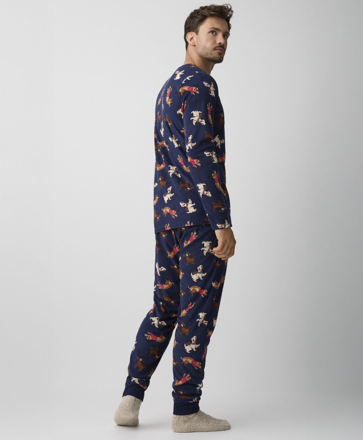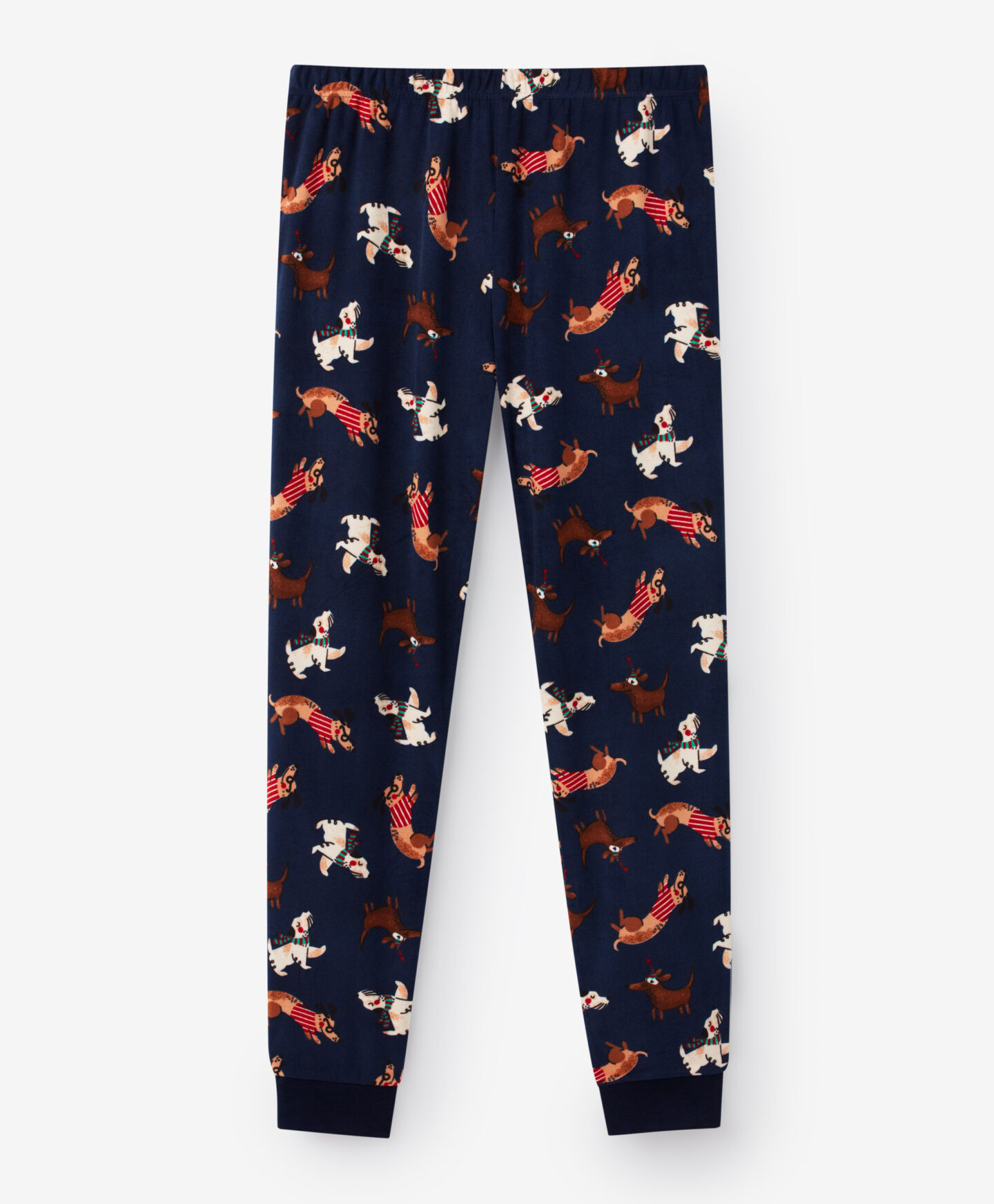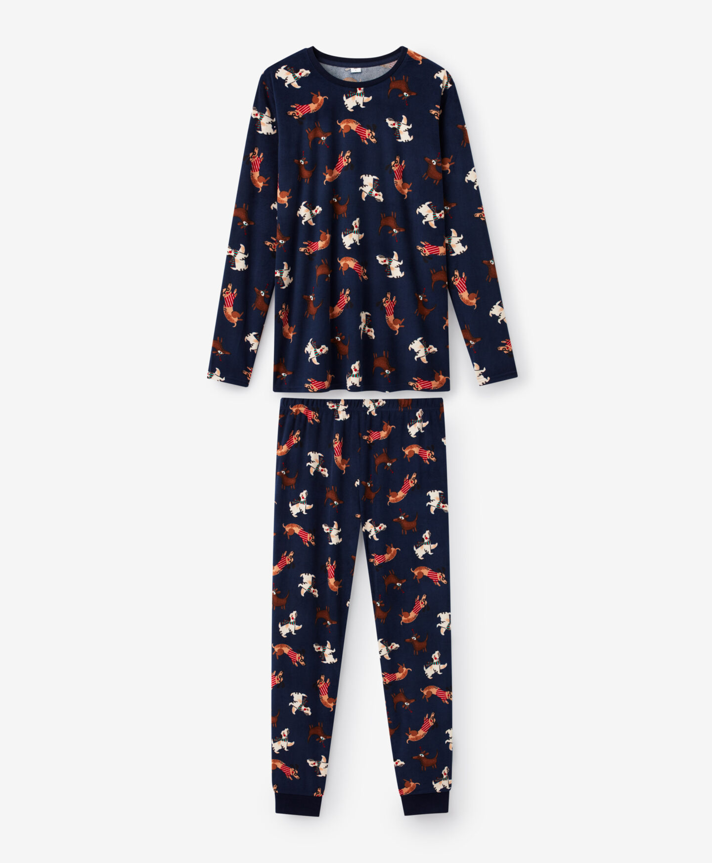 O pijama em veludo, com padrão de cães, é ideal para o frio que se aproxima. Em tecido macio e agradável ao toque, proporciona calor, conforto e liberdade de movimentos. O design divertido faz dele o look preferido para estar em casa a relaxar.