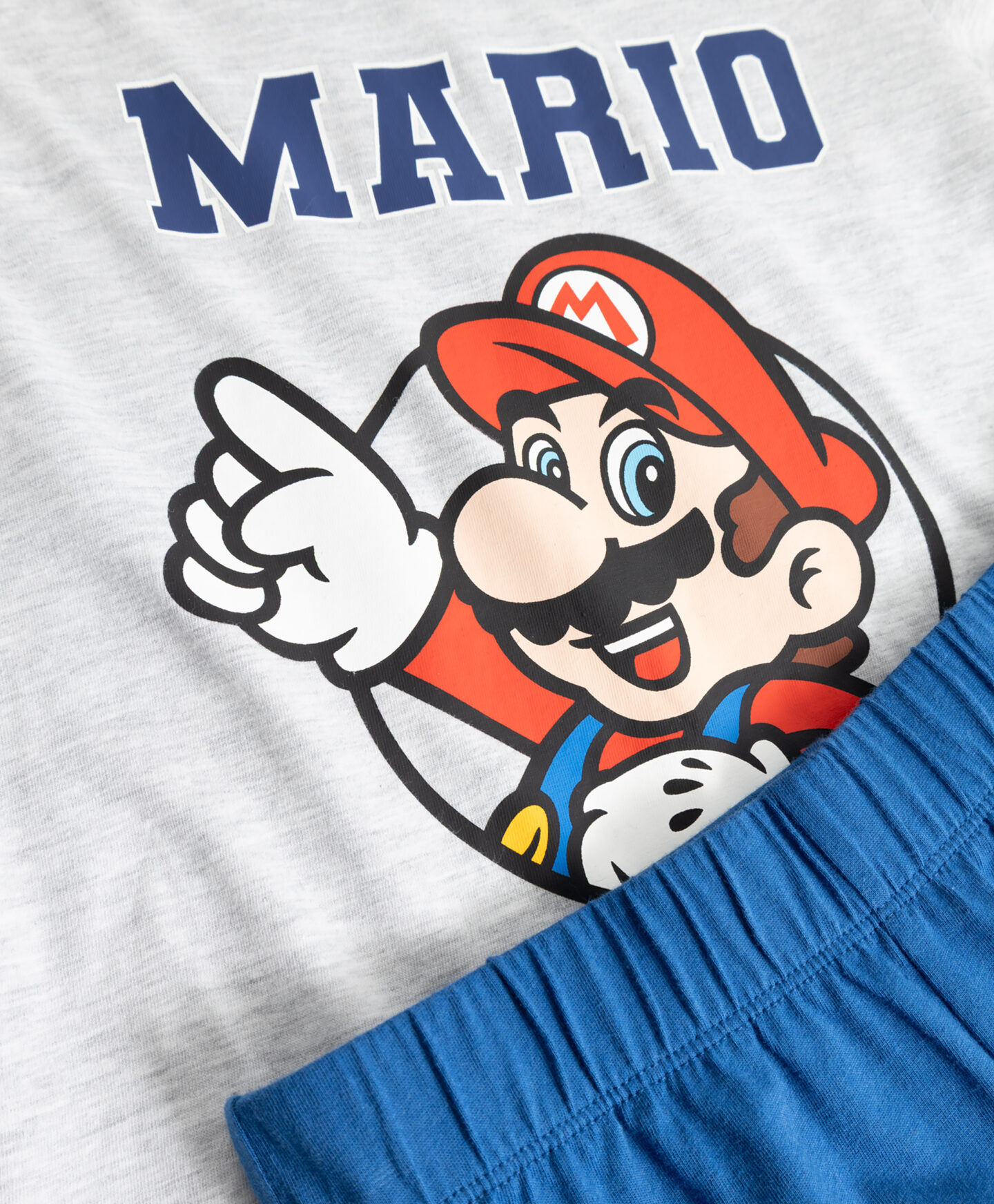 O pijama Super Mario em 100% algodão inclui t-shirt e calções. É ideal para noites mais quentes. O material é agradável para a pele e envolve a criança de forma suave durante o sono, enquanto o corte clássico garante liberdade de movimentos. Disponível em vários modelos.