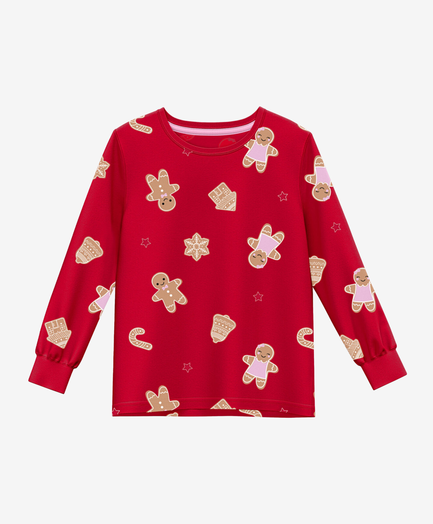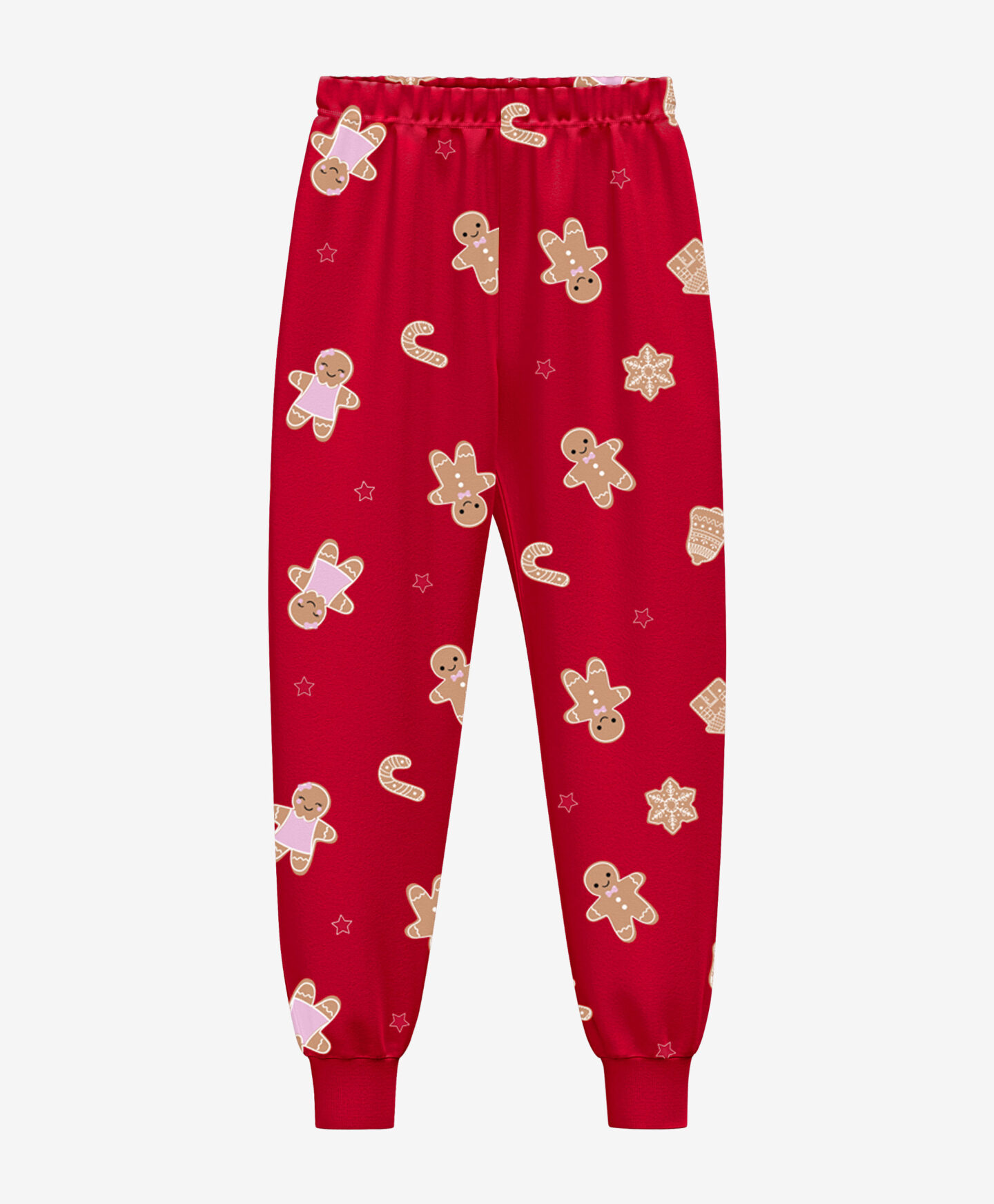 O pijama com padrão gingerbread, em 100% algodão, é um must-have de Natal. O conjunto inclui uma camisola e umas calças em algodão respirável, que garante conforto e calor, perfeito para as noites mais frias.