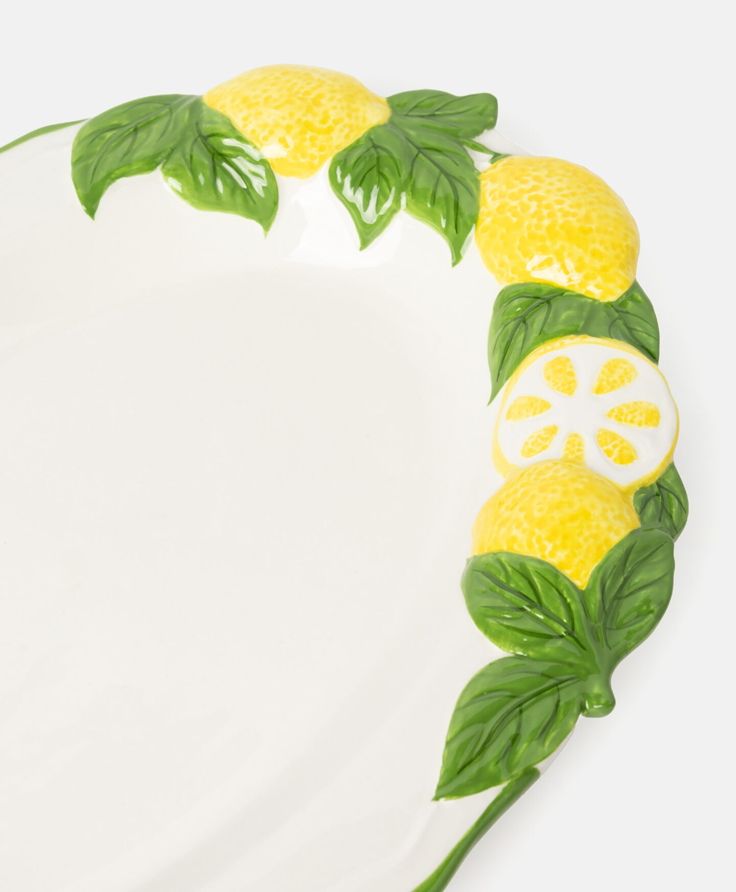 O prato de servir em dolomite, com limões em relevo, cria uma mesa de verão. É resistente e durável, ideal para servir pratos de forma elegante.
