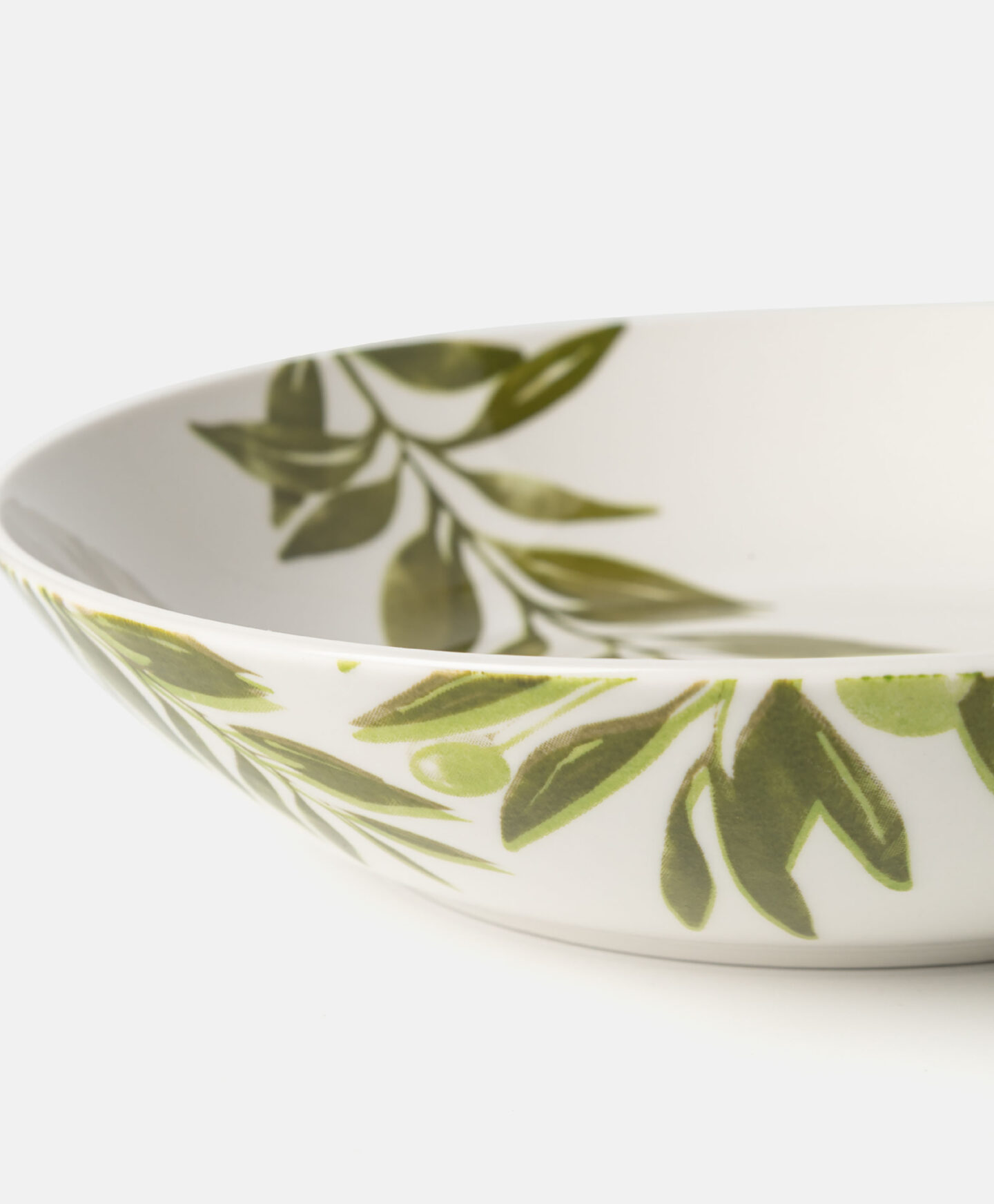 O prato fundo de porcelana, com padrão de ramos de oliveira, será a escolha perfeita para uma mesa de primavera. É durável, fácil de limpar e resistente a riscos. O padrão subtil inspirado na natureza mediterrânica dá-lhe um carácter único. Ideal para servir sopas, cremes, massas e estufados.