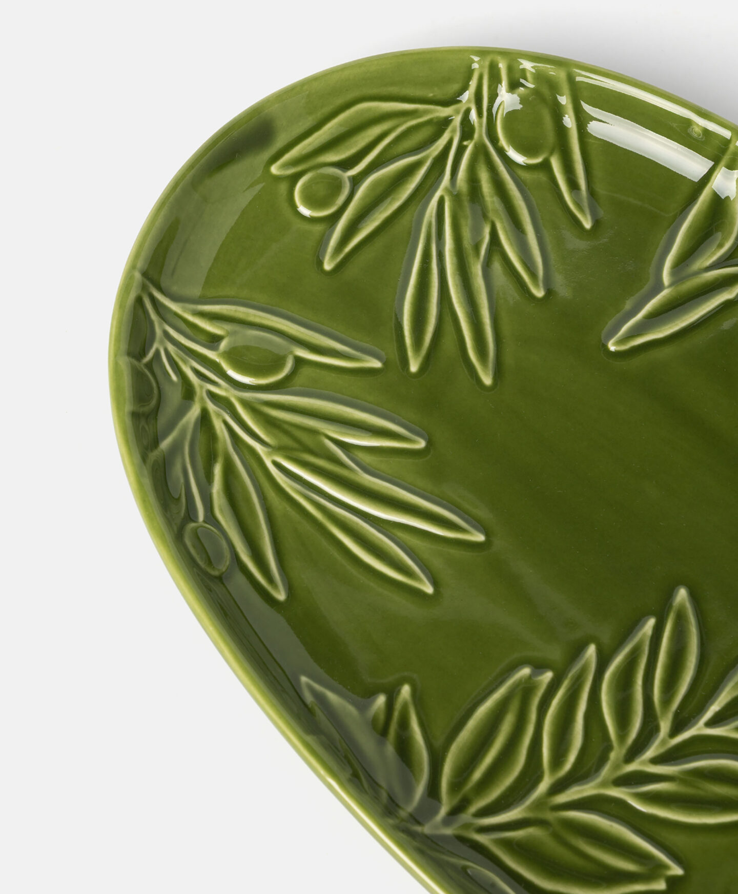 O prato oval de cerâmica destaca-se pelo bonito tom de verde e pela decoração em relevo de ramos de oliveira. O material é durável e resistente a impactos e altas temperaturas – ideal para servir as tuas refeições todos os dias. Descobre mais louça em estilo mediterrâneo na nova coleção!