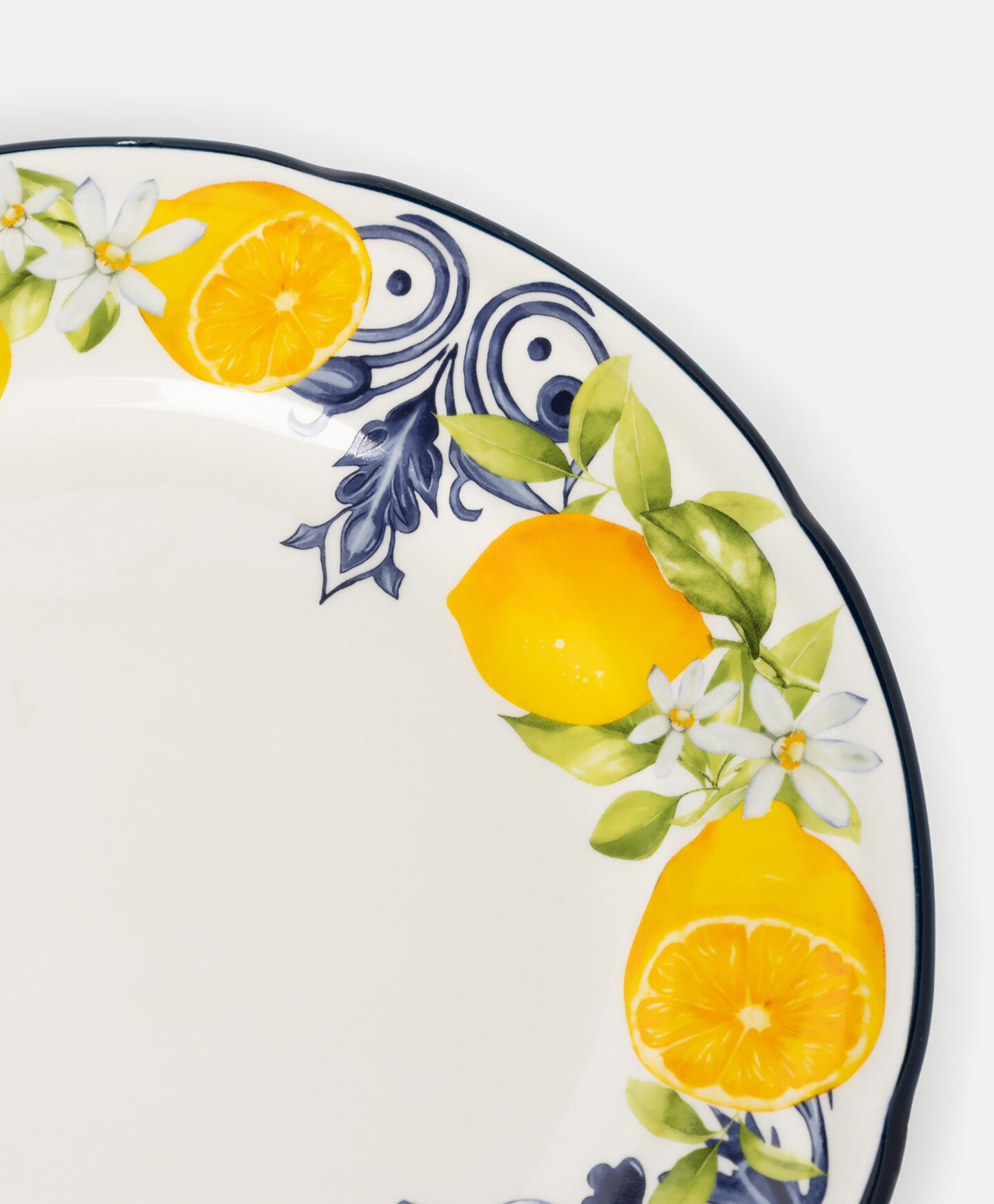 O prato raso em grés com limões é durável, fácil de limpar e resistente a riscos. O padrão vibrante, inspirado na natureza mediterrânica, dá-lhe um carácter único, sendo funcional e decorativo.
