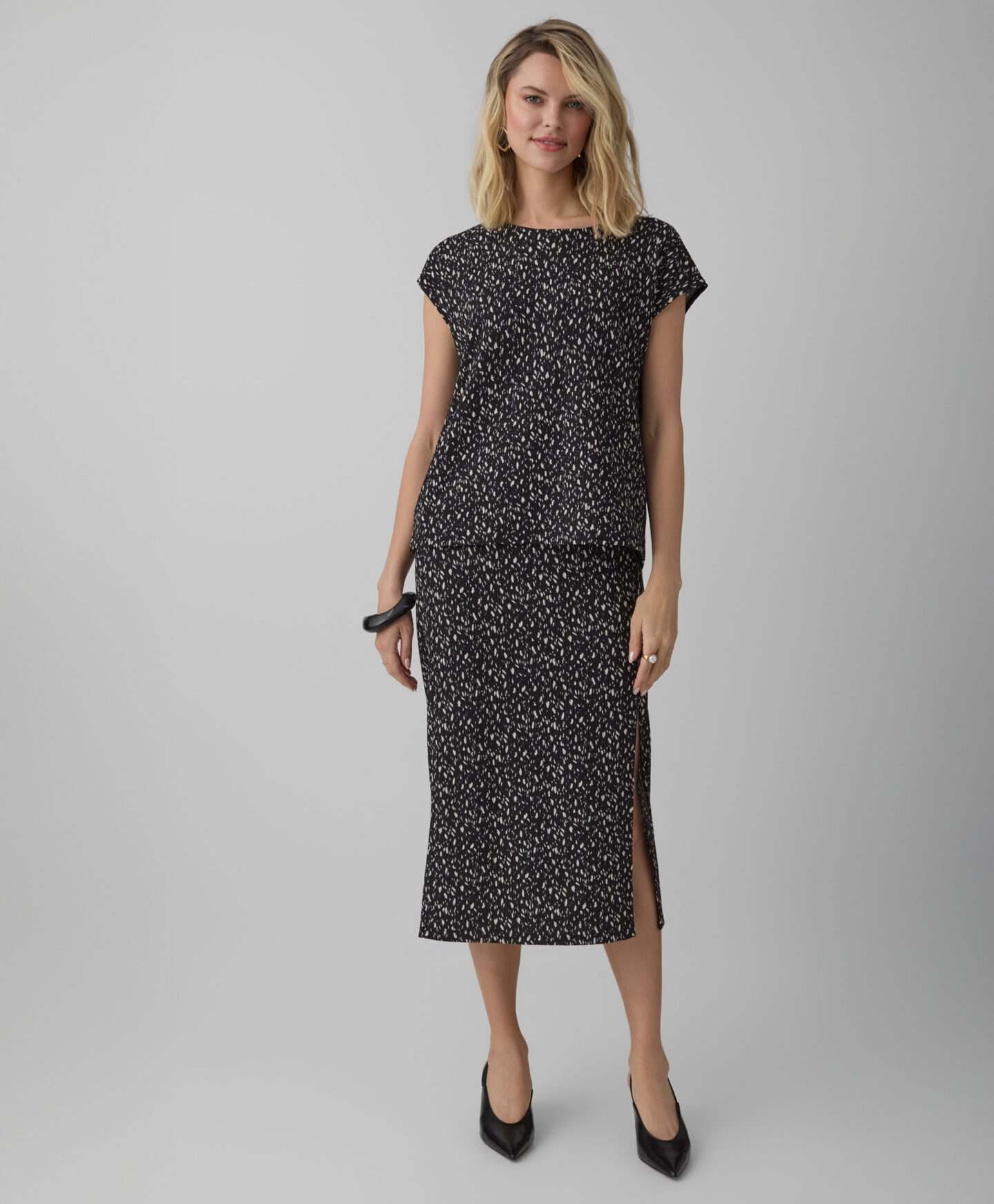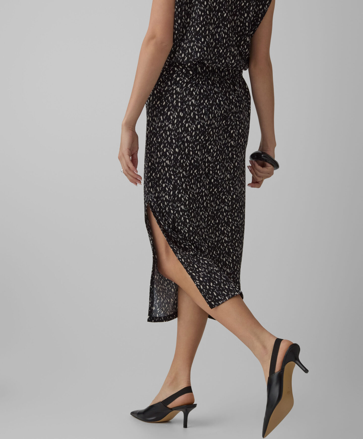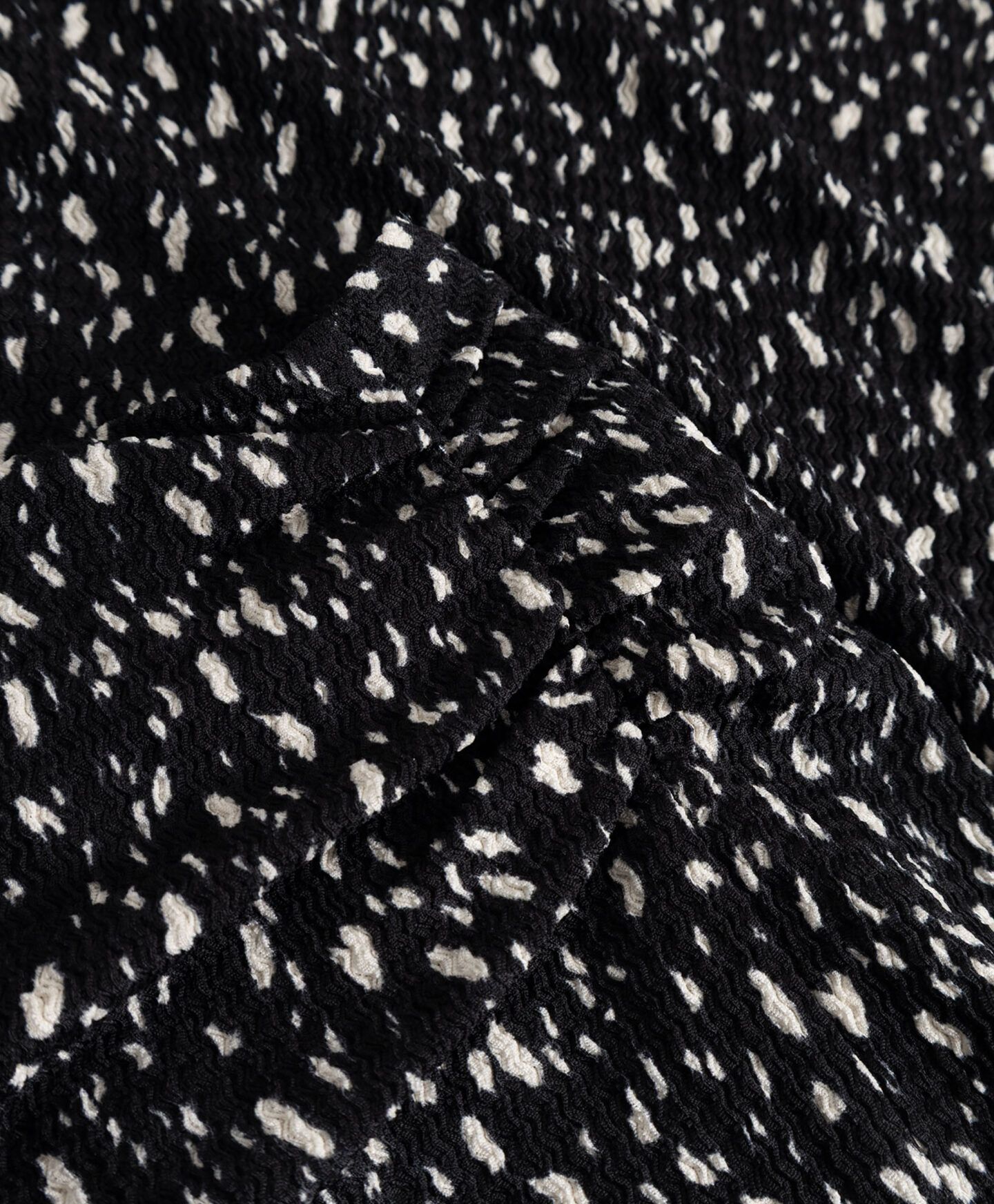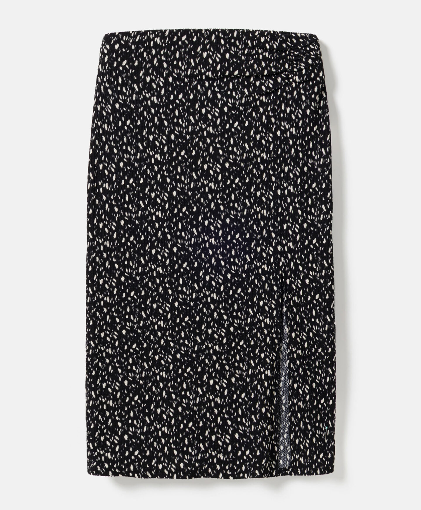 A saia com padrão faz conjunto com a camisola de manga curta da coleção. O seu padrão irregular chama a atenção e vai fazê-la sobressair no teu guarda-roupa. A racha vai enfatizar os teus atributos e criar uma ilusão de umas pernas mais longas. A saia é muito leve, suave ao toque e resistente às lavagens.