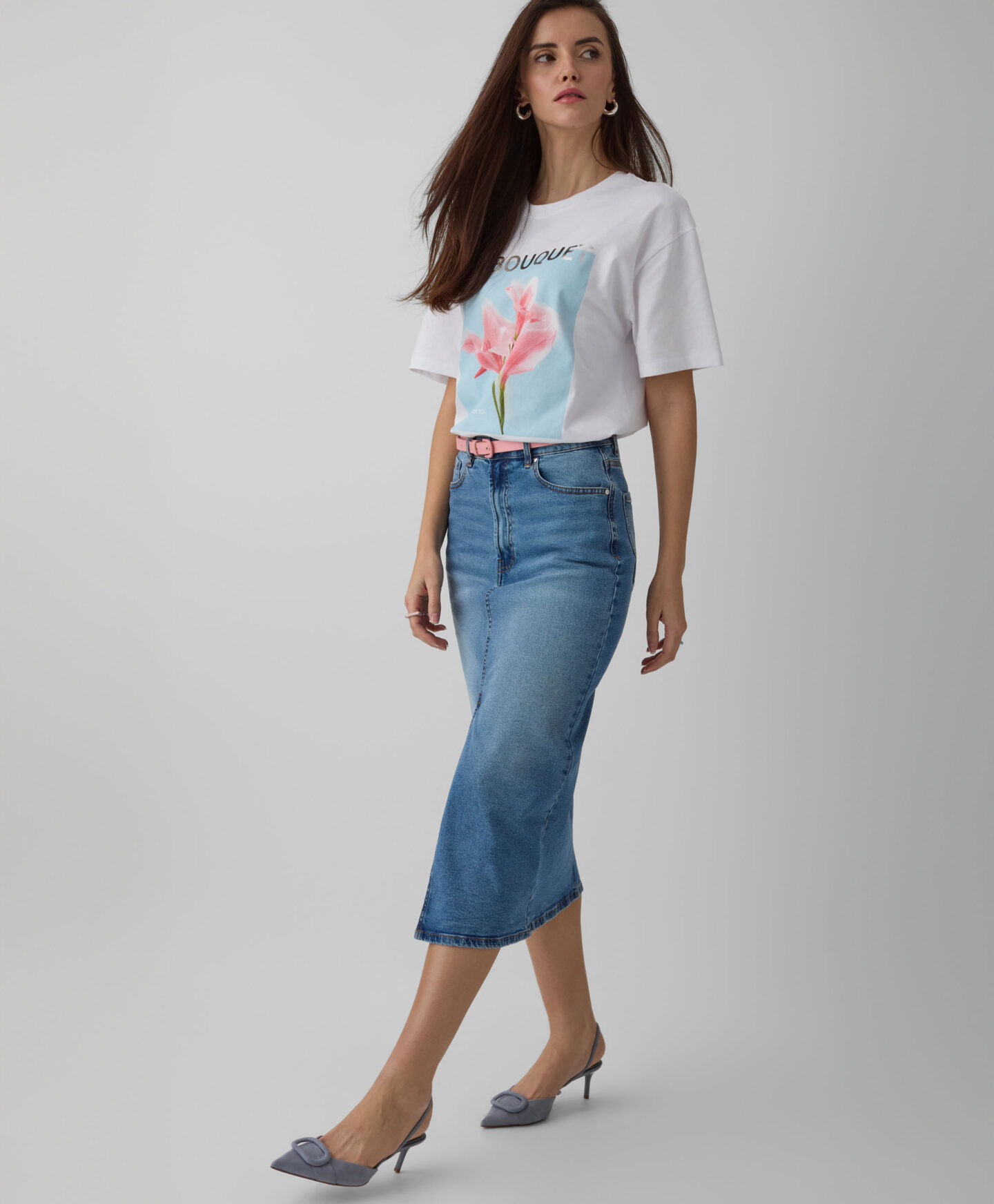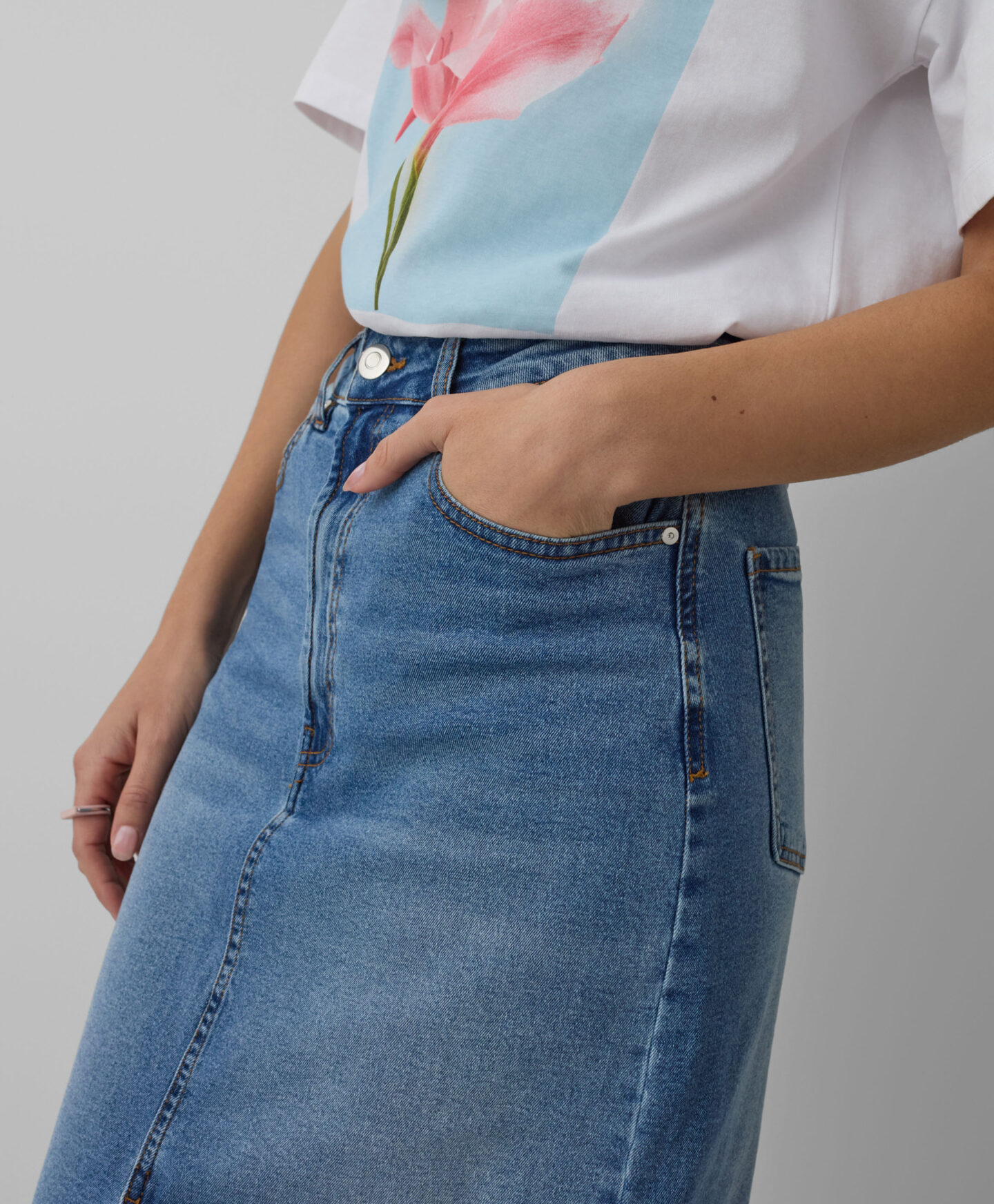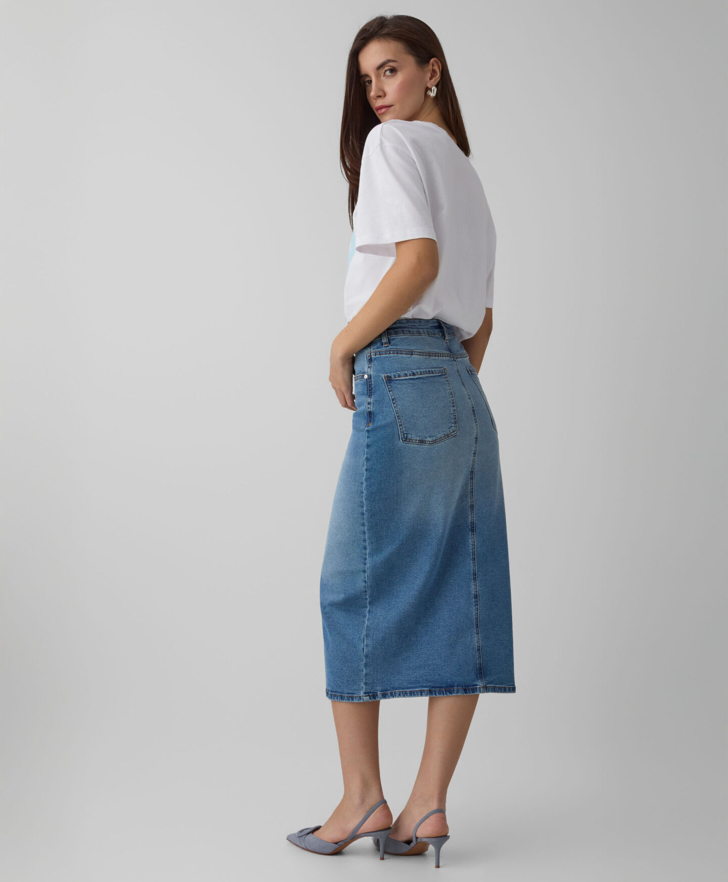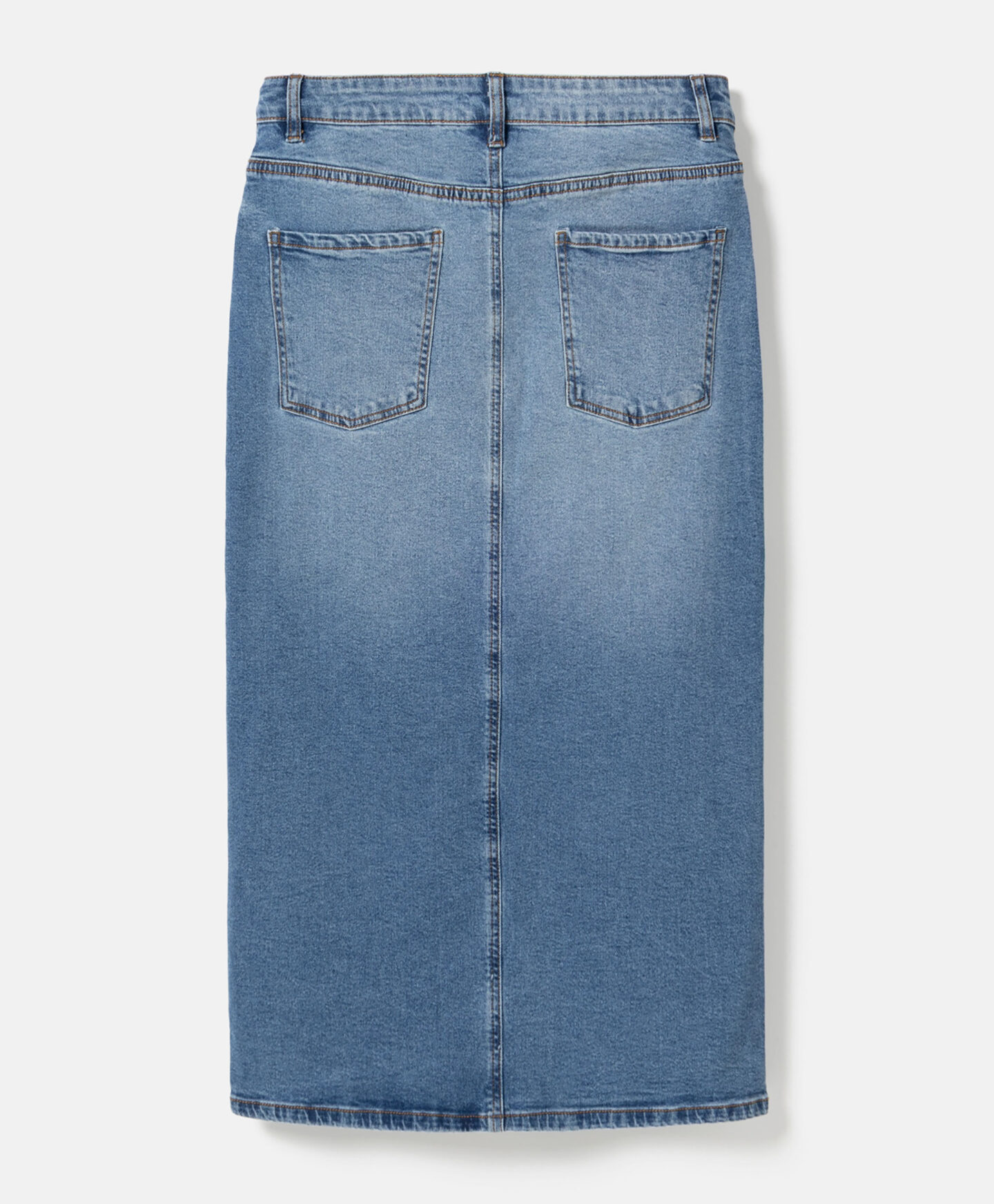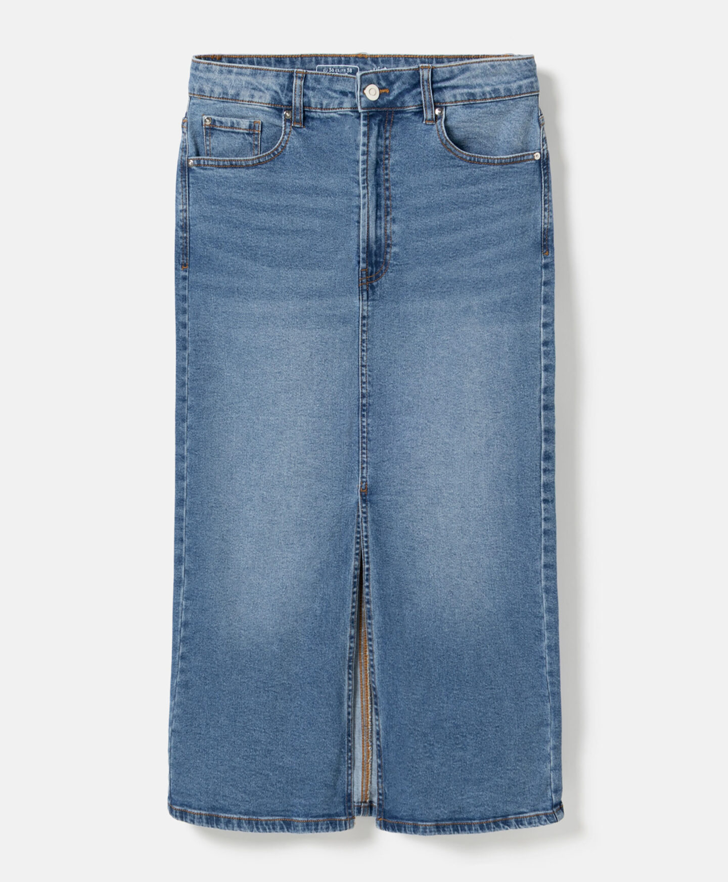 A saia de ganga com racha frontal vai assentar lindamente na tua silhueta. A ganga intemporal vai ficar incrível com T-shirts básicas ou camisolas elegantes. Oferece também liberdade de seleção de calçado – podes escolher ténis para um look casual ou uns saltos altos para um look com mais estilo. O seu comprimento de meia perna torna a saia ideal para qualquer ocasião.