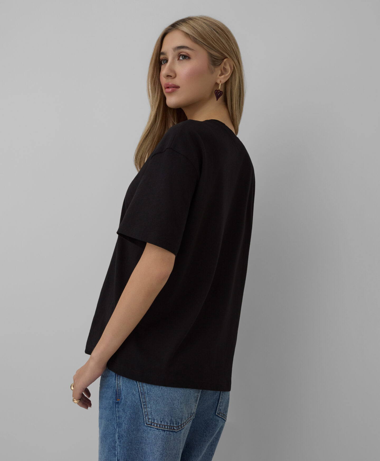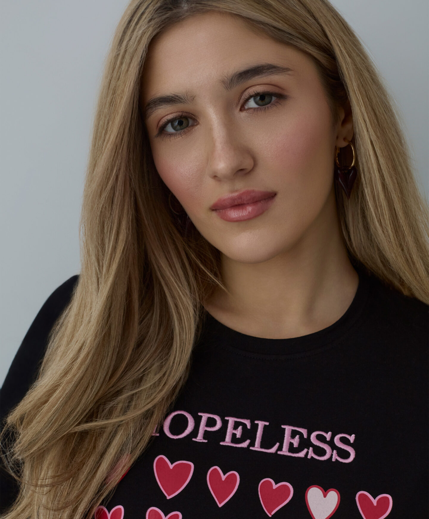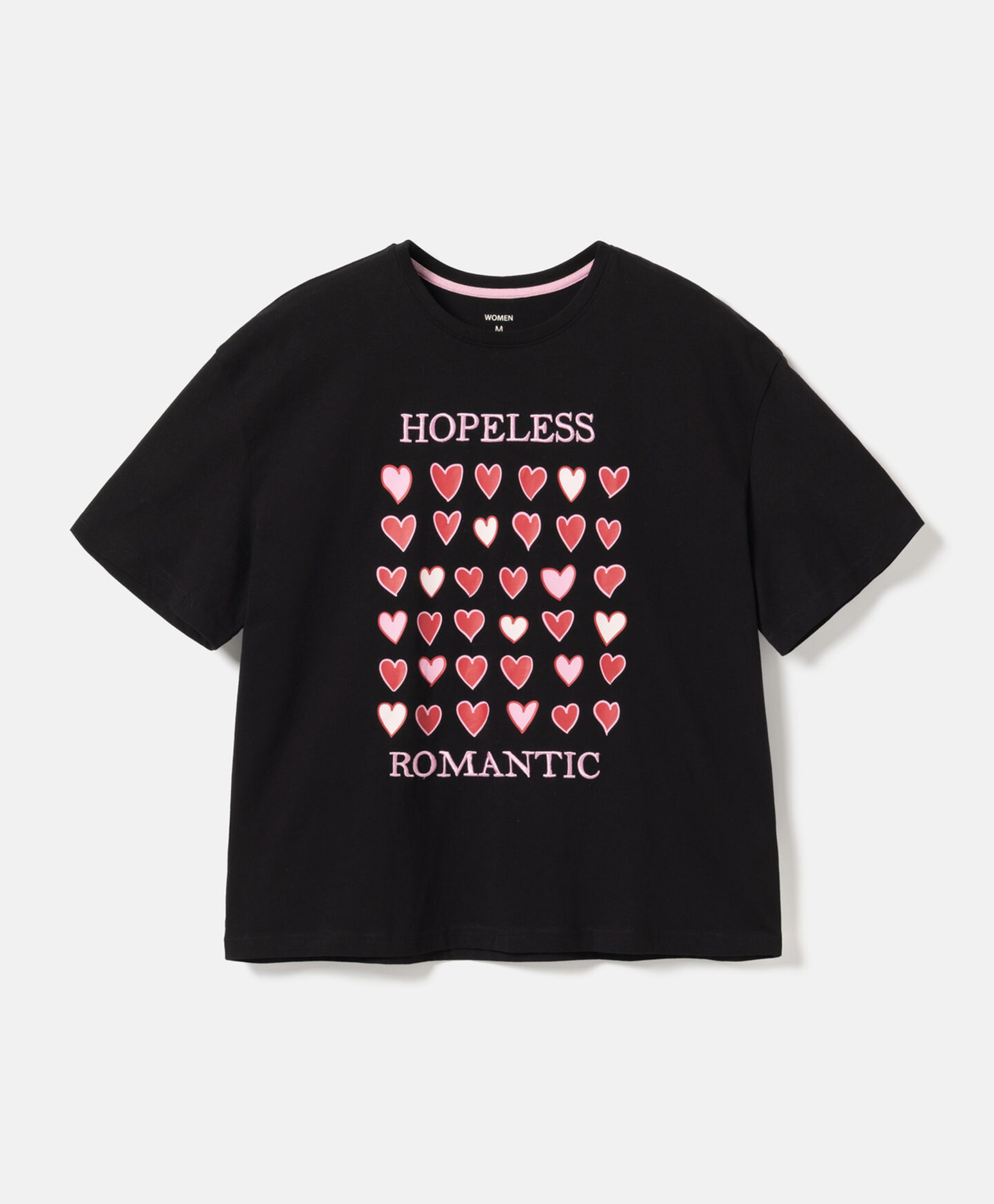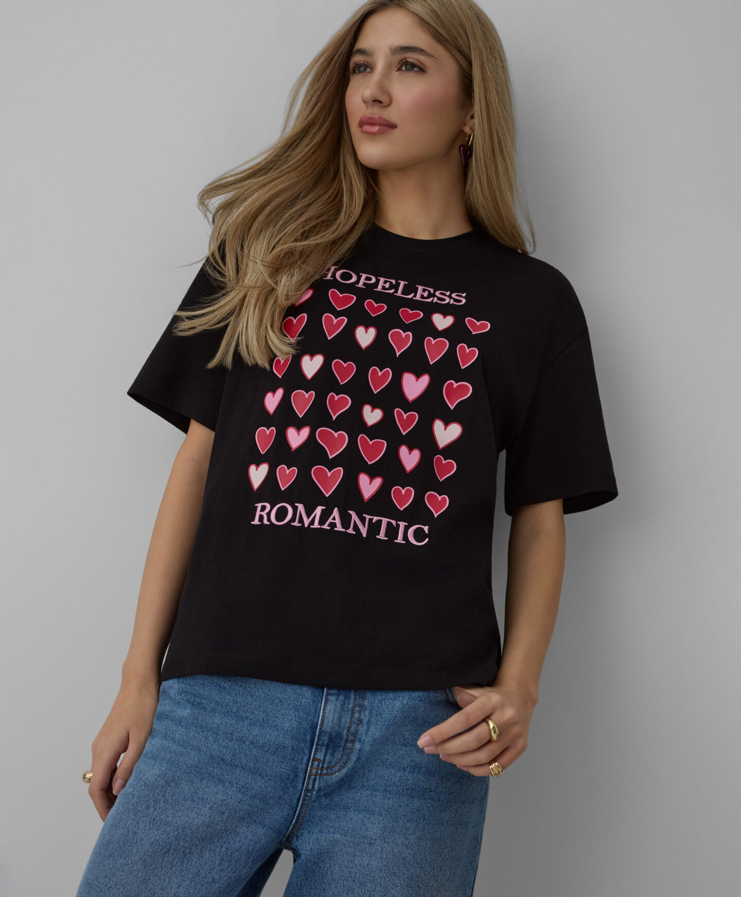 A t-shirt com estampado de corações, em 100% algodão, é ideal para quem aprecia um estilo clássico. O padrão delicado acrescenta charme a qualquer look. É leve, macia ao toque e suave para a pele.