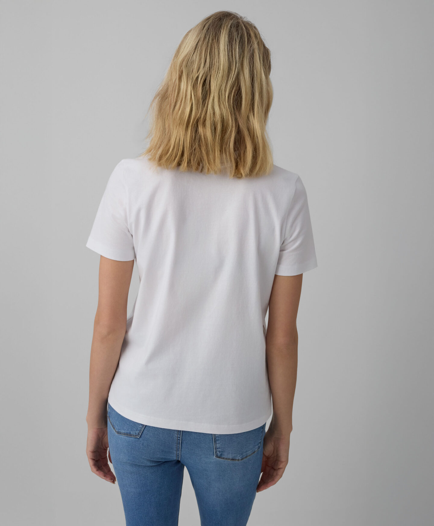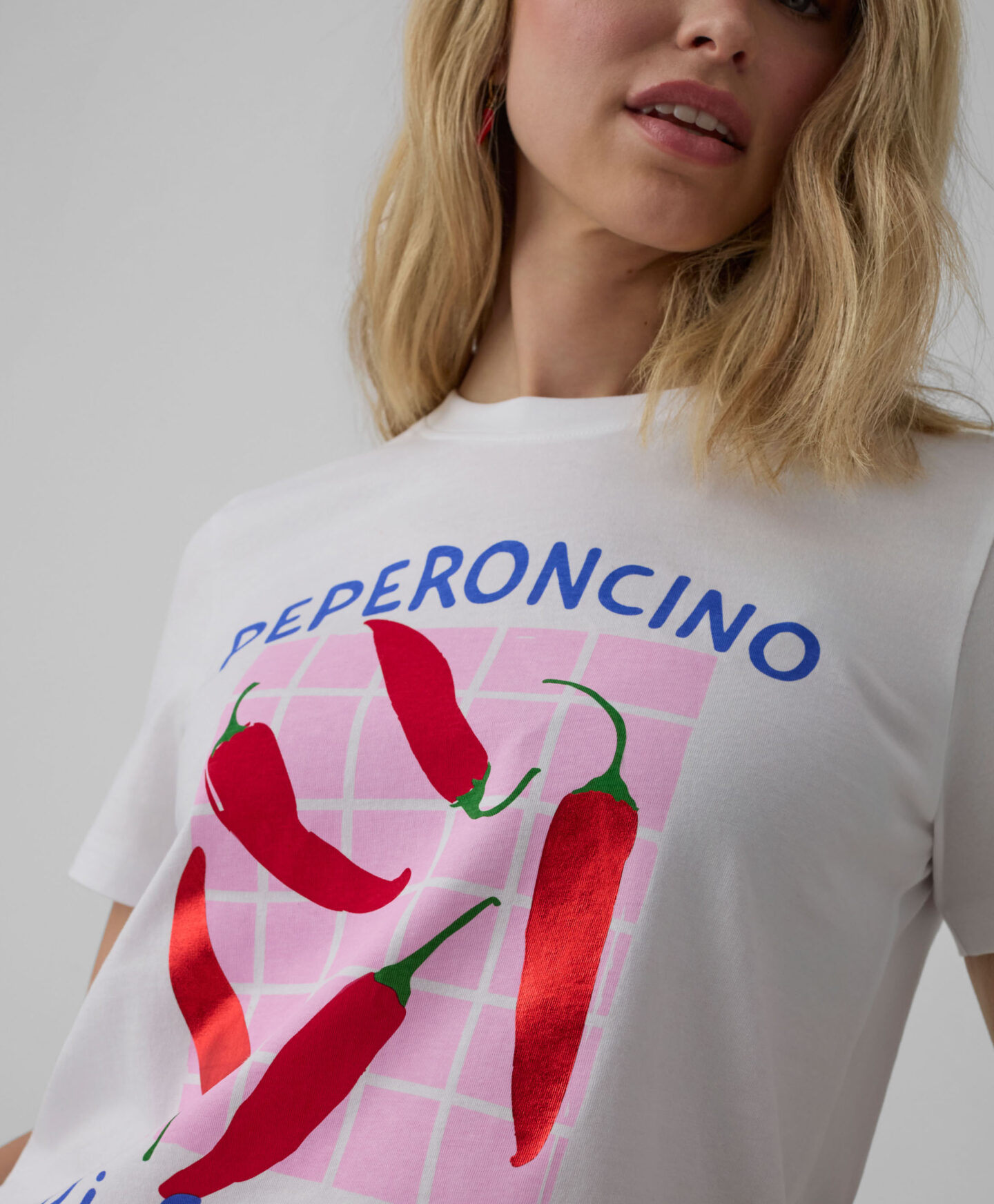 A t-shirt 100% algodão com estampado de pimento vai chamar a atenção. O material leve e respirável é ideal para a usares sozinha ou em conjuntos com camadas. Coloca uma blusa, camisola ou casaco de ganga por cima da t-shirt e cria os melhores conjuntos para todas as ocasiões.