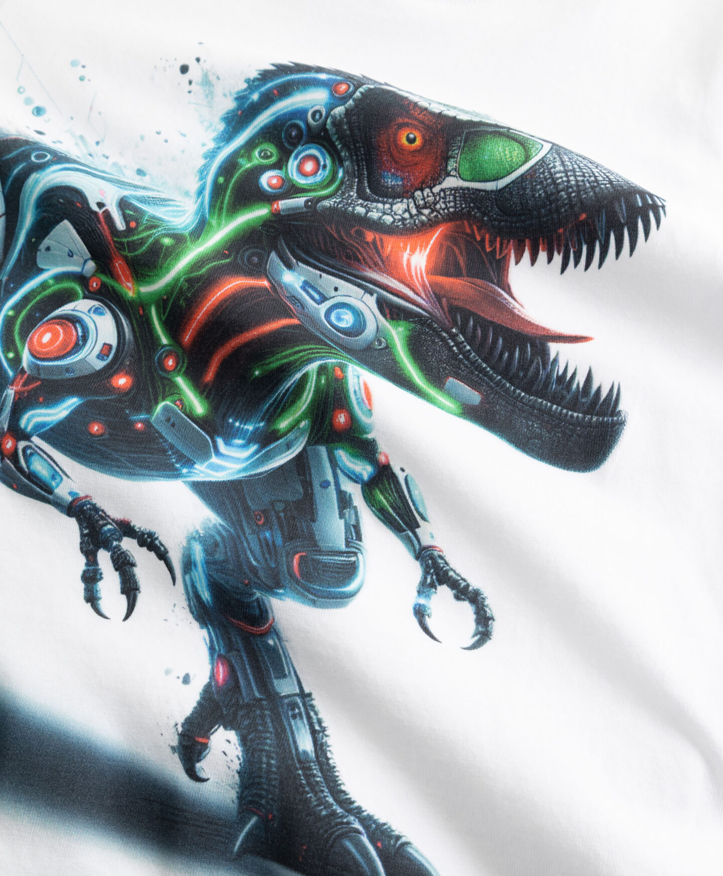 A t-shirt em 100% algodão, com estampado de dinossauro, é a energia que as brincadeiras precisam. Funciona bem em looks com camadas, combinada com uma camisola, ou usada sozinha em dias mais quentes. O material respirável é agradável para a pele sensível, garantindo conforto total. Combina com jeans ou calças de fato de treino