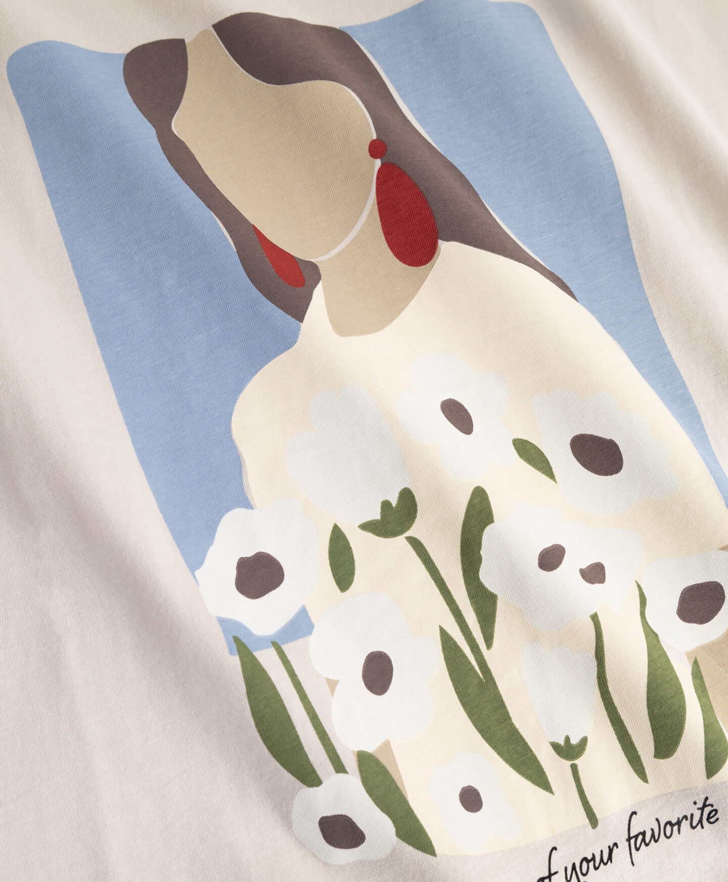 A t-shirt em 100% algodão, com estampado, traz um toque fresco ao teu guarda-roupa. Combinada com calças de ganga clássicas, cria um conjunto versátil perfeito para encontros com amigos, compras do dia a dia ou passear.