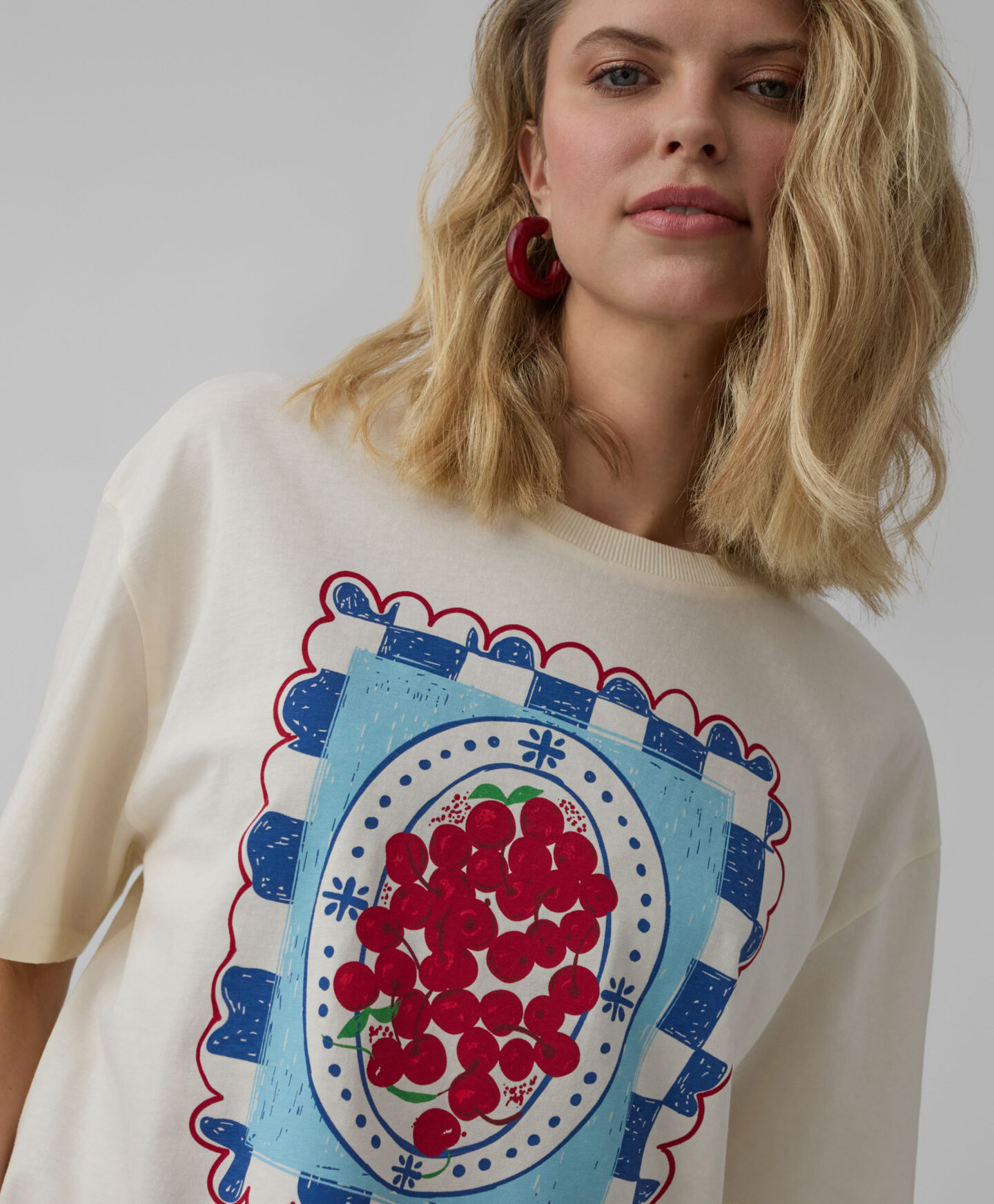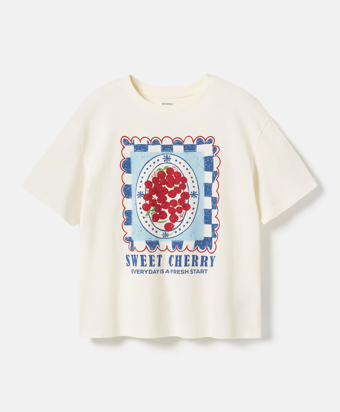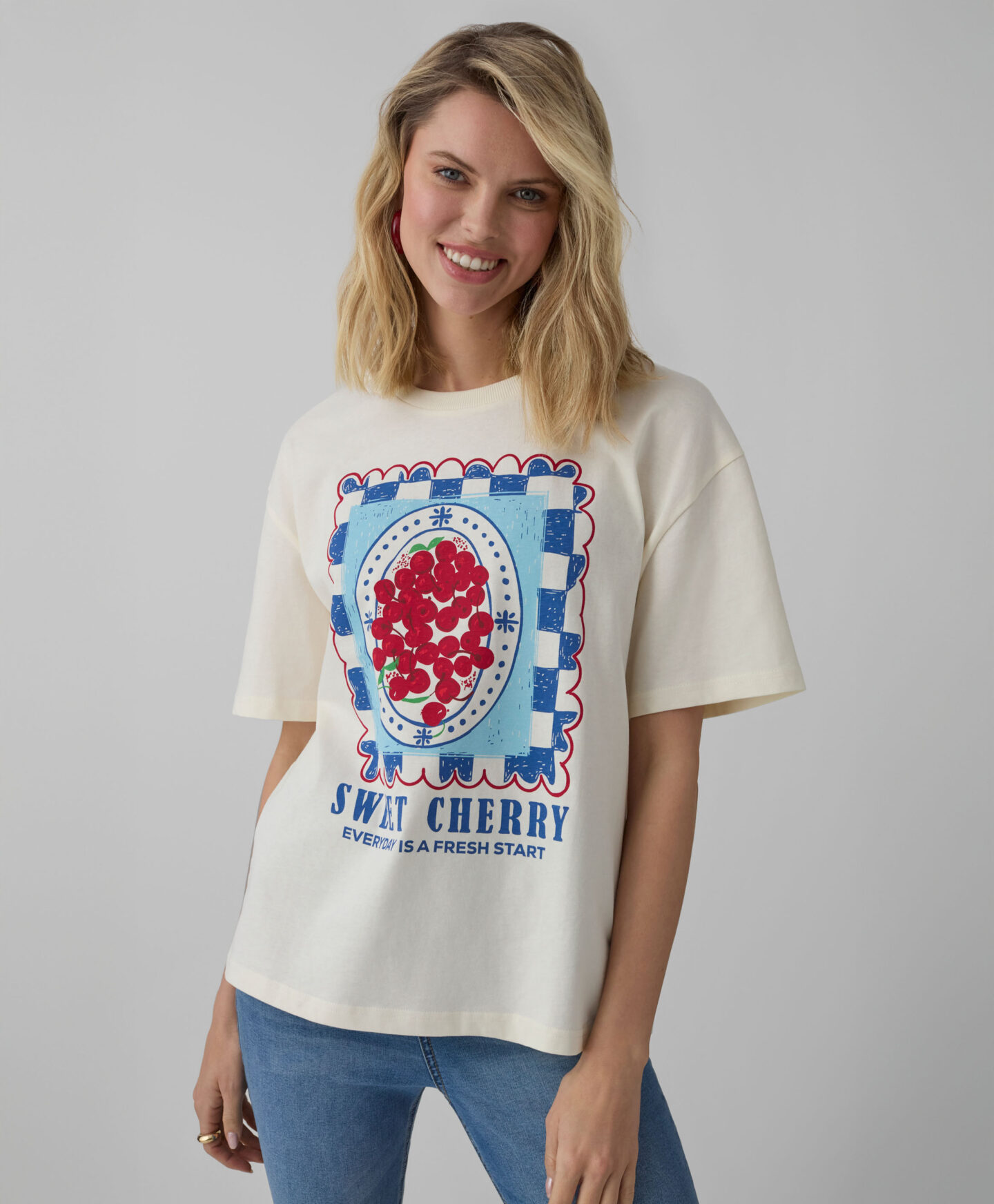 A t-shirt 100% algodão com um estampado de cereja é ideal para fãs de moda. O estampado chama a atenção e vai destacá-la das outras t-shirts. Combina-a com umas calças de ganga e cria um look ideal para todos os momentos do teu dia-a-dia.