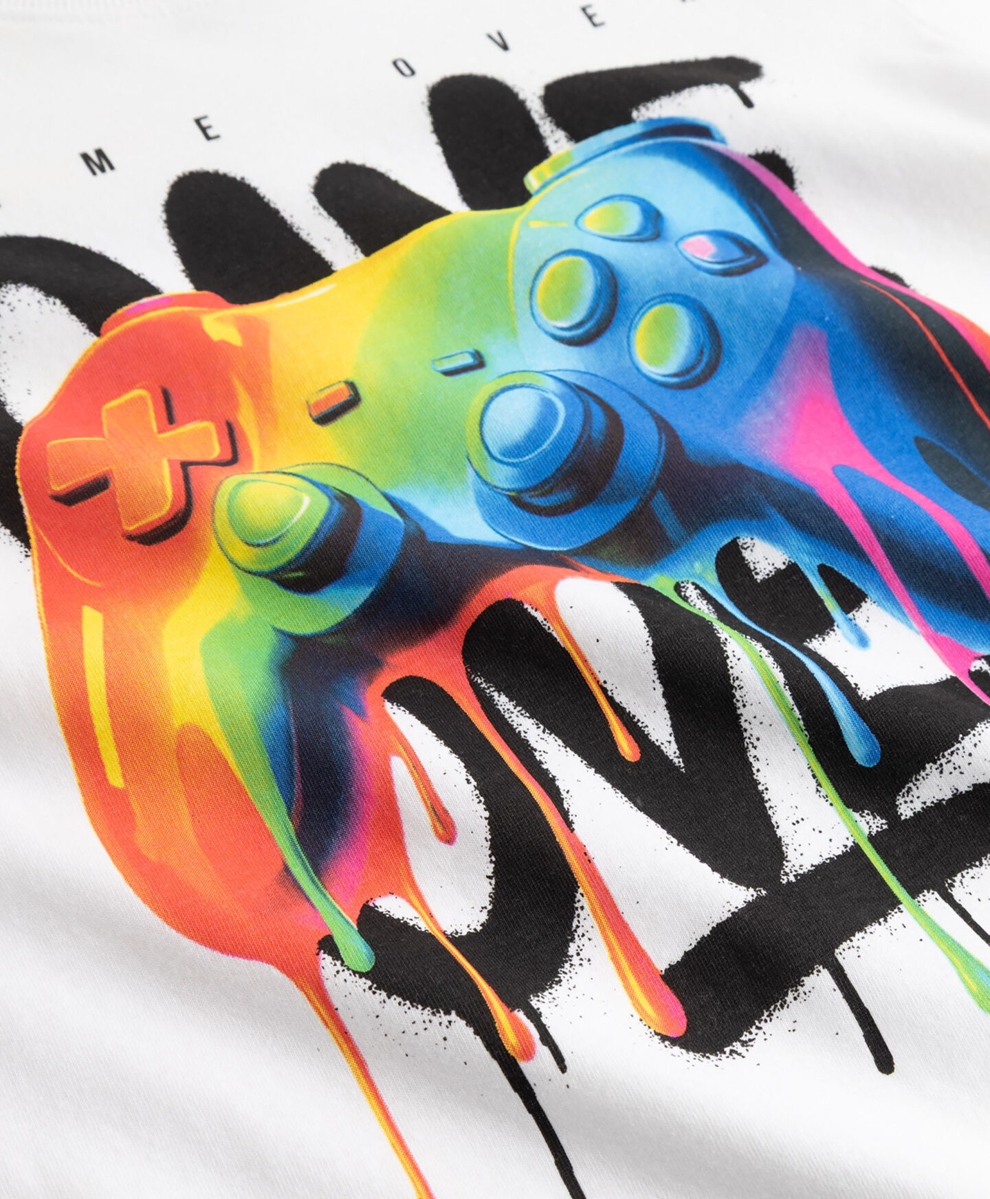 A t-shirt em 100% algodão, com estampado de graffiti, é a energia que as brincadeiras precisam. Funciona bem em looks com camadas, combinada com uma camisola, ou usada sozinha em dias mais quentes. O material respirável é agradável para a pele sensível, garantindo conforto total. Combina com jeans ou calças de fato de treino