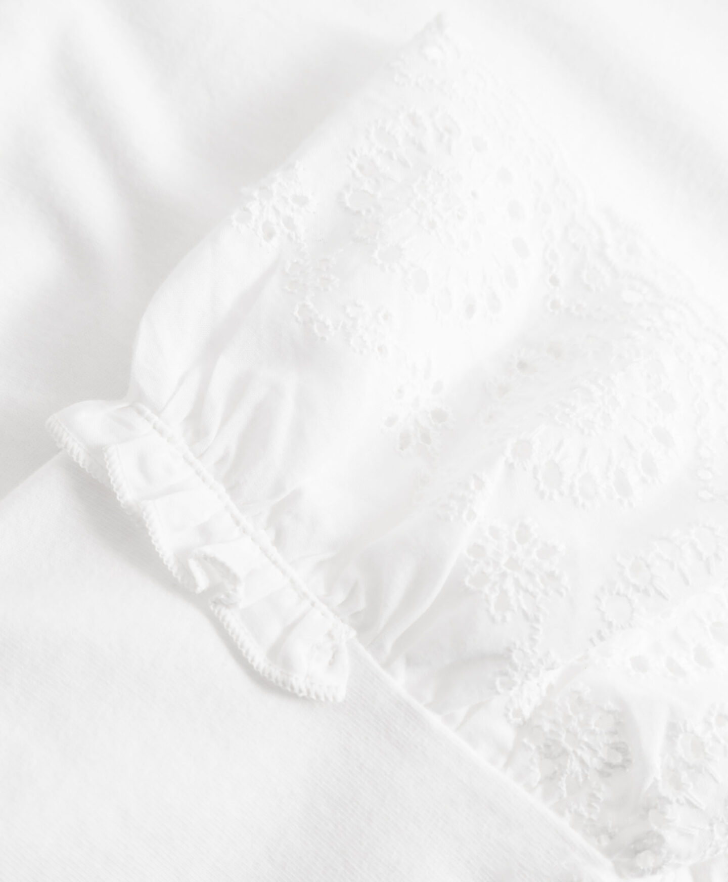 A t-shirt em 100% algodão encanta pelos detalhes. Possui delicados folhos que caem suavemente e acrescentam leveza ao look. Assim, fica perfeita tanto com jeans como com uma saia elegante. O corte mais solto permite brincar livremente sem restringir os movimentos. O material em algodão é respirável, macio e amigo até da pele mais sensível. Perfeita para o verão!