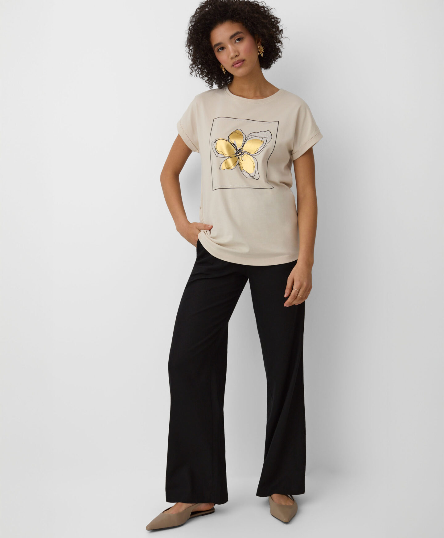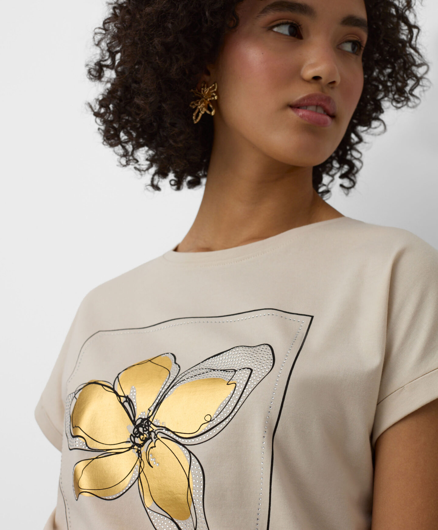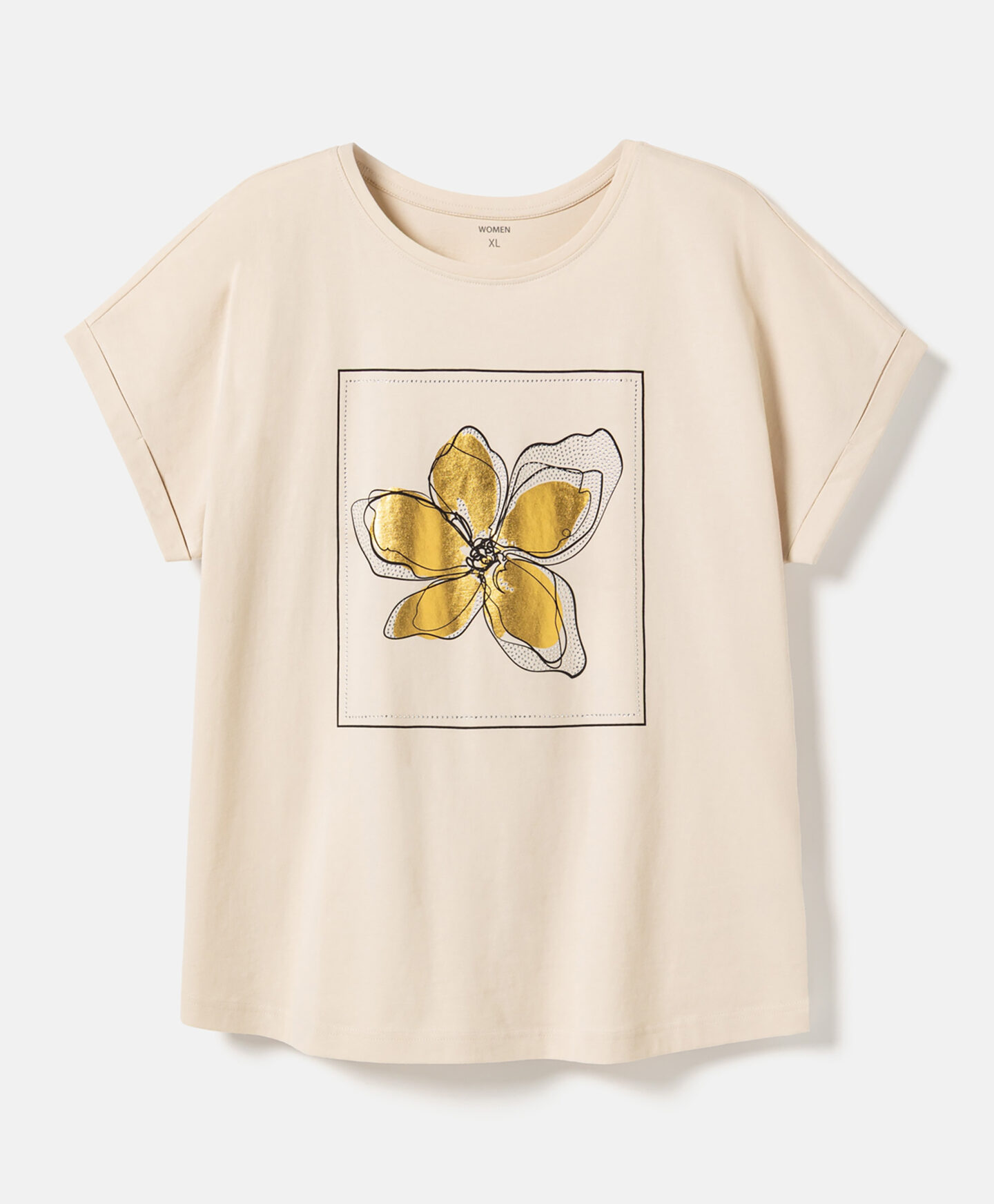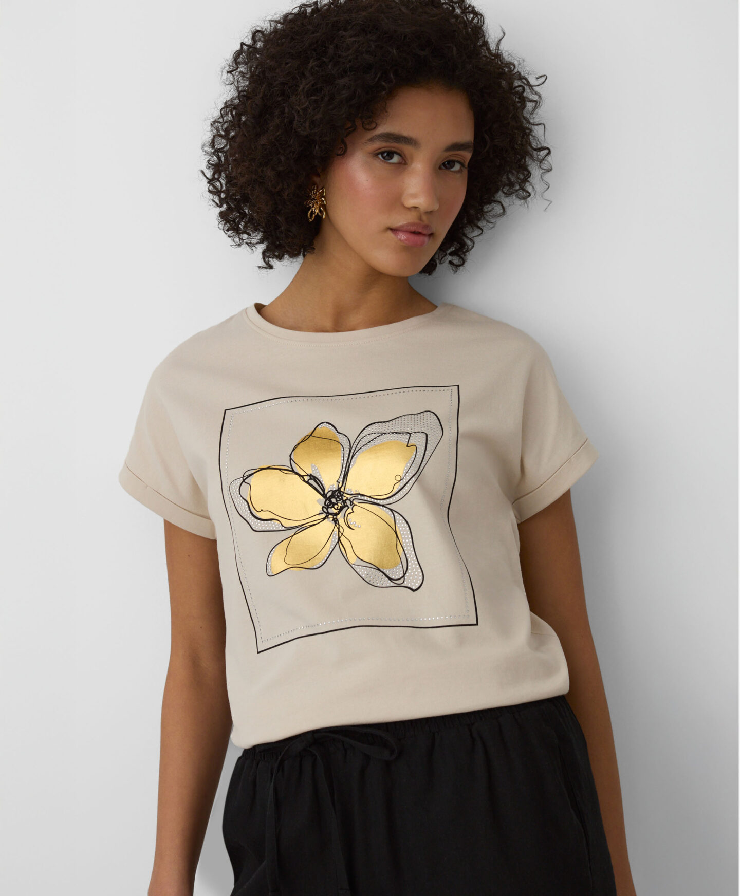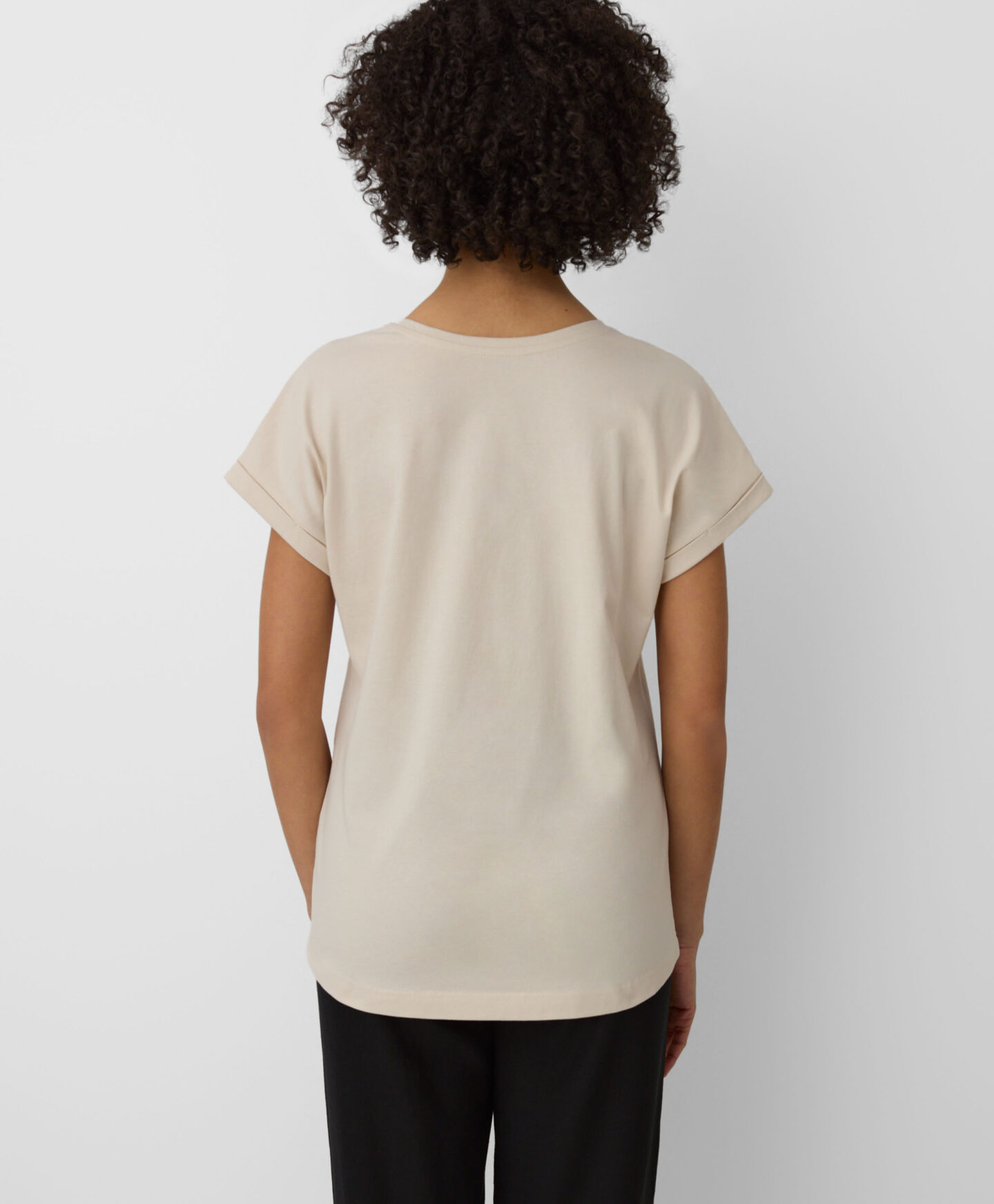 A t-shirt em 100% algodão será um destaque no teu guarda-roupa. É confortável, fresca e permite que a pele respire. Ideal para combinar com calças de ganga, de fato de treino ou elegantes estilo cigarette.